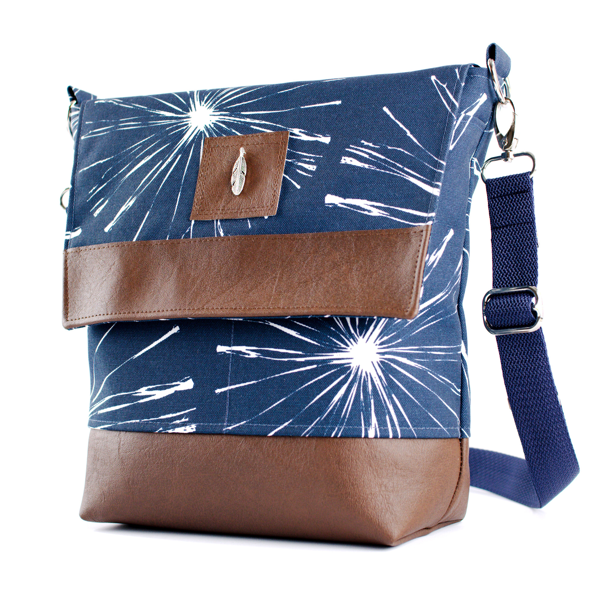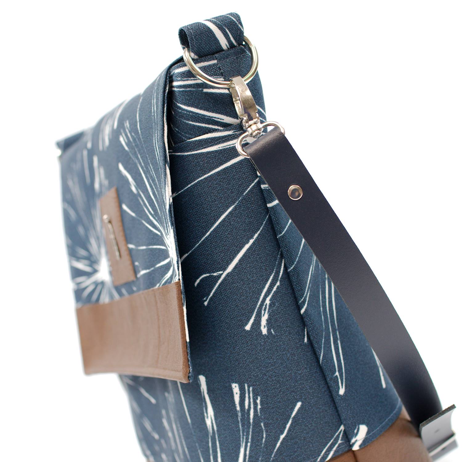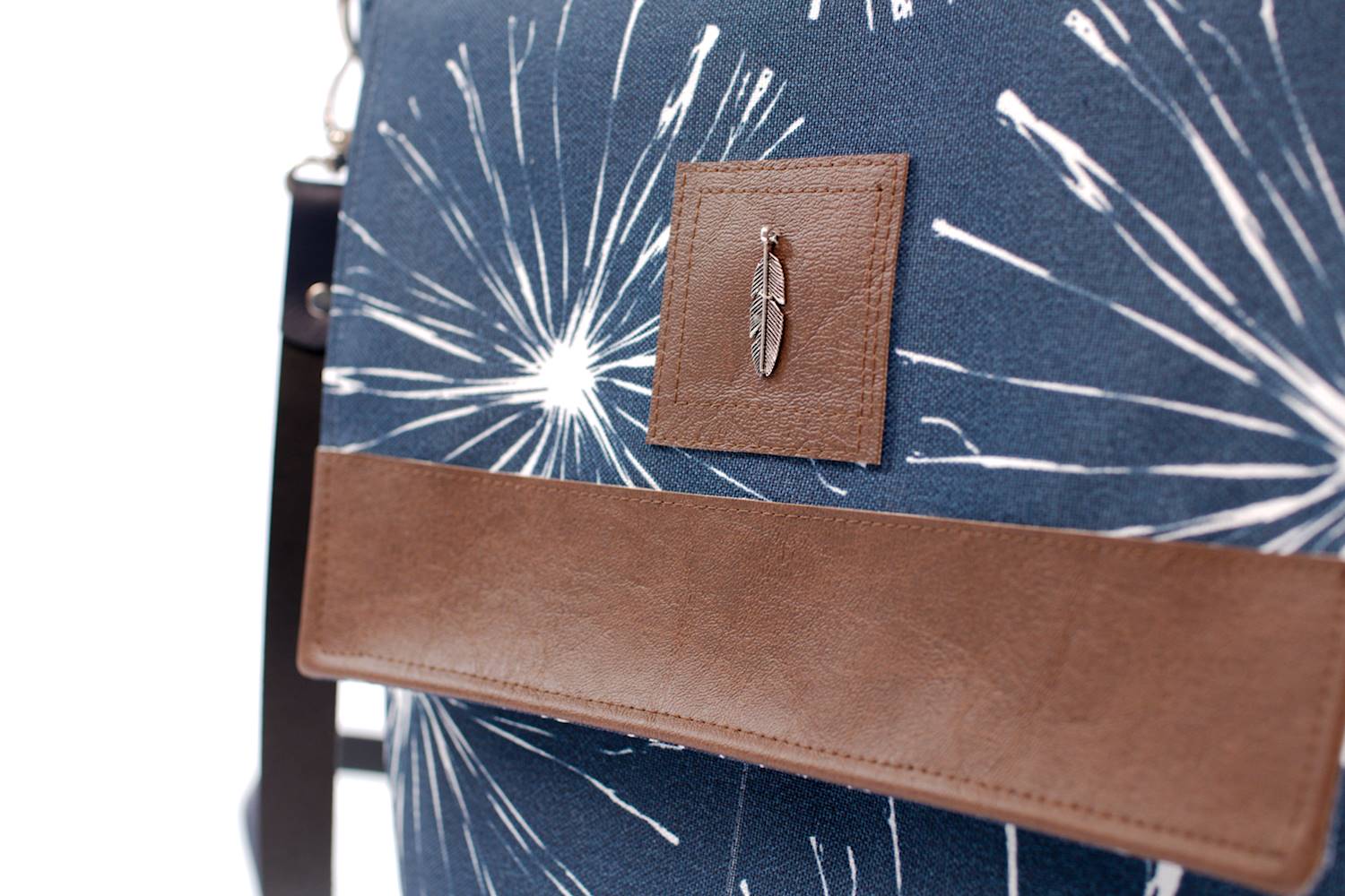 - große Taschenklappe mit dekorativem Streifen aus Kunstleder oder Kork, sowie einer Applikation mit Metall-Anhänger und Magnetverschluss
