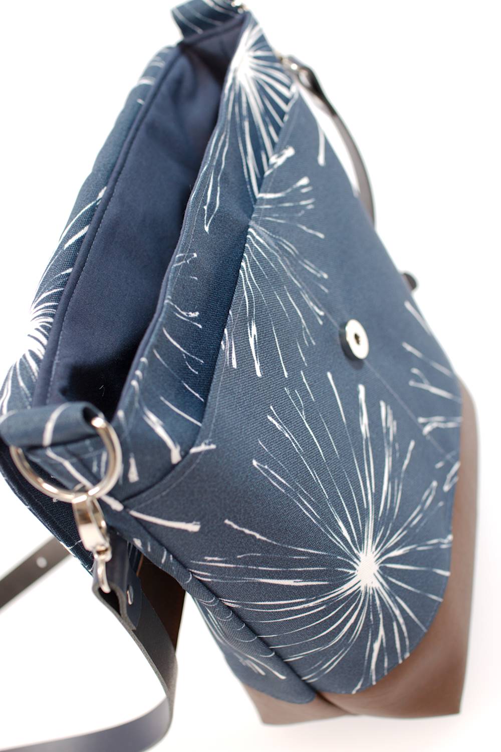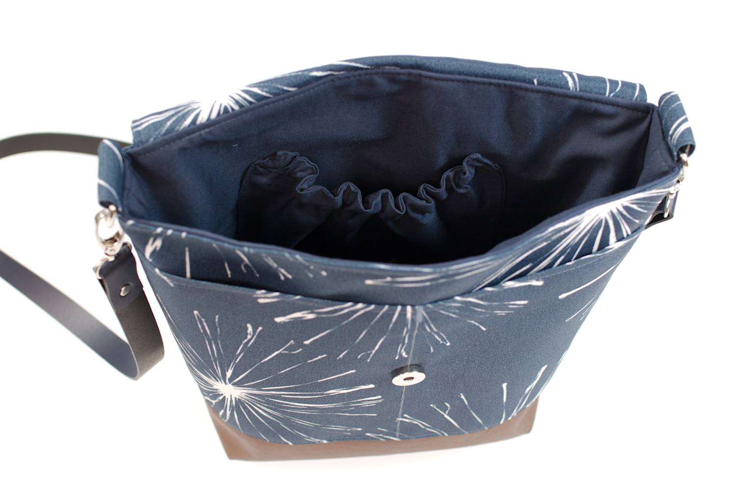 - Außen ein dunkelblauer Outdoorstoff mit großen Pusteblumen (wasser- und schmutzabweisender Stoff aus den USA, aufgrund der Motivgröße kann es zu Abbweichungen zur Abbildung kommen)