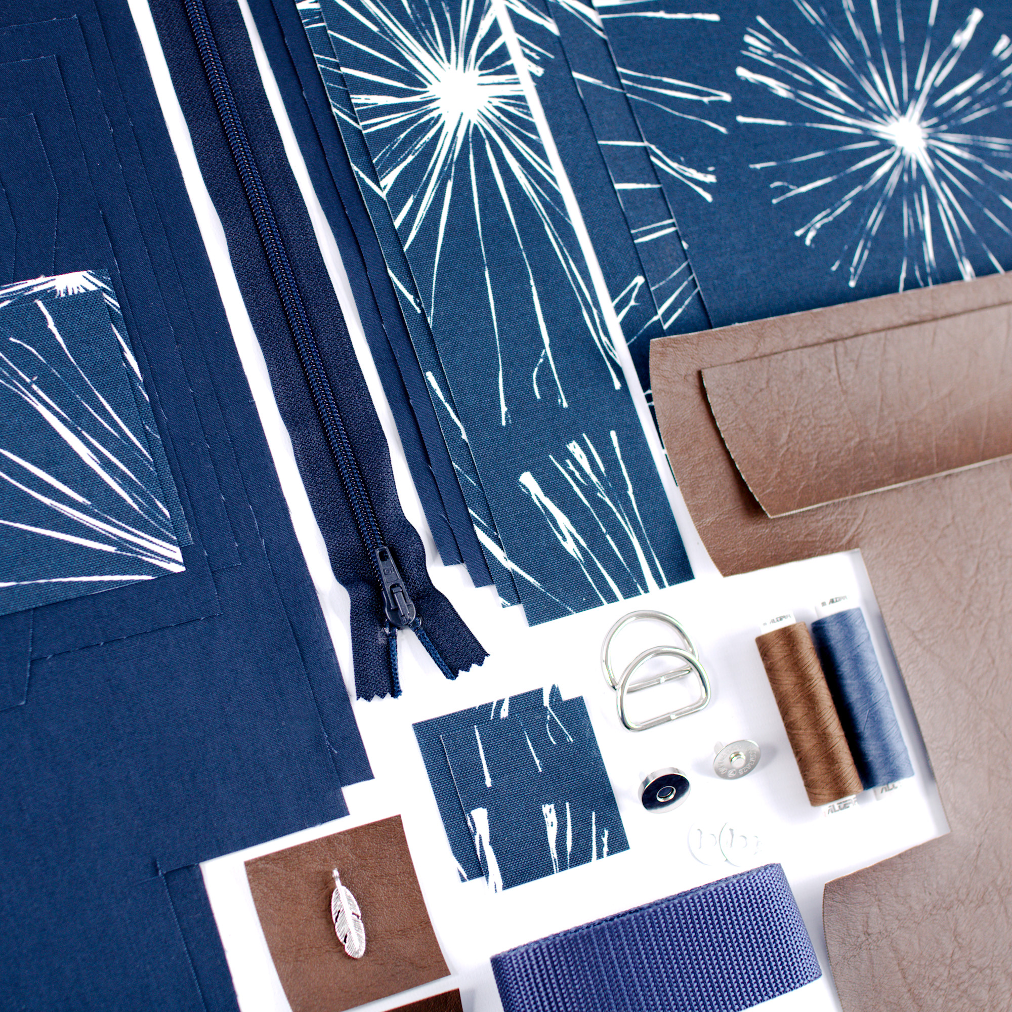 - Zusätzlicher Reißverschluss (um die Tasche unter der Klappe komplett zu schließen): Du bekommst ein extra Stoffpaket mit 6 Stoffteilen und einem Reißverschluss (Made in Germany).