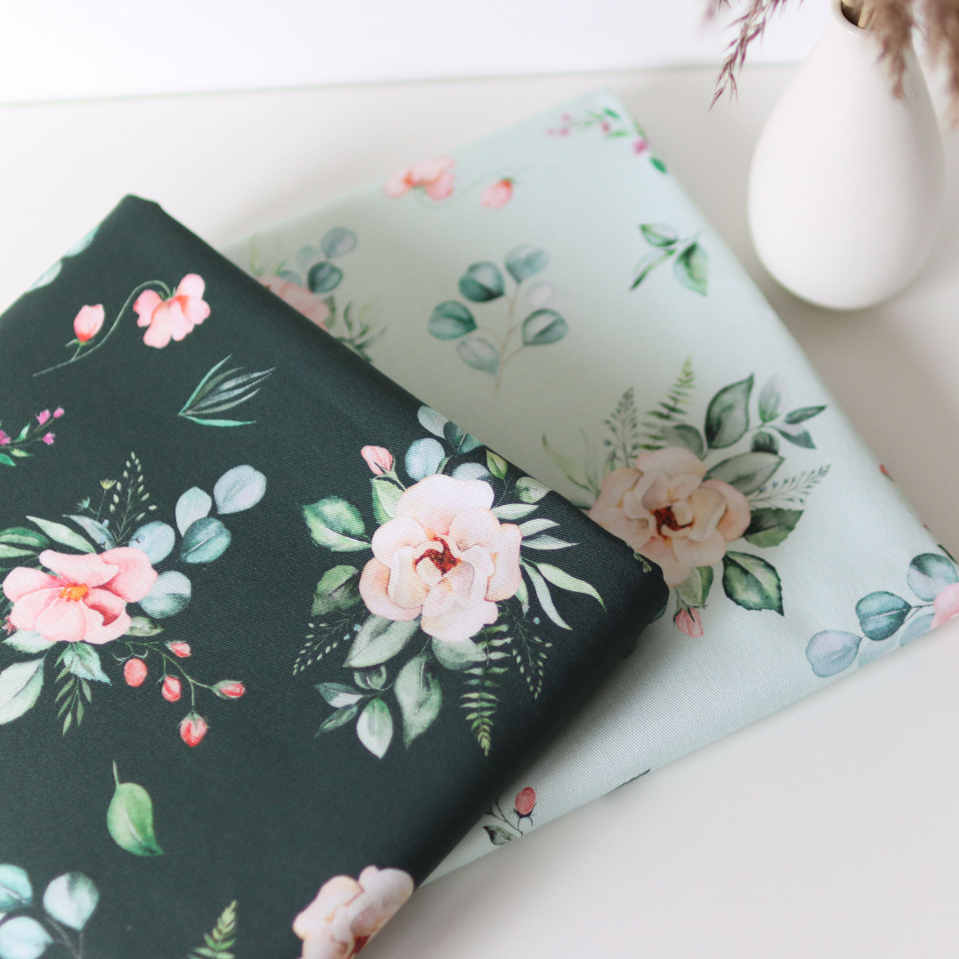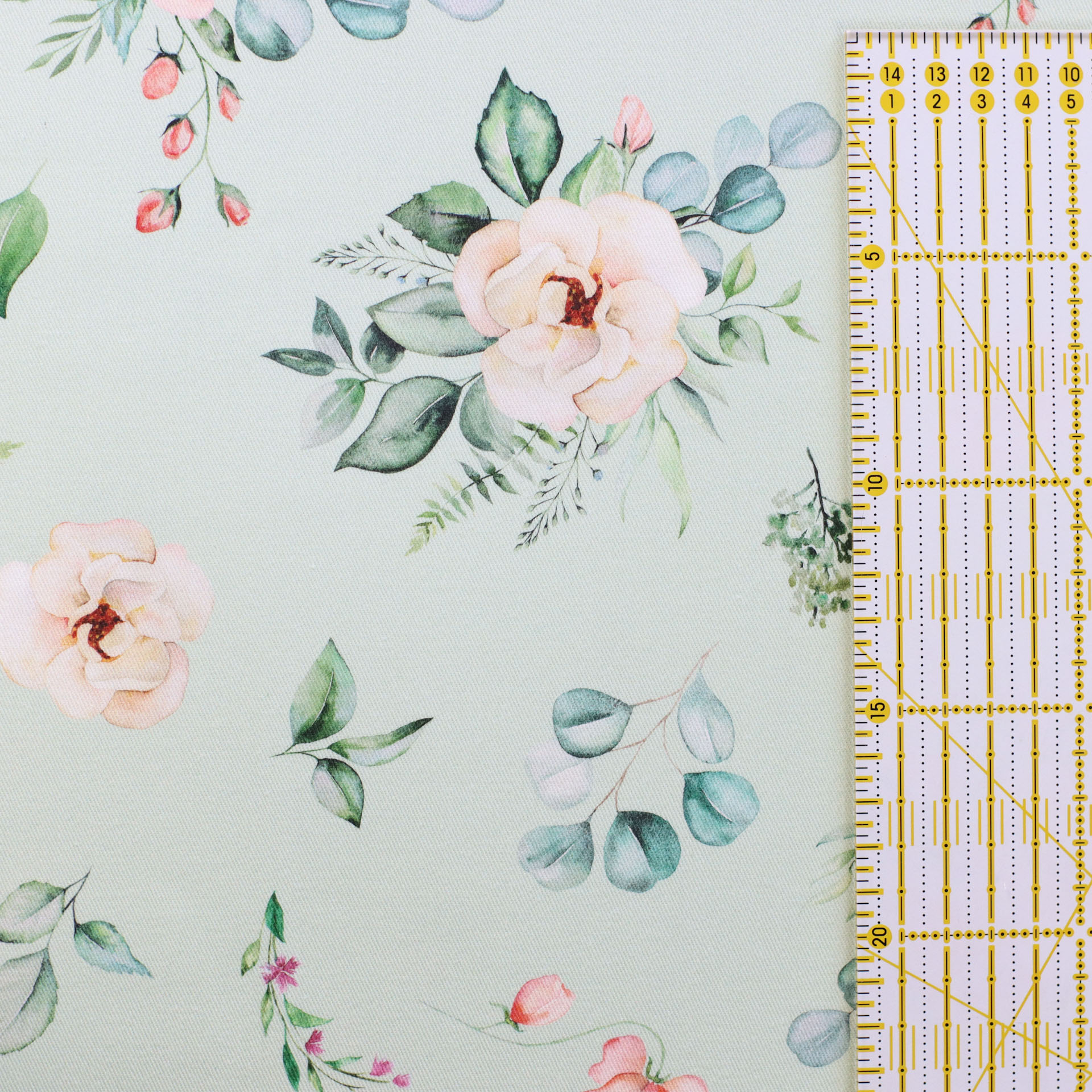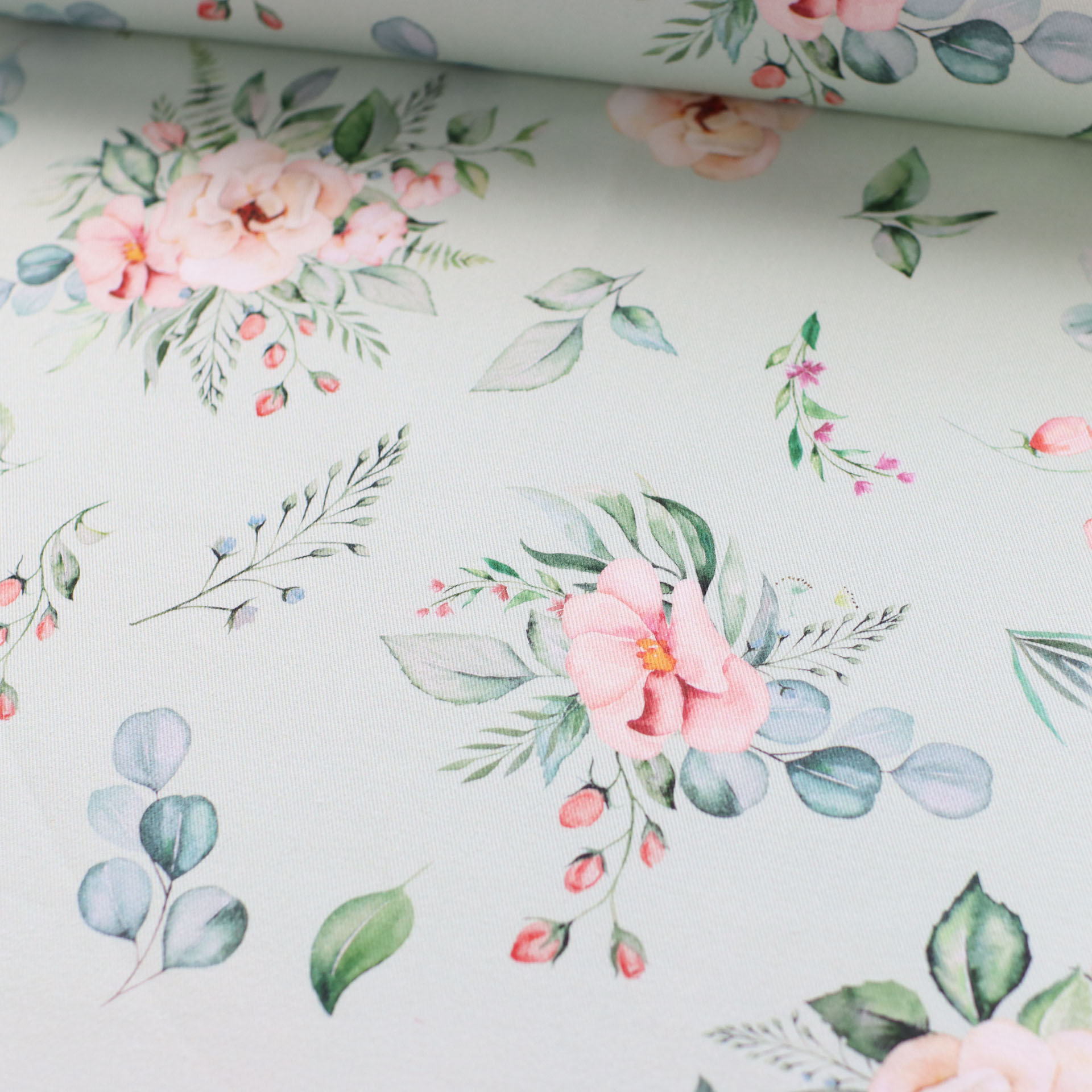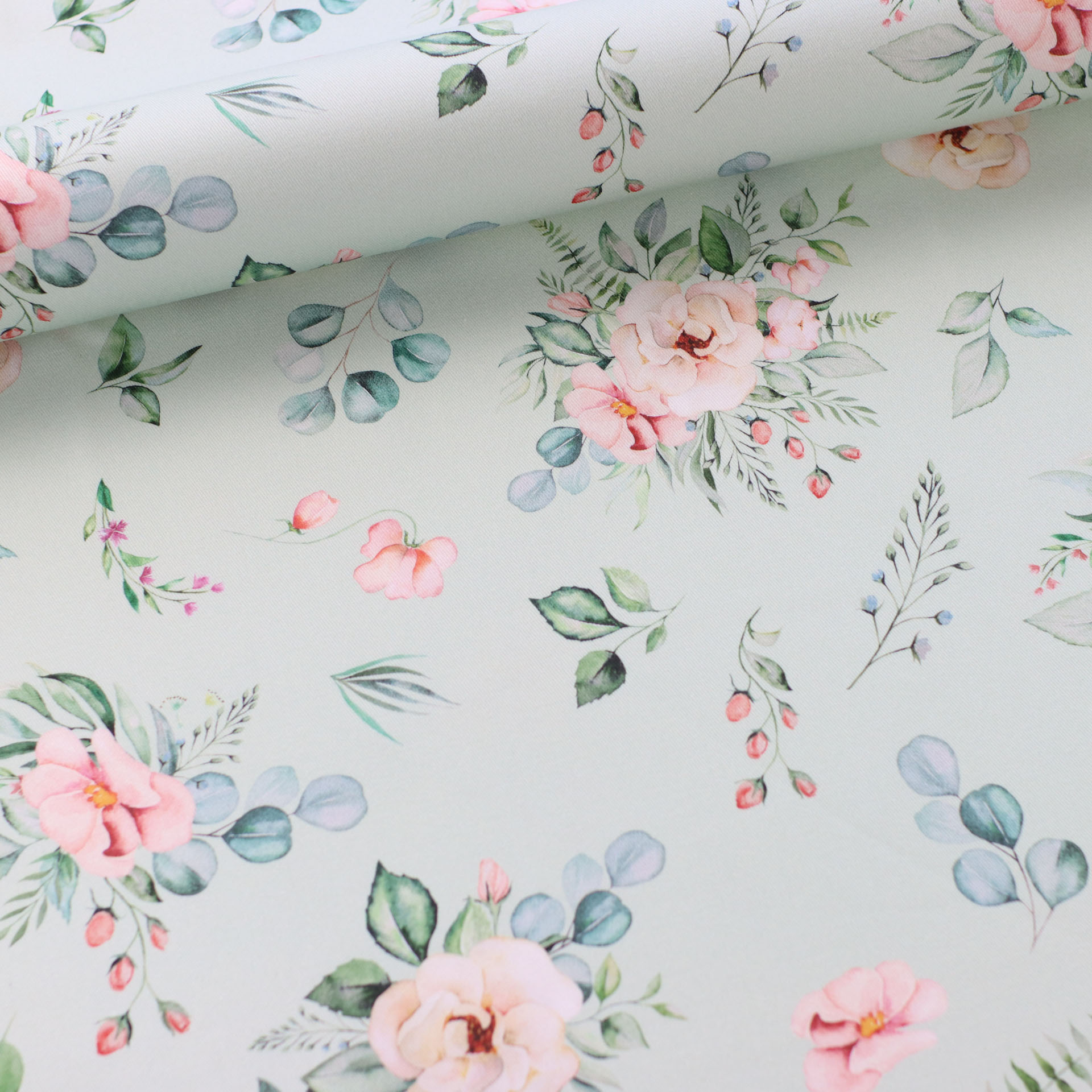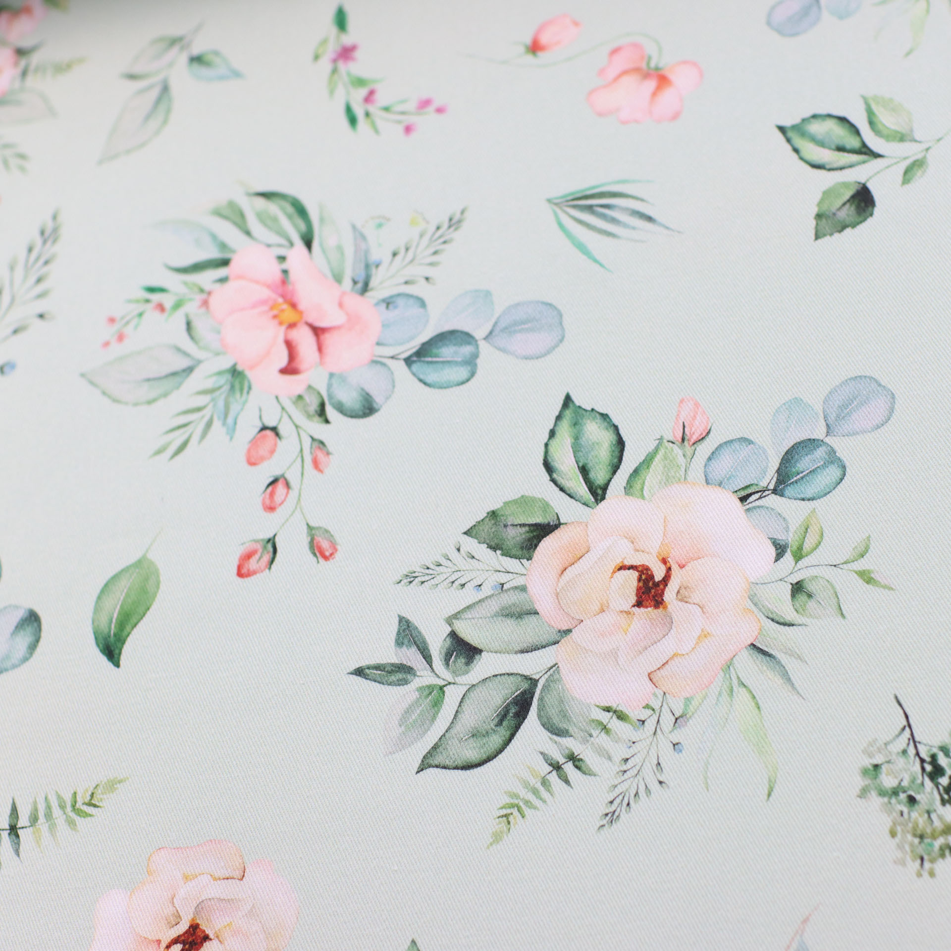 Unsere Eigenproduktion 'Aquarell Mint' - Fester, mintfarbener Canvas mit Eukalyptusblättern und Blüten. Perfekt für Taschen, Rucksäcke, Accessoires und vieles mehr!
