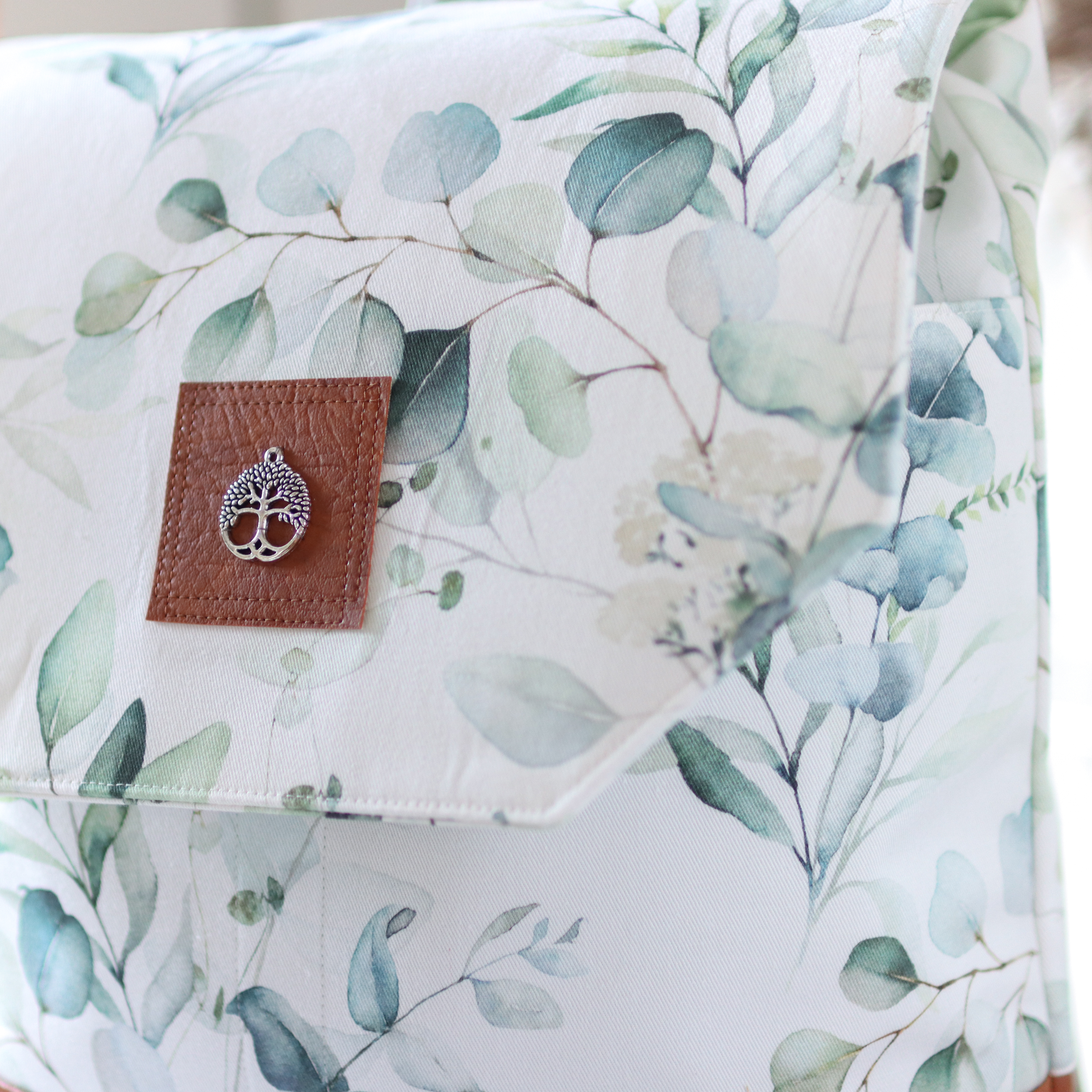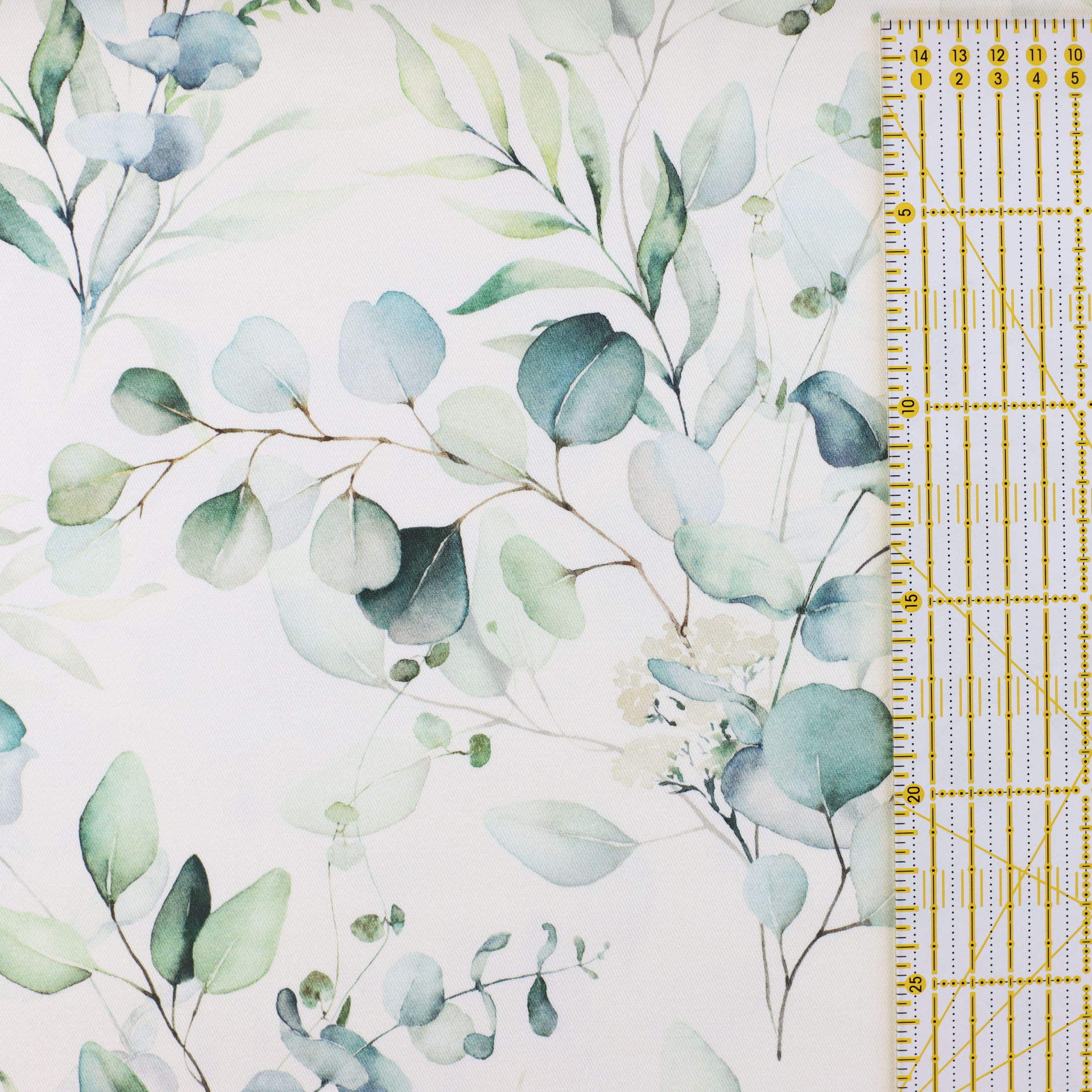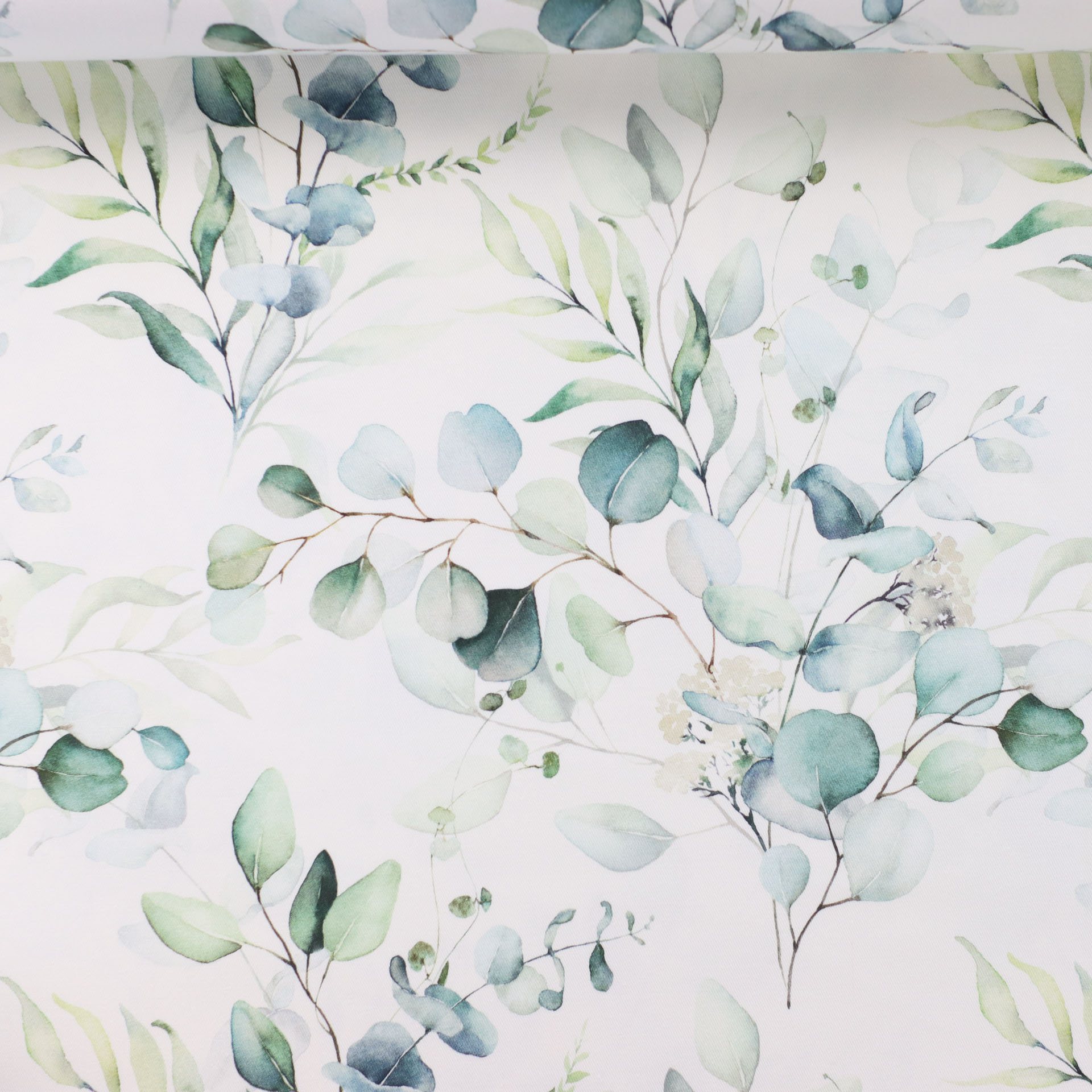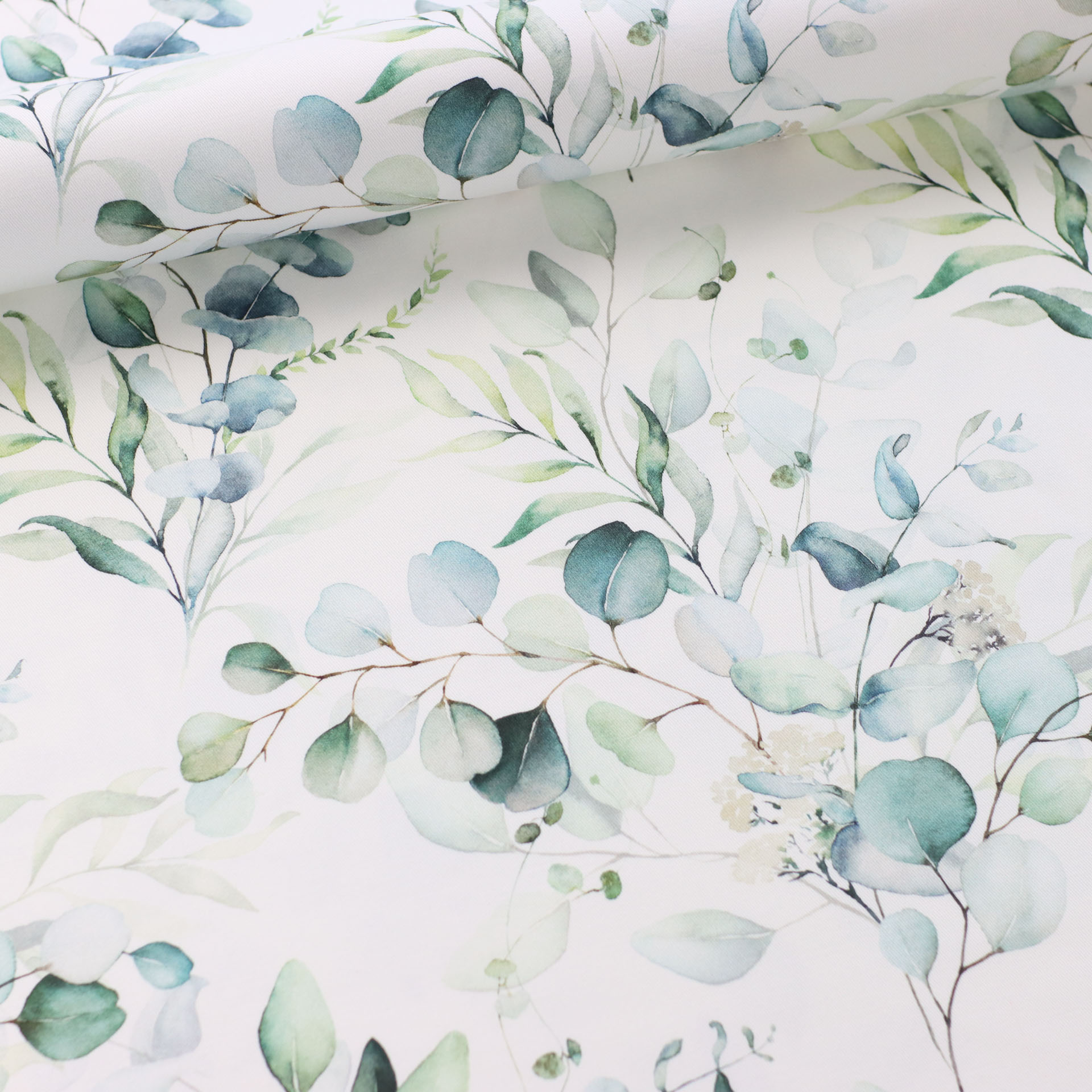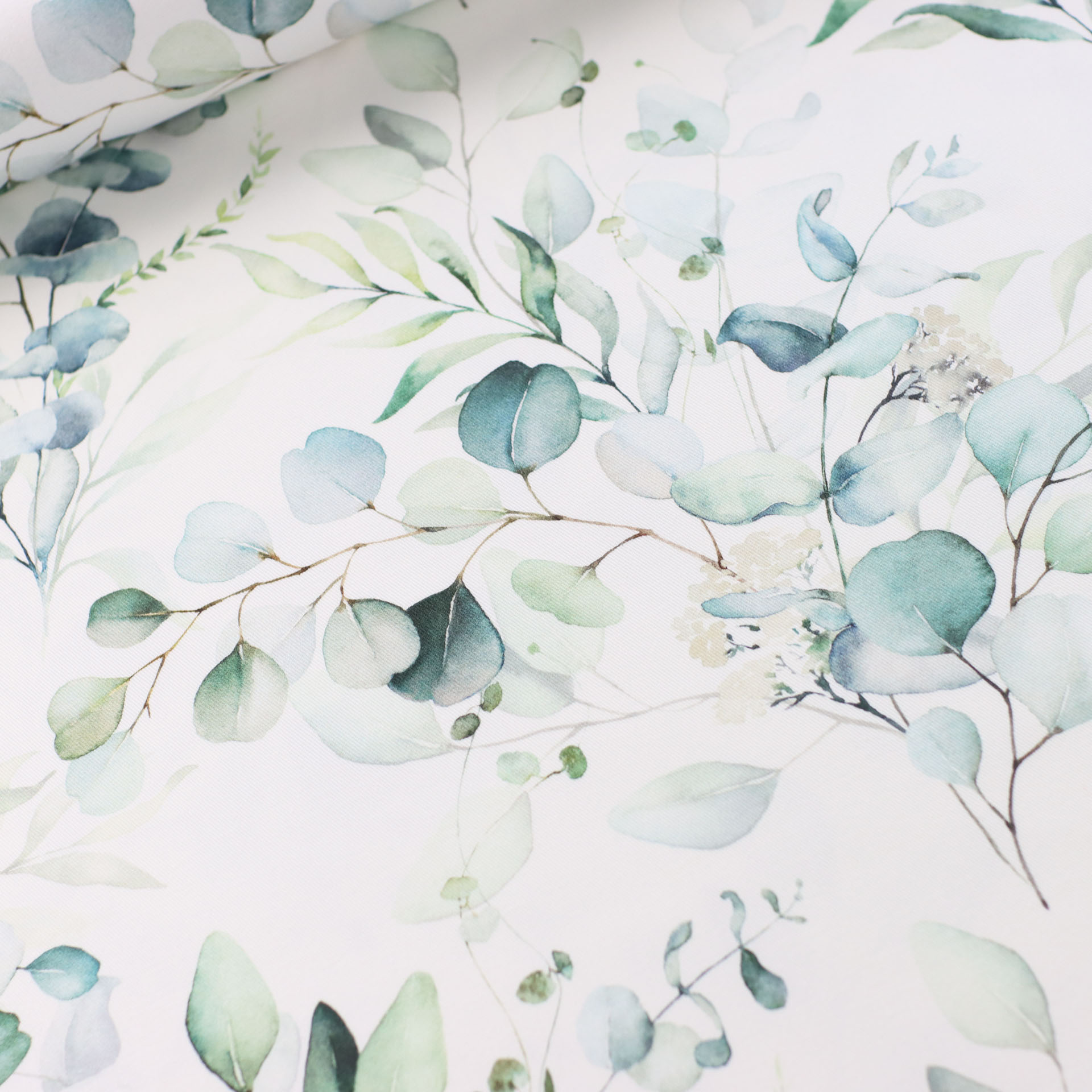 Unsere Eigenproduktion 'Eukalyptus' - Fester, heller Canvas mit Eukalyptusblättern und Zweigen in zarten Mint- und Blautönen. Perfekt für Taschen, Rucksäcke, Accessoires und vieles mehr!