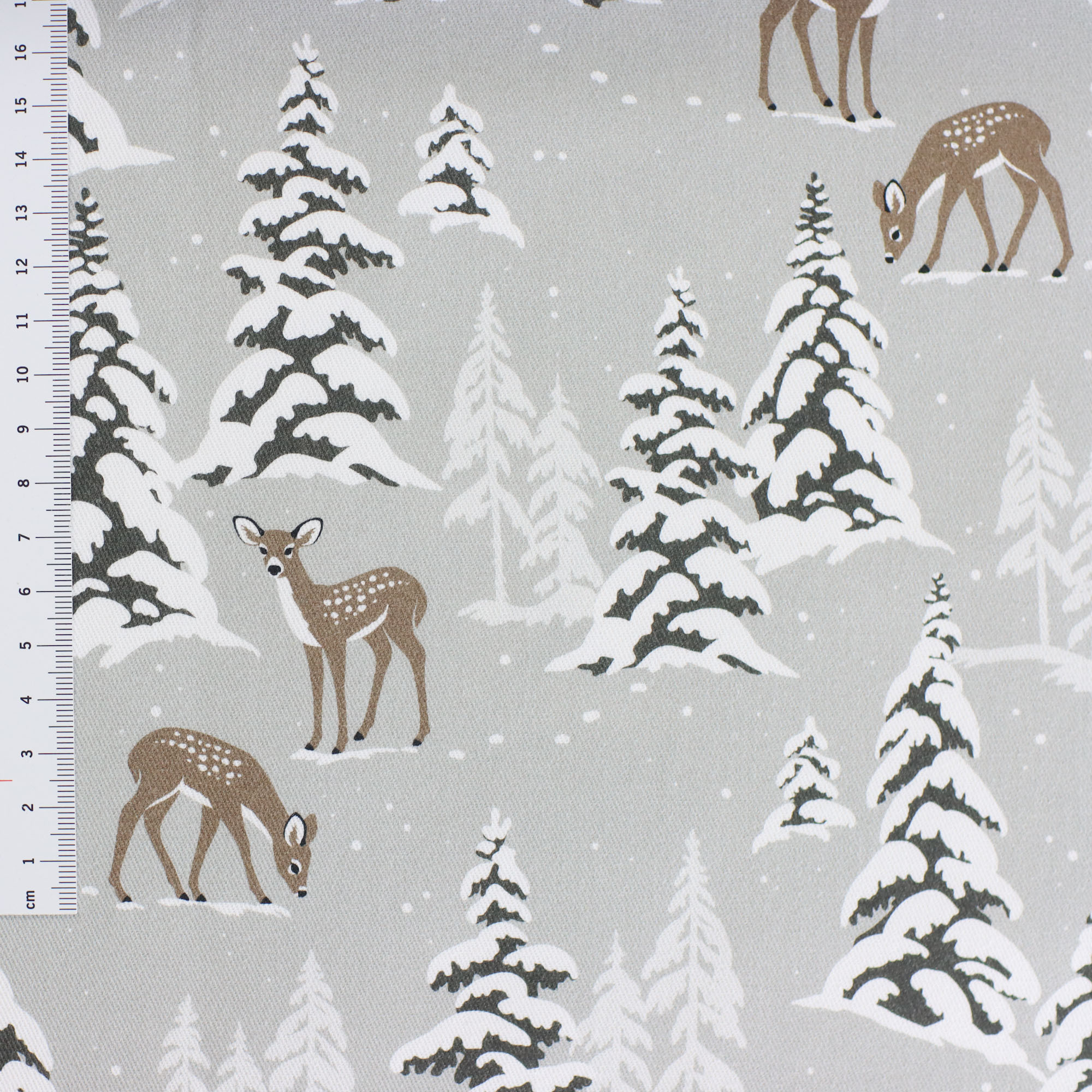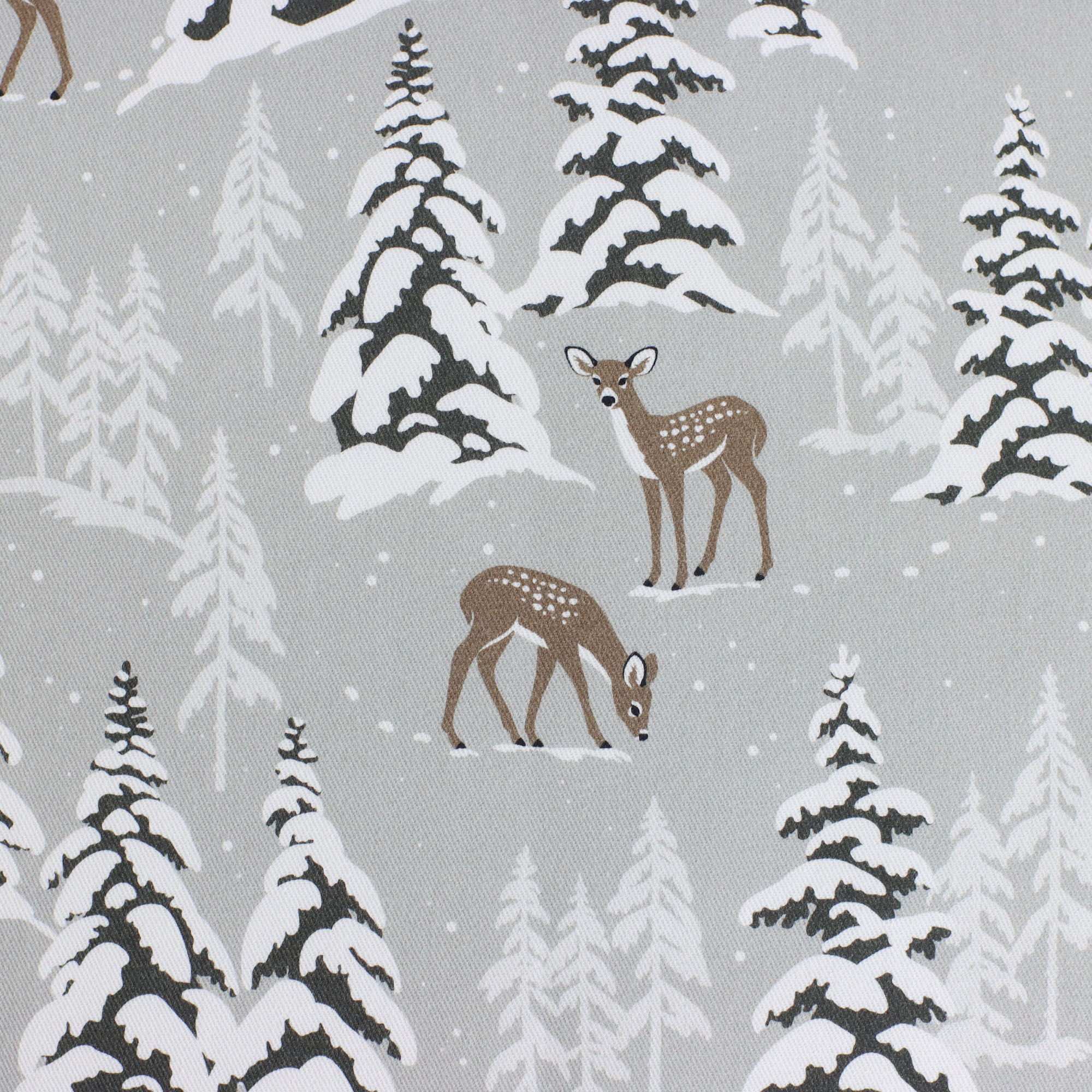 Unsere Eigenproduktion 'Rehe im Winterwald' - Fester, heller Canvas mit Rehen zwischen schneebedeckten Tannen. Perfekt für winterlich-weihnachtliche Accessoires, Tischdecken, Utensilos und vieles mehr!