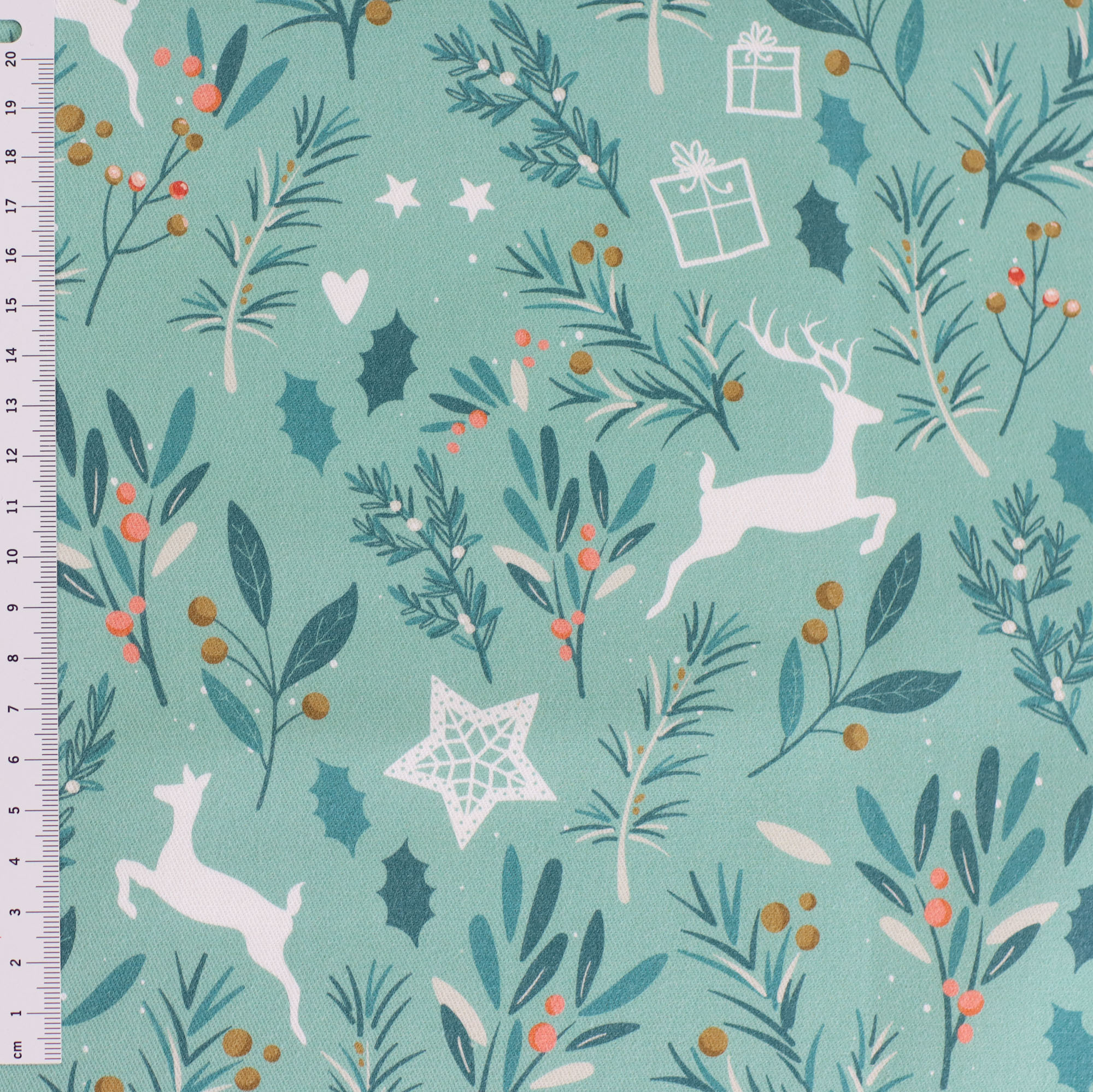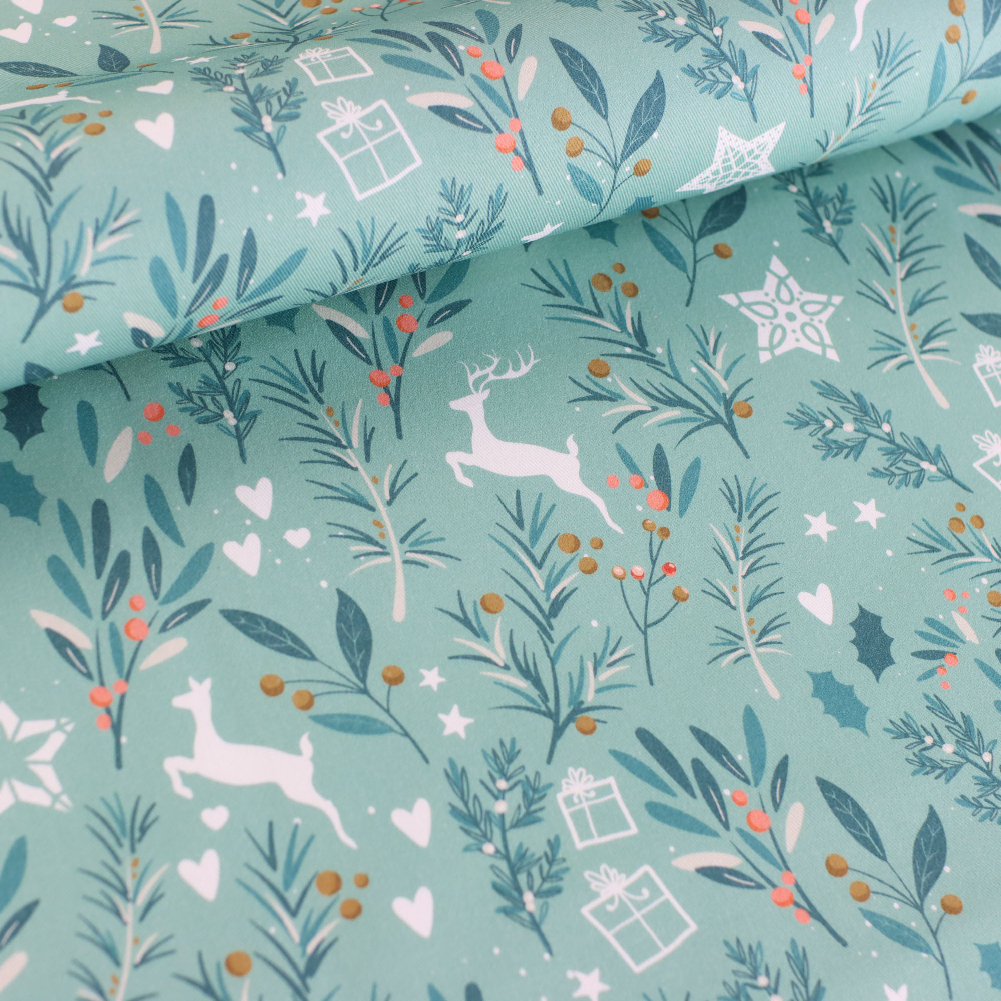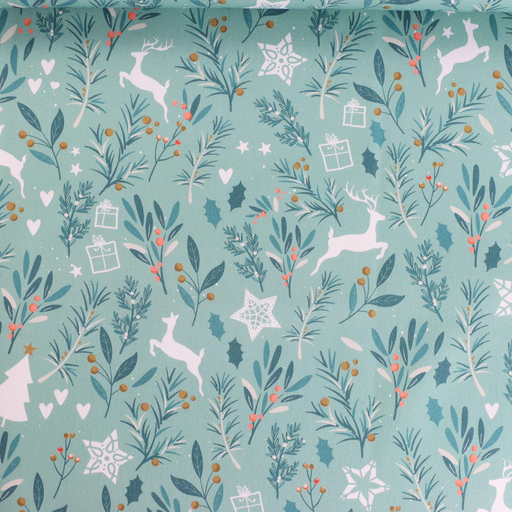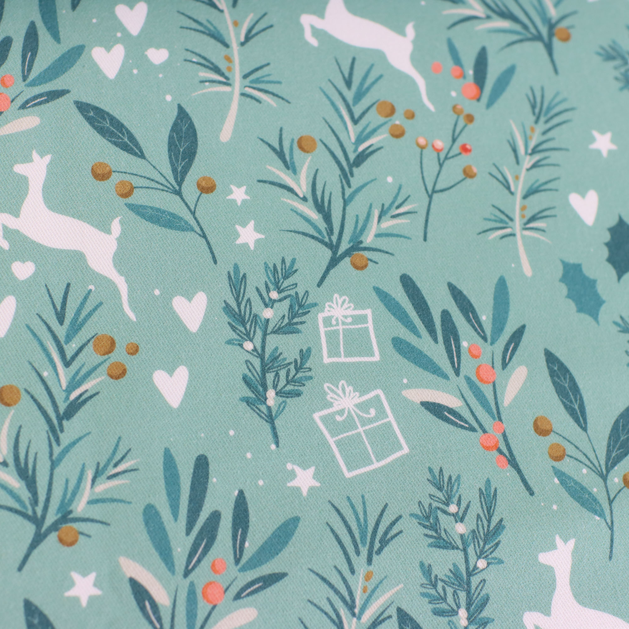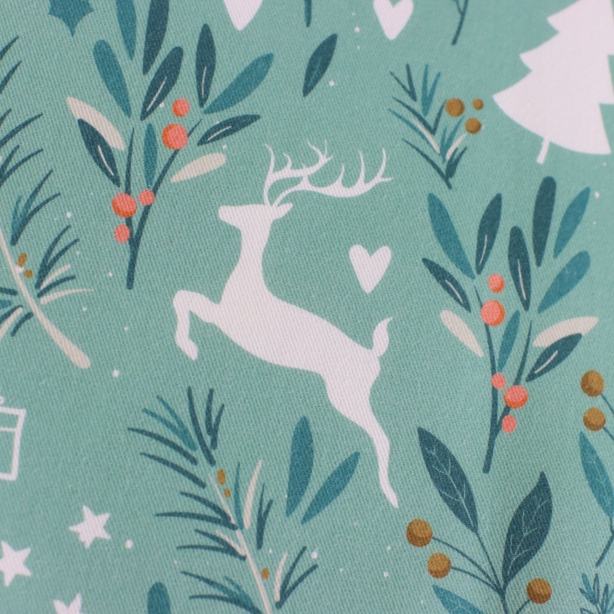 Unsere Eigenproduktion 'Rentiere mint' - Fester, mintfarbener Canvas mit Rentieren, Sternen und Zweigen. Perfekt für winterlich-weihnachtliche Accessoires, Tischdecken, Utensilos und vieles mehr!