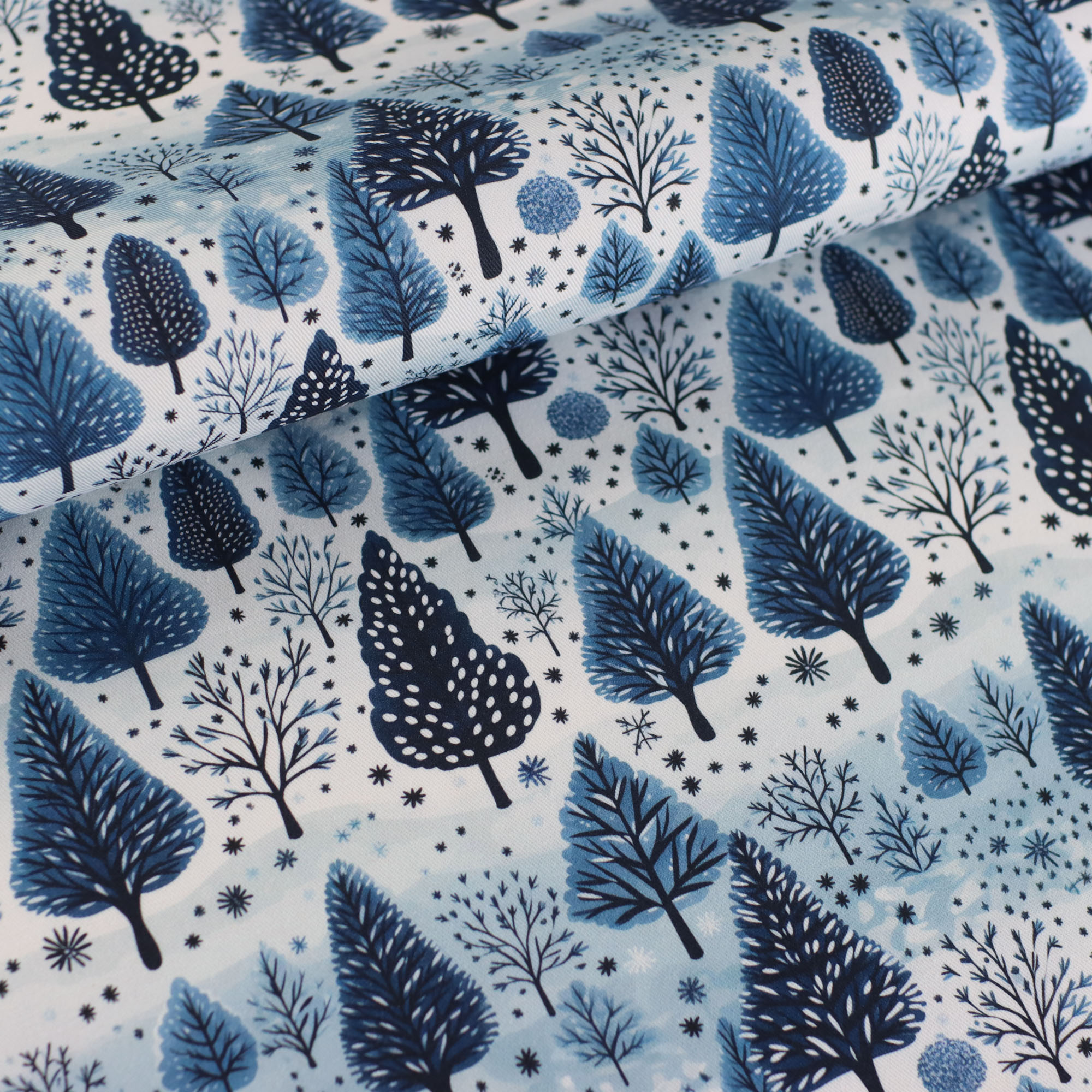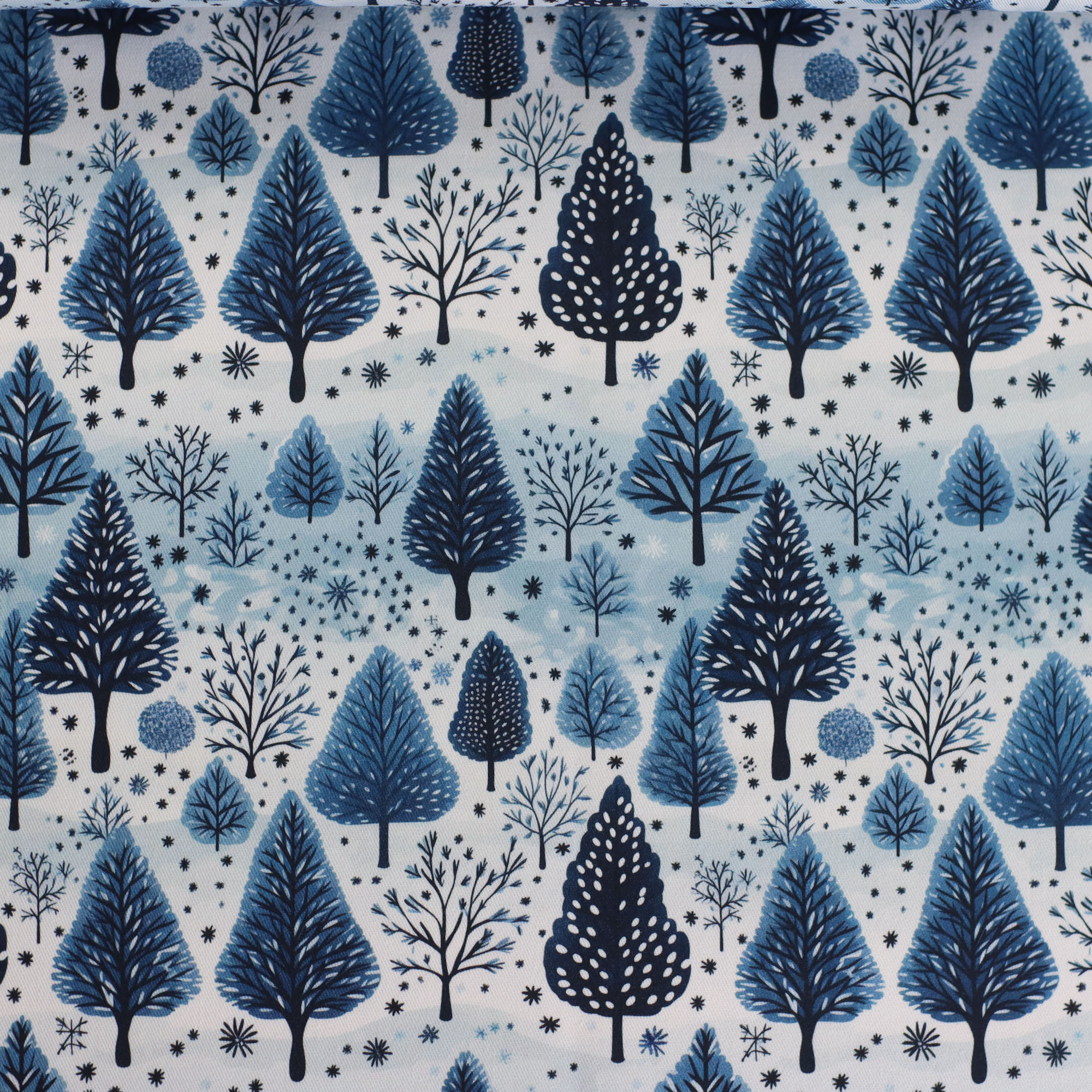 Unsere Eigenproduktion 'Winterwald' - Fester, hellblauer Canvas mit winterlichen Bäumen. Perfekt für winterlich-weihnachtliche Accessoires, Tischdecken, Utensilos und vieles mehr!