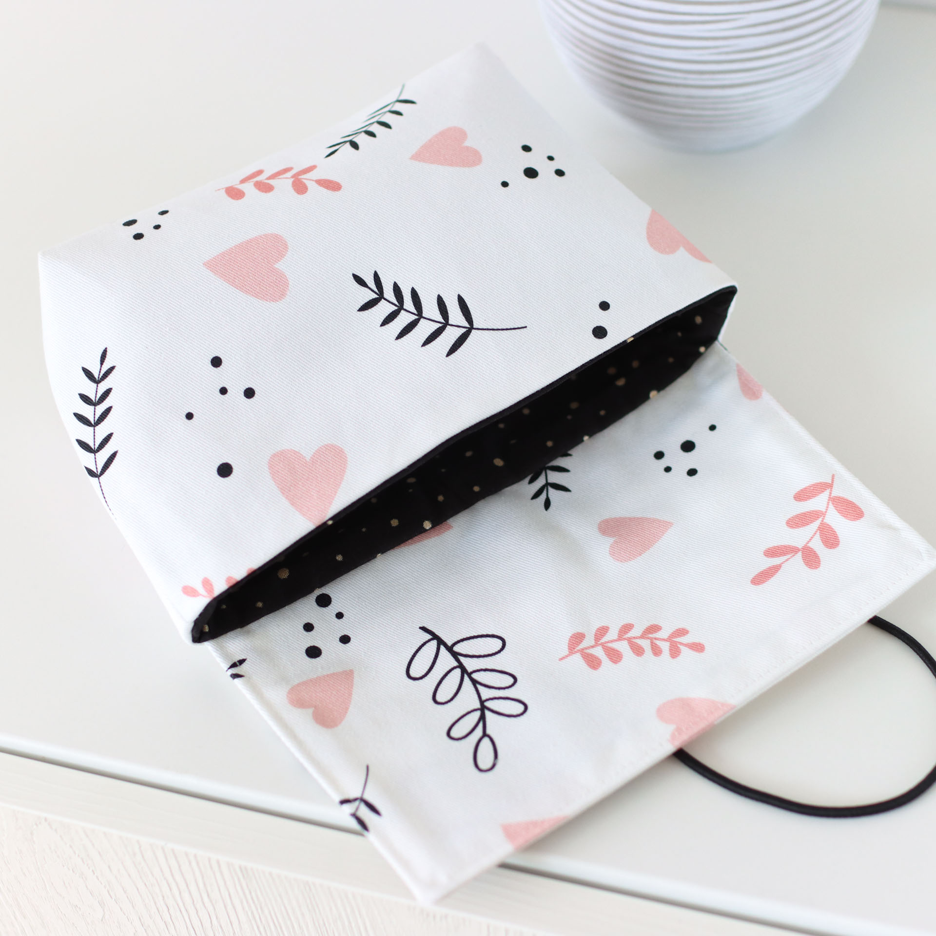 Mit ihrer praktischen Größe von 16cm Breite, 7cm Tiefe und 12cm Höhe passt sie in jede Handtasche. Die Klappe sorgt dafür, dass an seinem Platz bleibt und wird mit dem eingenähten Gummiband fixiert.