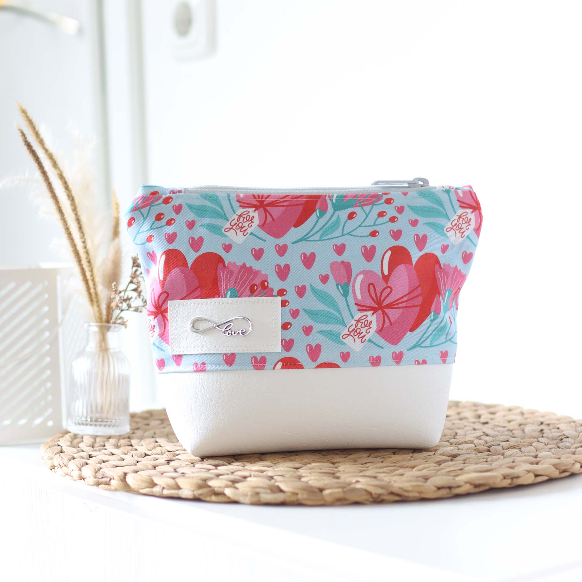 - Außen ein hellblauer Canvas mit verspieltem Blütenprint, Herzen und 'For You' Schriftzug