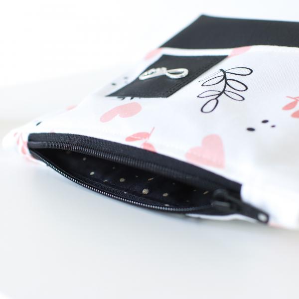 - Außenseite aus hellem Canvas mit Herzen & Blättern, dazu ein schwarzes Kunstleder
