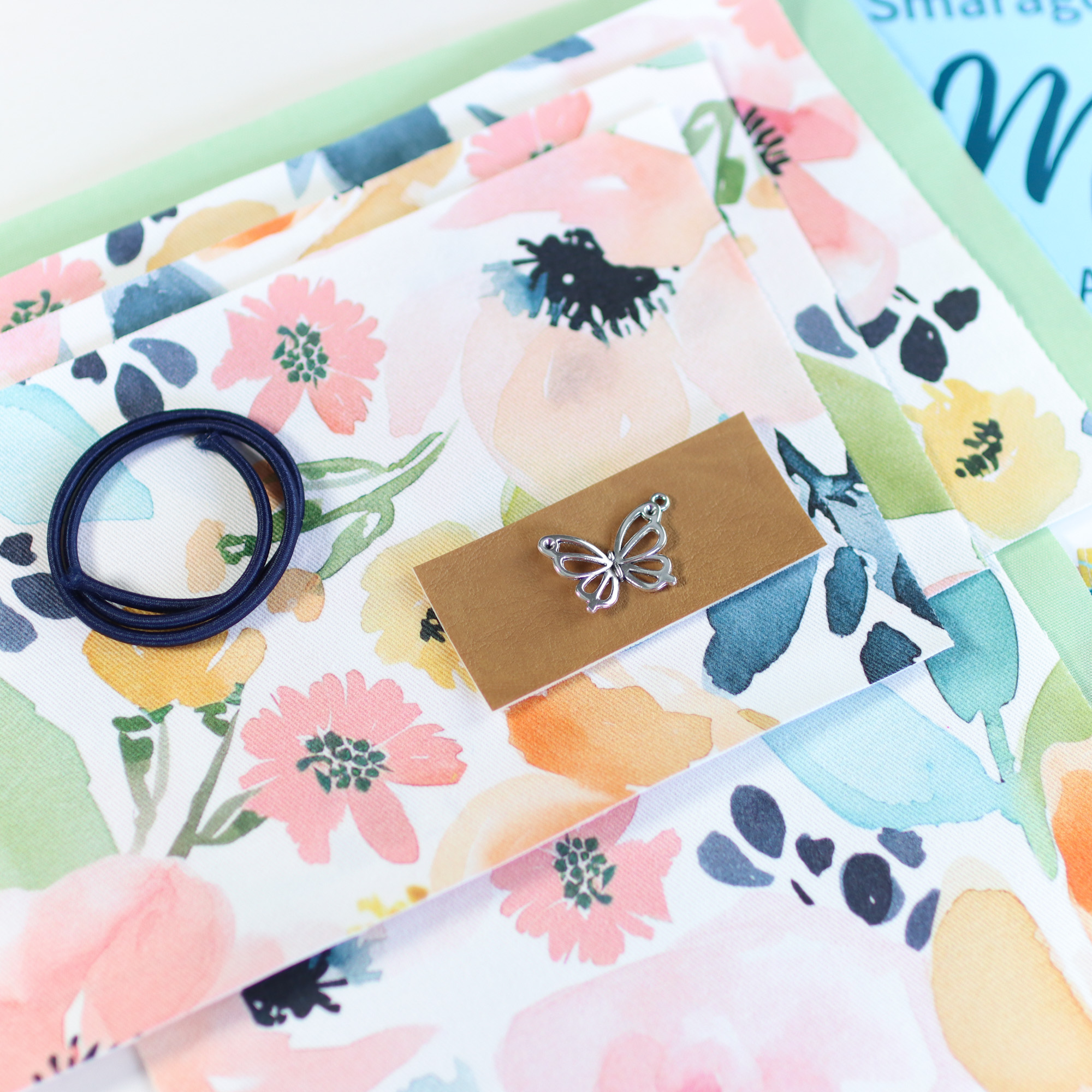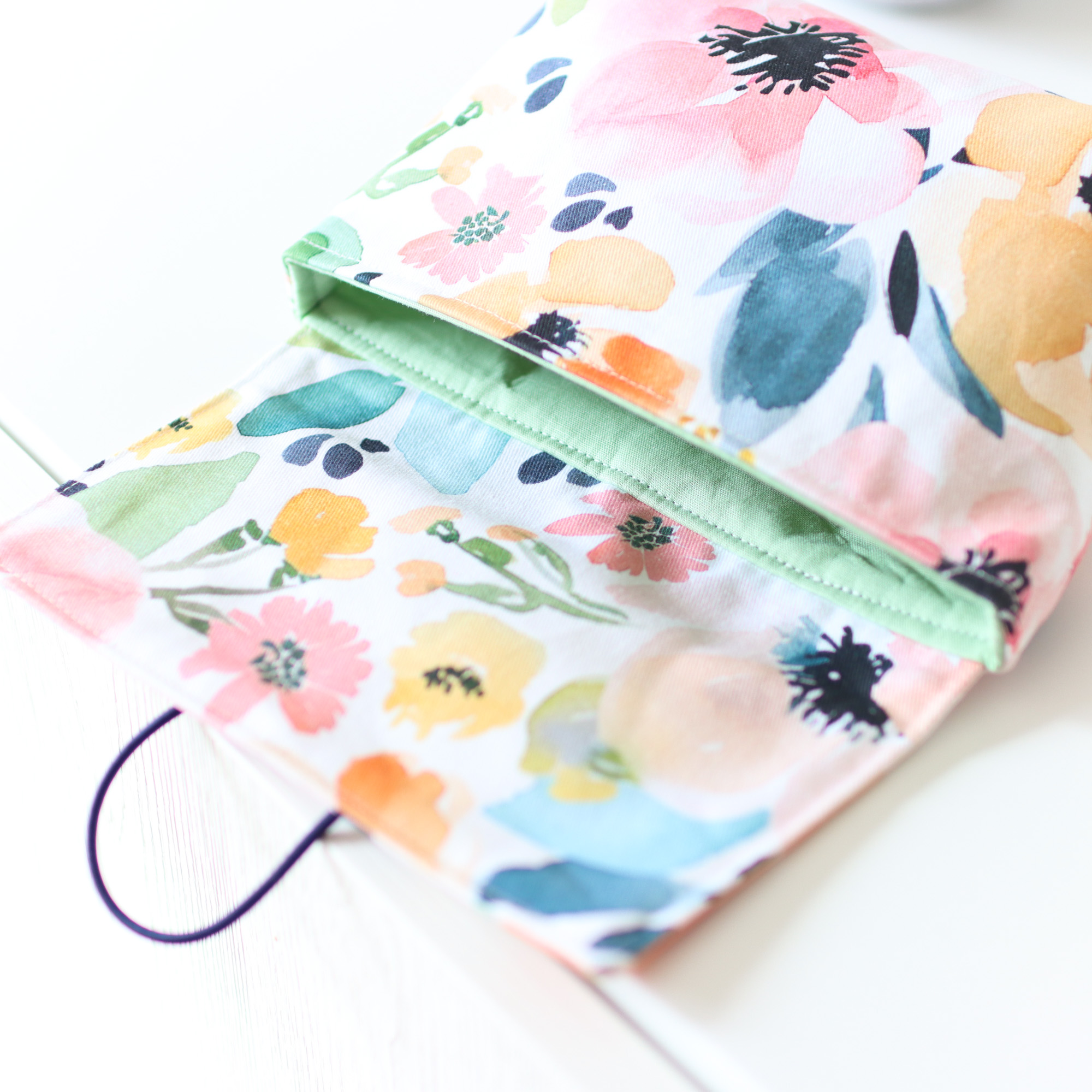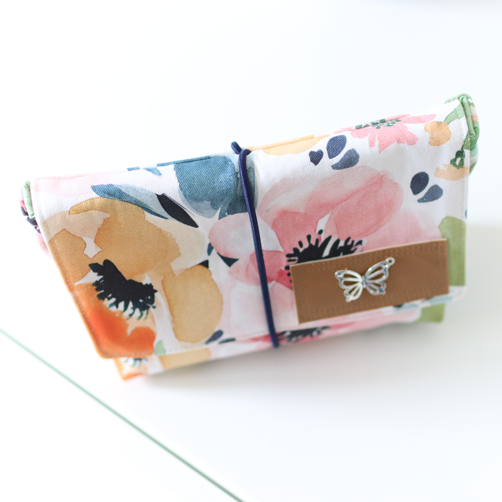 - Außen ein heller, fester Canvas mit Aquarell-Blüten