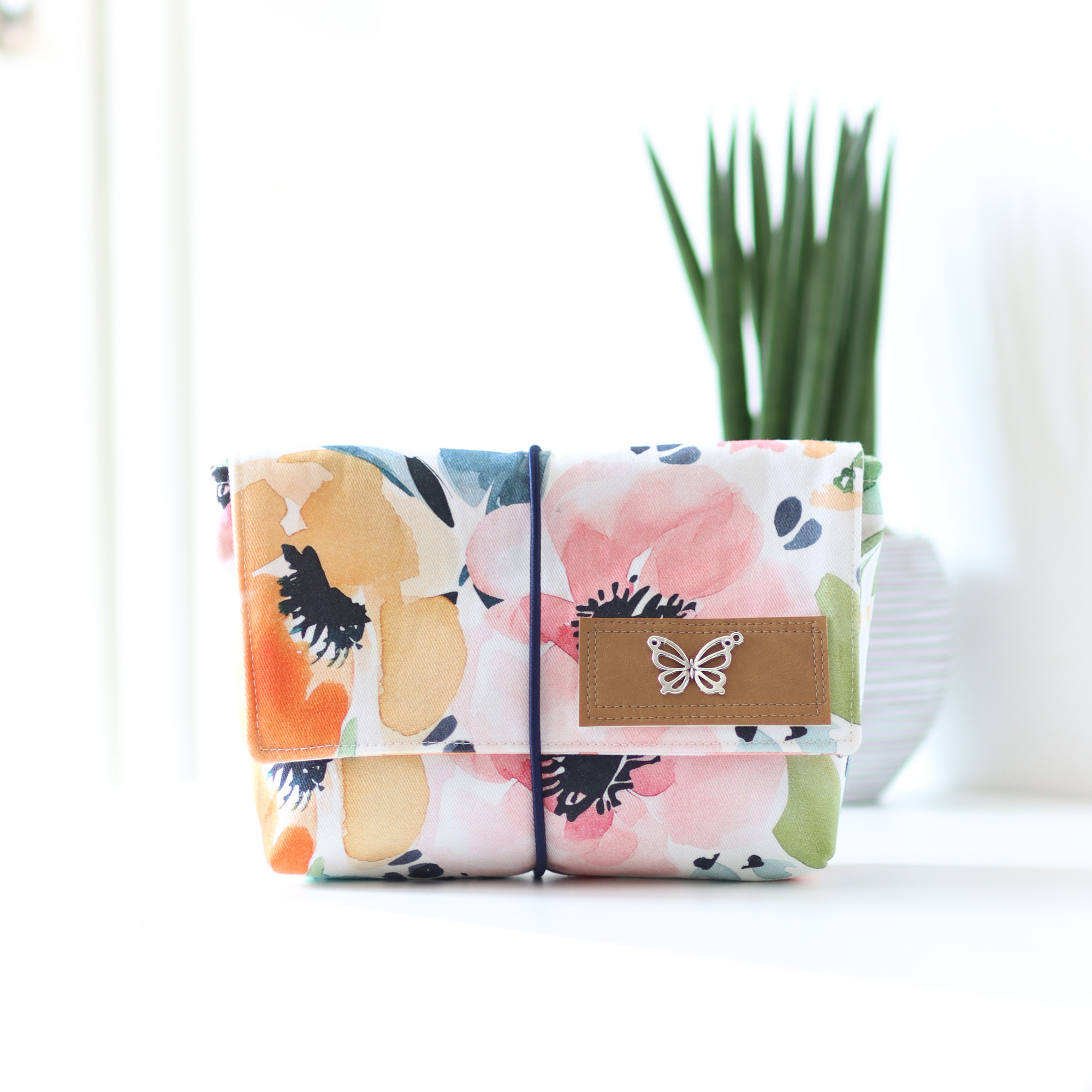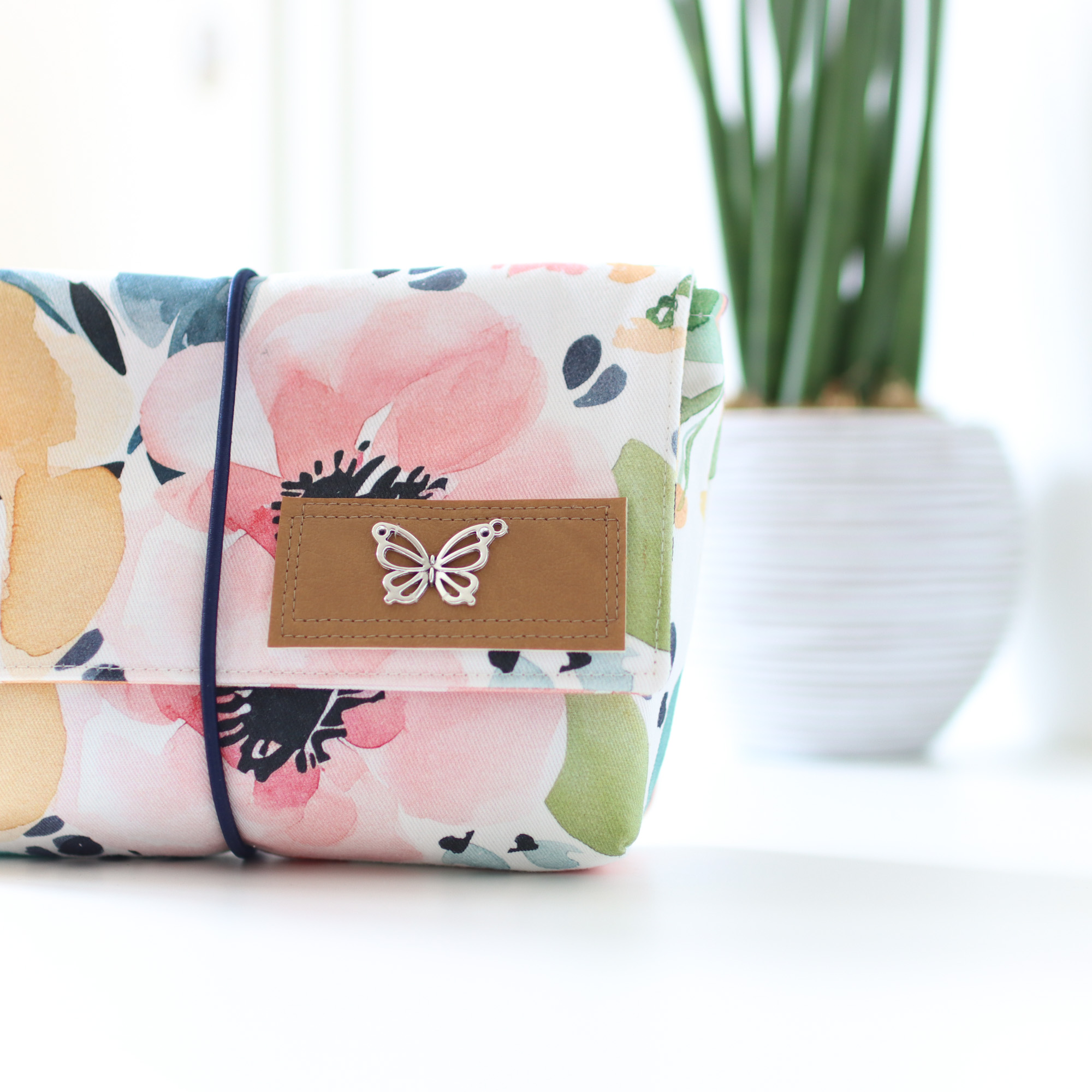 Mit ihrer praktischen Größe von 16cm Breite, 7cm Tiefe und 12cm Höhe passt sie in jede Handtasche. Die Klappe sorgt dafür, dass an seinem Platz bleibt und wird mit dem eingenähten Gummiband fixiert.