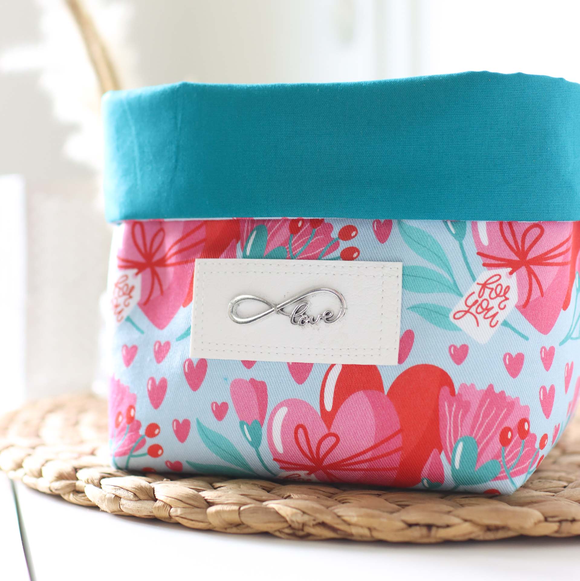 - Außen ein hellblauer Canvas mit verspieltem Blütenprint, Herzen und 'For You' Schriftzug