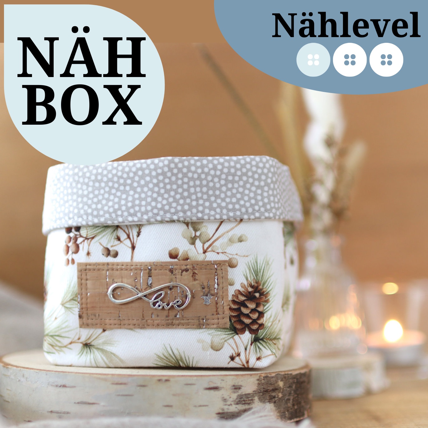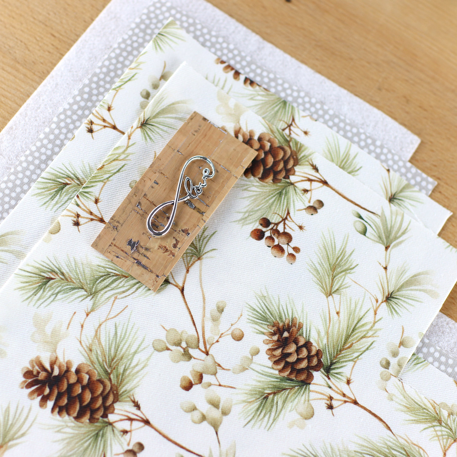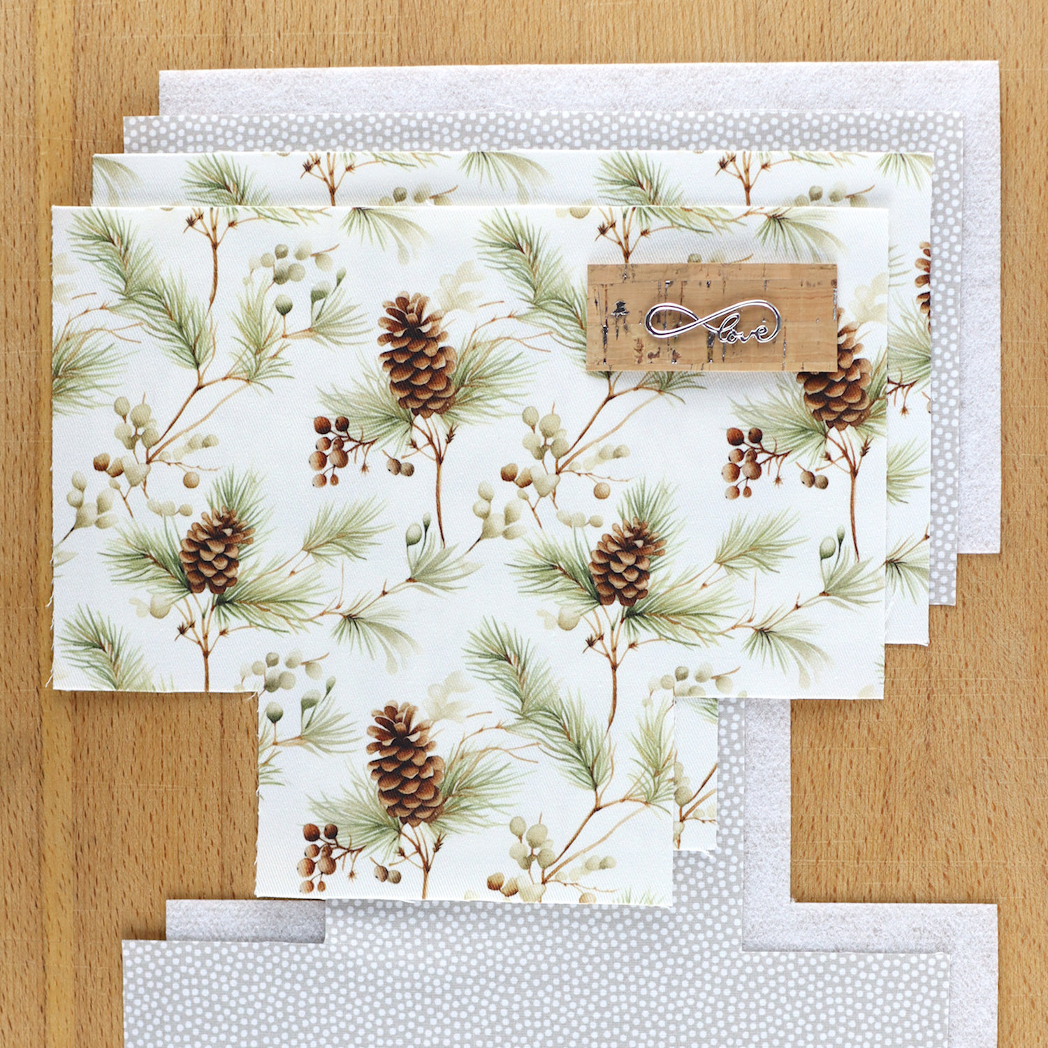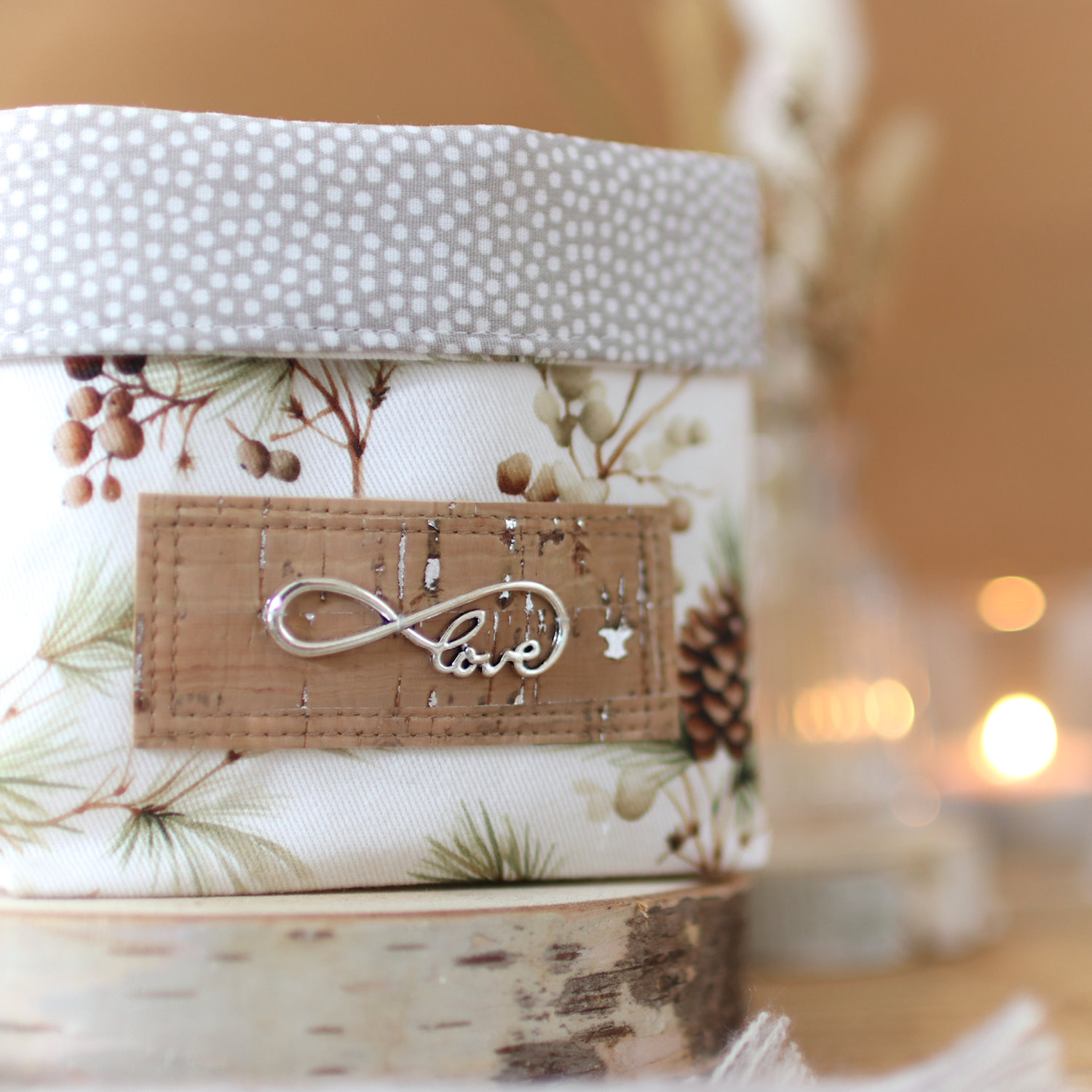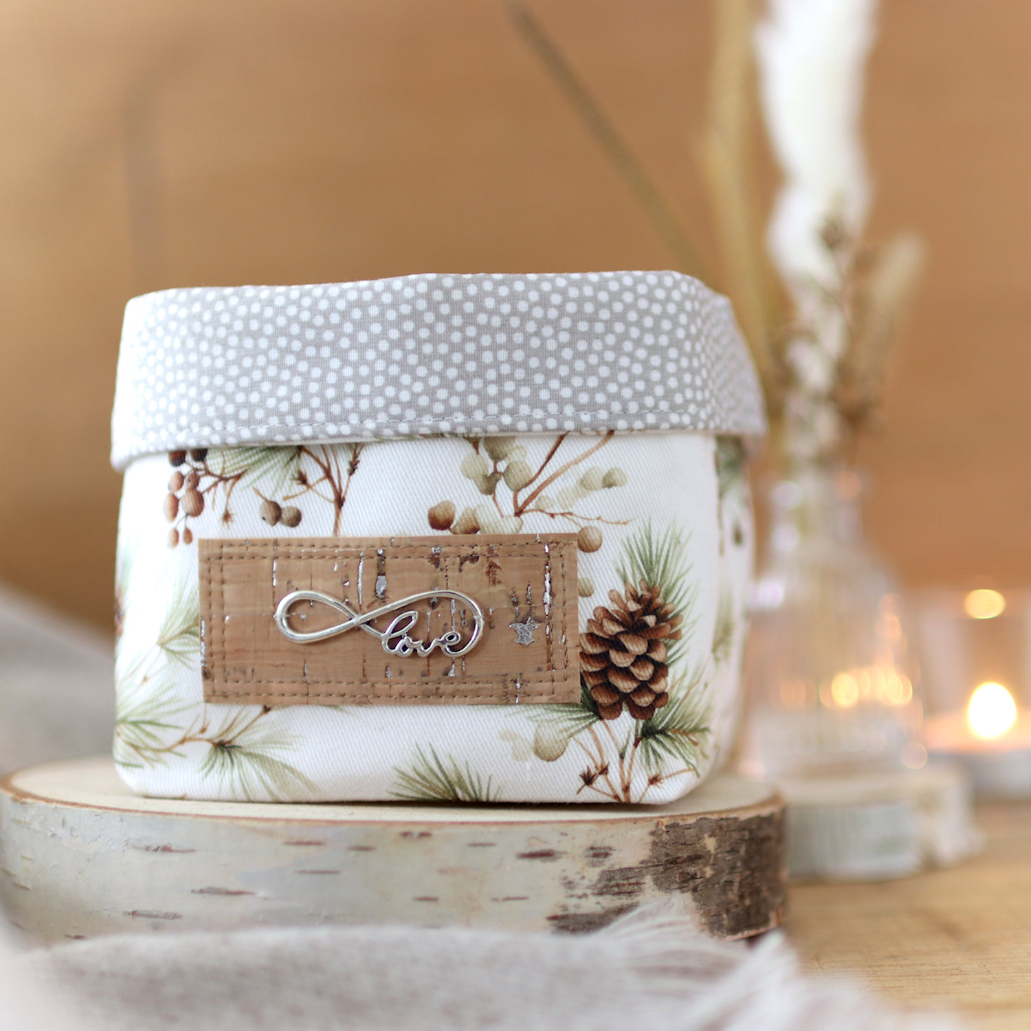 - Außen ein heller, fester Canvas mit Zweigen und Tannenzapfen in natürlichen Farben