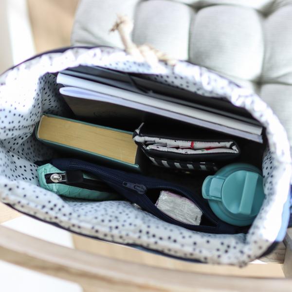 Mit einer Größe von 30cm Breite und 40cm Höhe passt jede Menge hinein und du kannst ihn sowohl mit Leckereien fürs gemütliche Picknick, mit deinen Sportsachen für die nächste Fitnesseinheit oder mit Unterlagen für die Arbeit vollpacken. An der Vorderseite der Außentasche befinden sich zwei geräumige Einsteckfächer, um wichtige Sachen griffbereit zu haben. Eine Handschlaufe und zwei gepolsterte Träger mit Leiterstegen zum Verstellen werden auf der Rückseite angebracht. Die Klappe schützt nicht nur den Inhalt im Inneren, sondern verdeckt auch die beiden Einsteckfächer. Du kannst sie entweder in eckiger oder runder Form nähen und wahlweise mit einem Steppmuster verschönern. Der aufgenähte Patch mit dem Metallanhänger darf natürlich nicht fehlen und mit einem Magnetschloss wird die Klappe geschlossen. Optional kannst du auch zwei Magnete einsetzen, damit du die Klappe variabel schließen kannst. Darunter befindet sich ein Tunnelzug mit Kordel, um die Öffnung deinem Rucksackvolumen anzupassen. Im Inneren wird ein kombiniertes Einsteck- und Reißverschluss-Fach eingenäht, in dem du Handy, Schlüssel & Co. verstauen kannst. Vollpacken, aufsetzen & los!