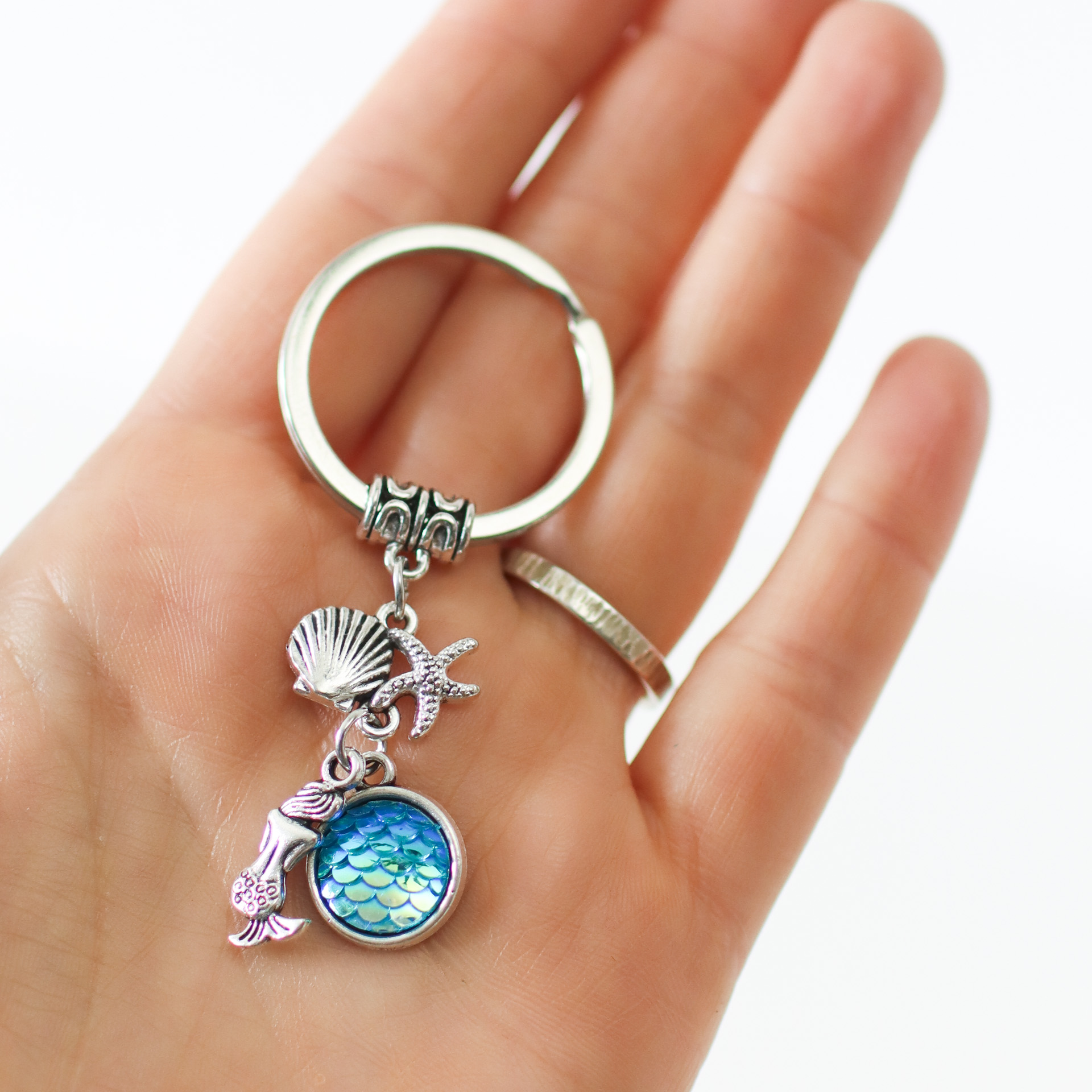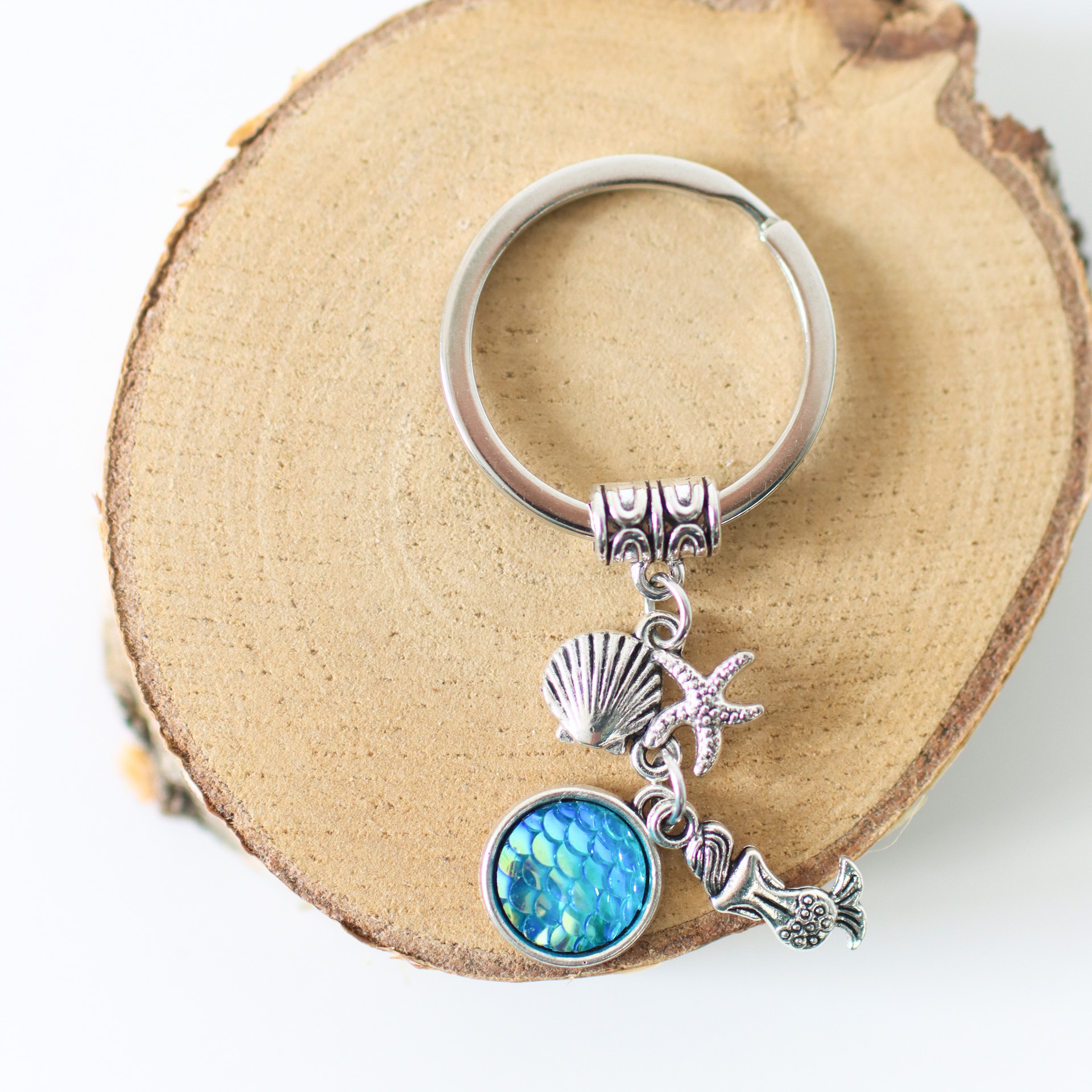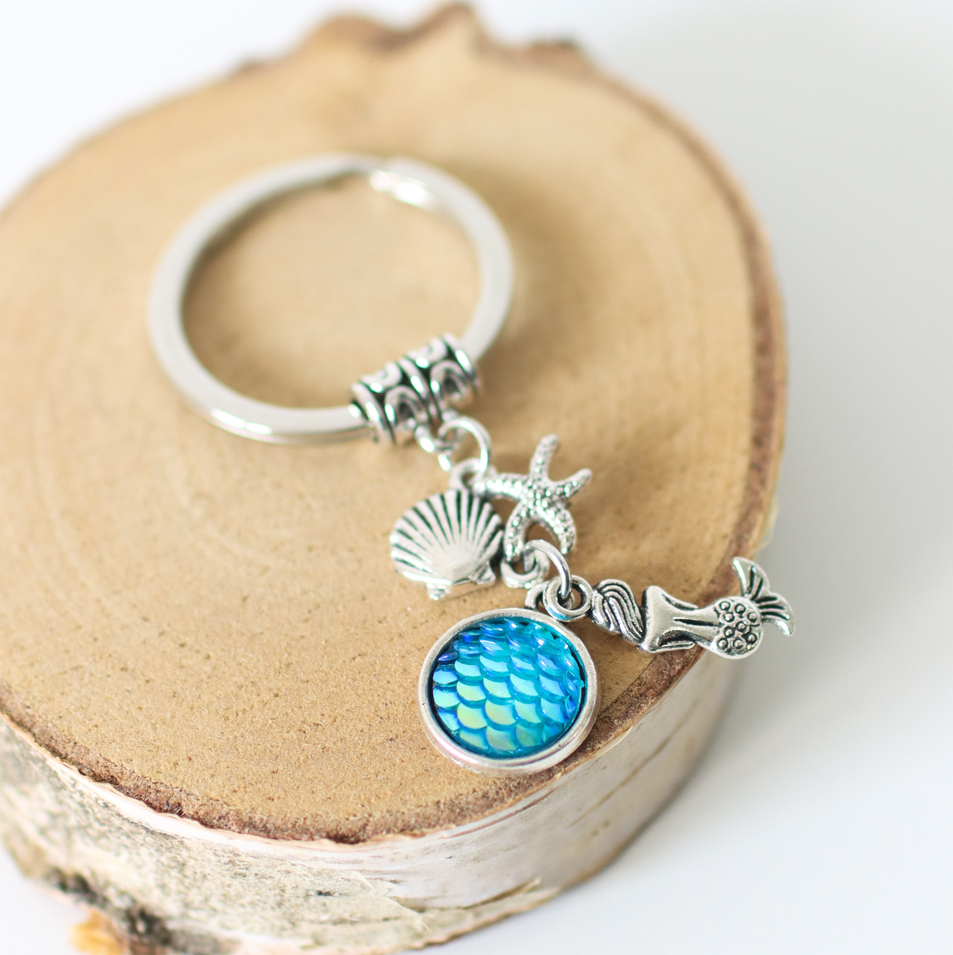 Schicker Schlüsselanhänger, den du beispielsweise an Reißverschlüssen befestigen kannst, um deine Taschen und Accessoires aufzupeppen. Mit verschiedenen Anhängern: Meerjungfrau, Seestern, Muschel und ein türkiser Anhänger mit Schuppenmuster.