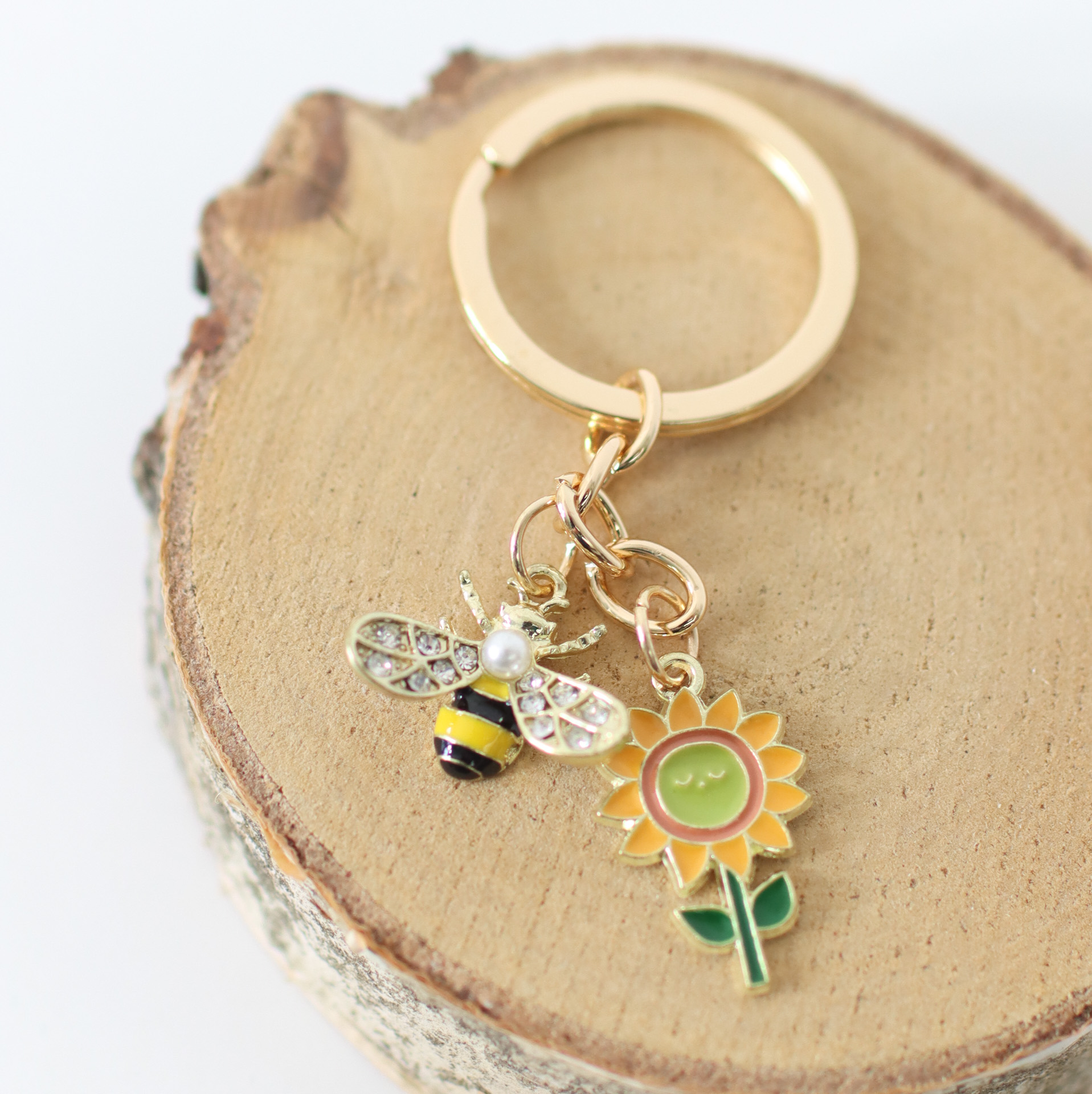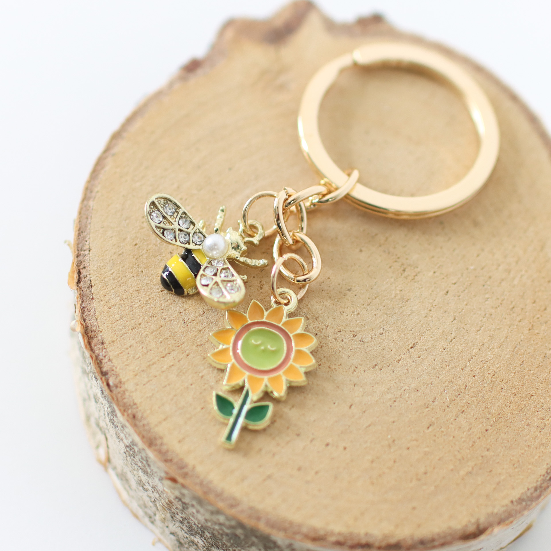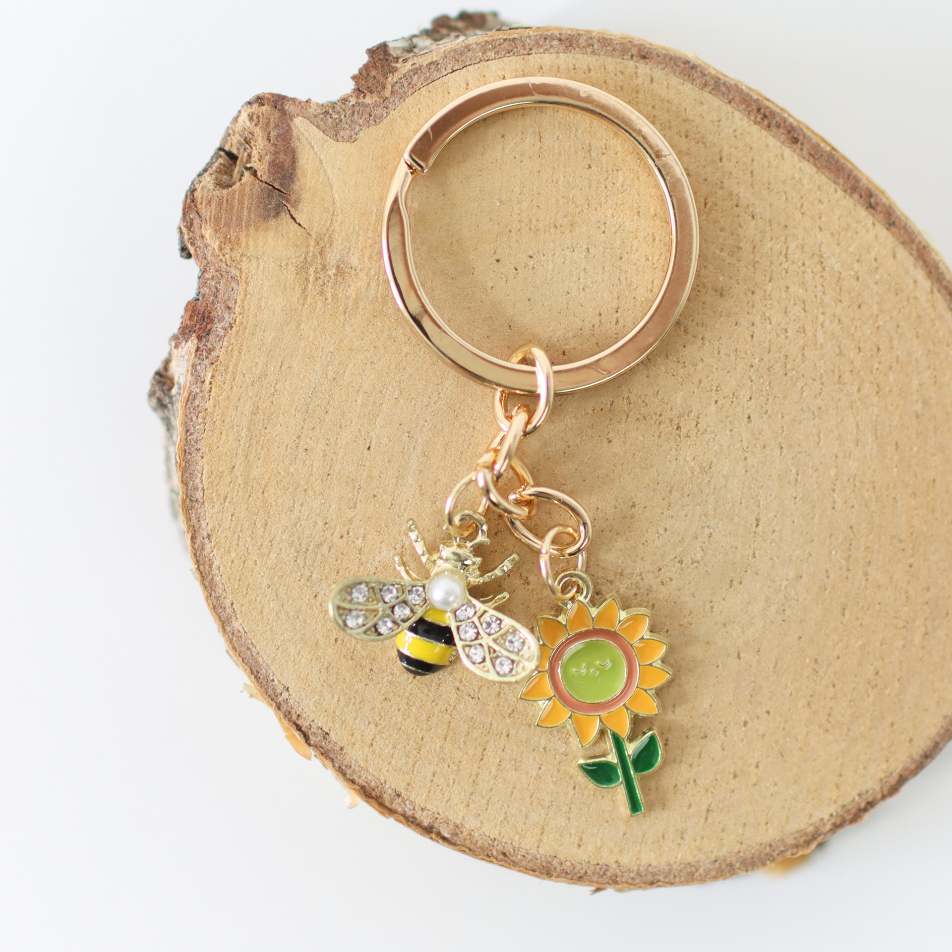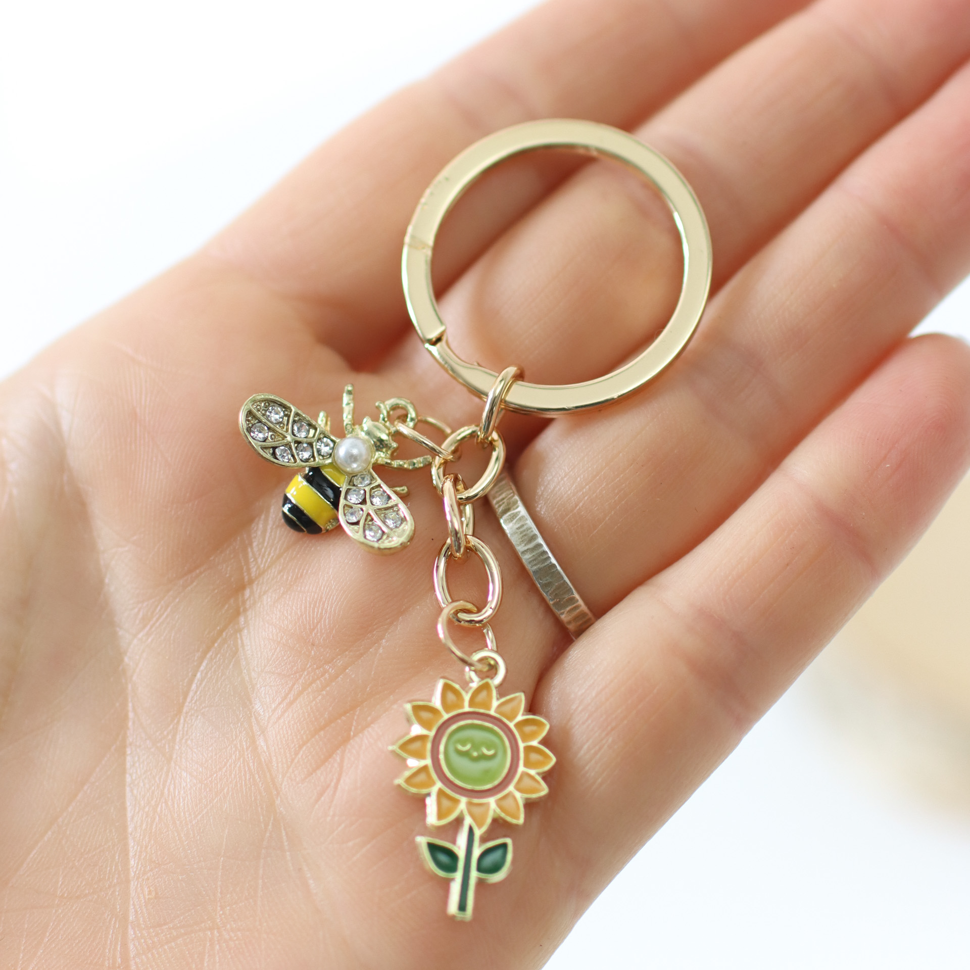 Schicker Schlüsselanhänger, den du beispielsweise an Reißverschlüssen befestigen kannst, um deine Taschen und Accessoires aufzupeppen. Mit je einem Bienen- und Blumenanhänger.