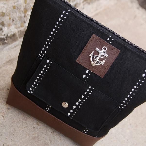 - Außenseite aus schwarzem Outdoorstoff mit weißen Punkten (wasserabweisender Stoff) und schokobraunem Kunstleder