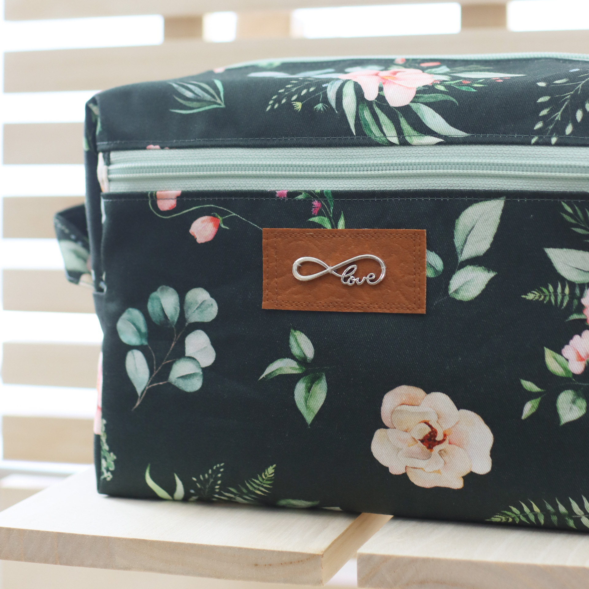 - Außen ein dunkelgrüner, fester Canvas mit Aquarell-Blüten