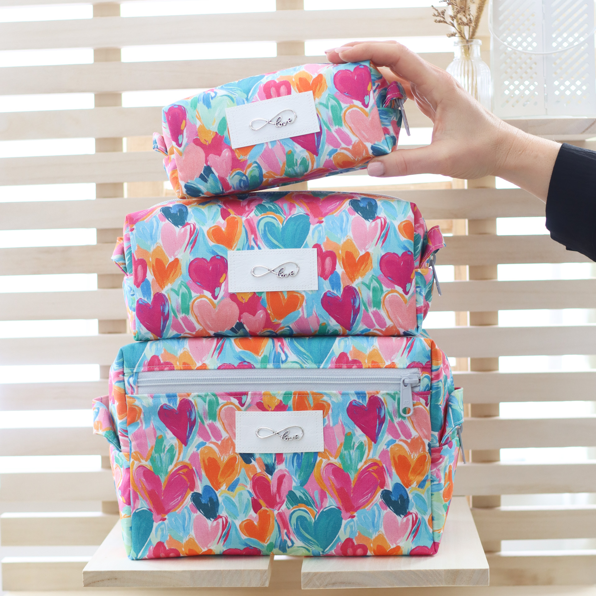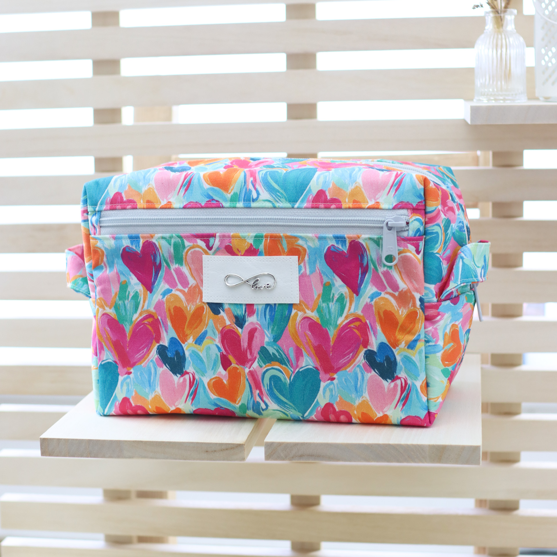 - Außen ein fester, farbenfroher Canvas mit bunten Herzen