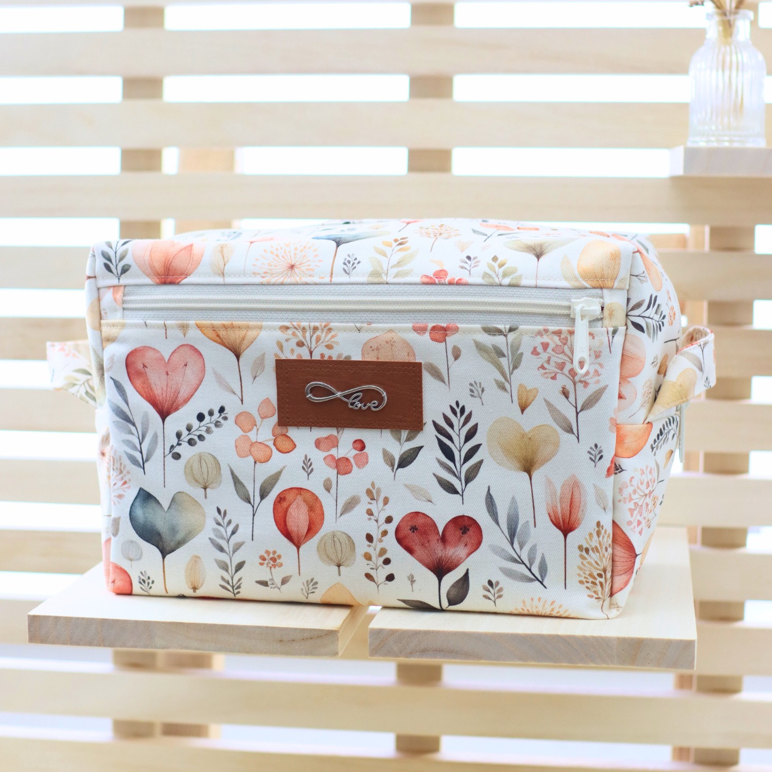 - Außen ein cremefarbener, fester Canvas mit floralen Motiven und Herzen