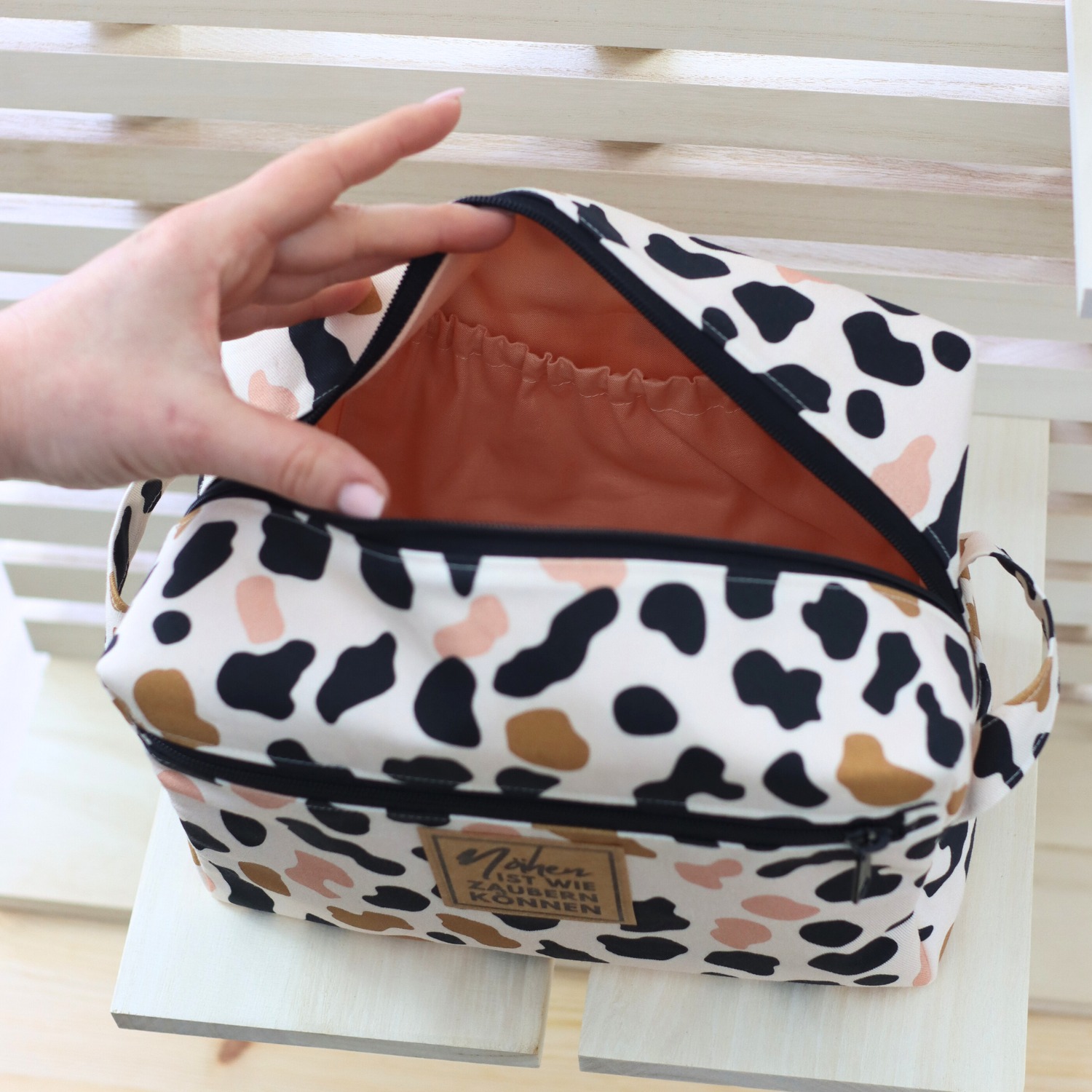 Die Boxy Bag Maxi ist die größte Variante der Serie und ein echtes Raumwunder – ideal für alle, die viel verstauen möchten. Sie bietet genügend Platz, damit Duschgel-, Shampoo- oder Bodylotion-Flaschen stehend transportiert werden können, was sie zu einem perfekten Beauty Case für Reisen macht. Mit ihren Maßen von 25 cm (Breite) × 18 cm (Höhe) × 15 cm (Tiefe) eignet sie sich außerdem hervorragend für Handarbeitsprojekte, wie Strickwolle, Häkelmaterial oder Bastelzubehör. Die weite Öffnung sorgt für einen schnellen Überblick, während die seitlichen Schlaufen das Öffnen und Schließen des großen Reißverschlusses angenehm erleichtern. Außen befindet sich ein Reißverschlussfach für Kleinigkeiten und im Inneren werden zwei zusätzliche Innenfächer eingenäht, damit alles gut sortiert bleibt. Eine geräumige, formstabile Tasche, die für maximale Ordnung sorgt – zuhause und unterwegs.
