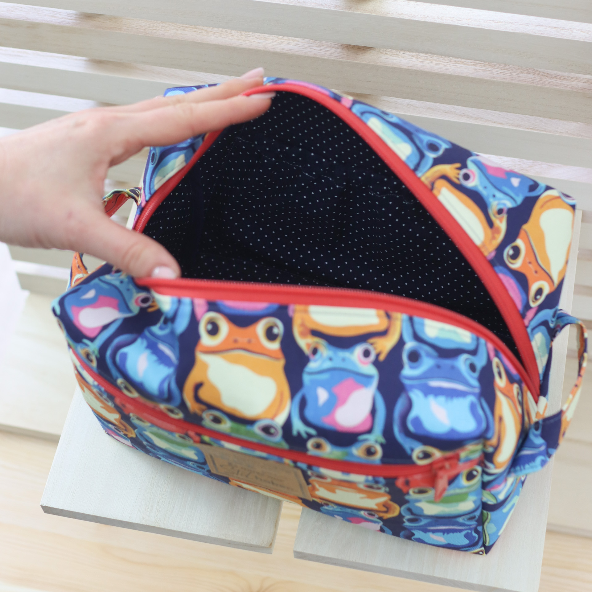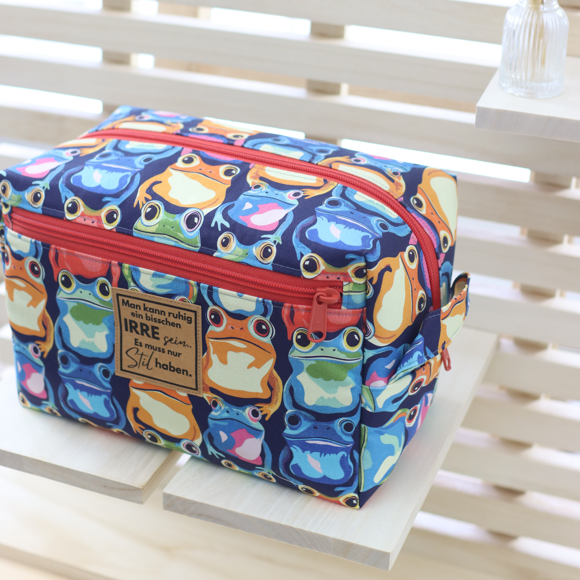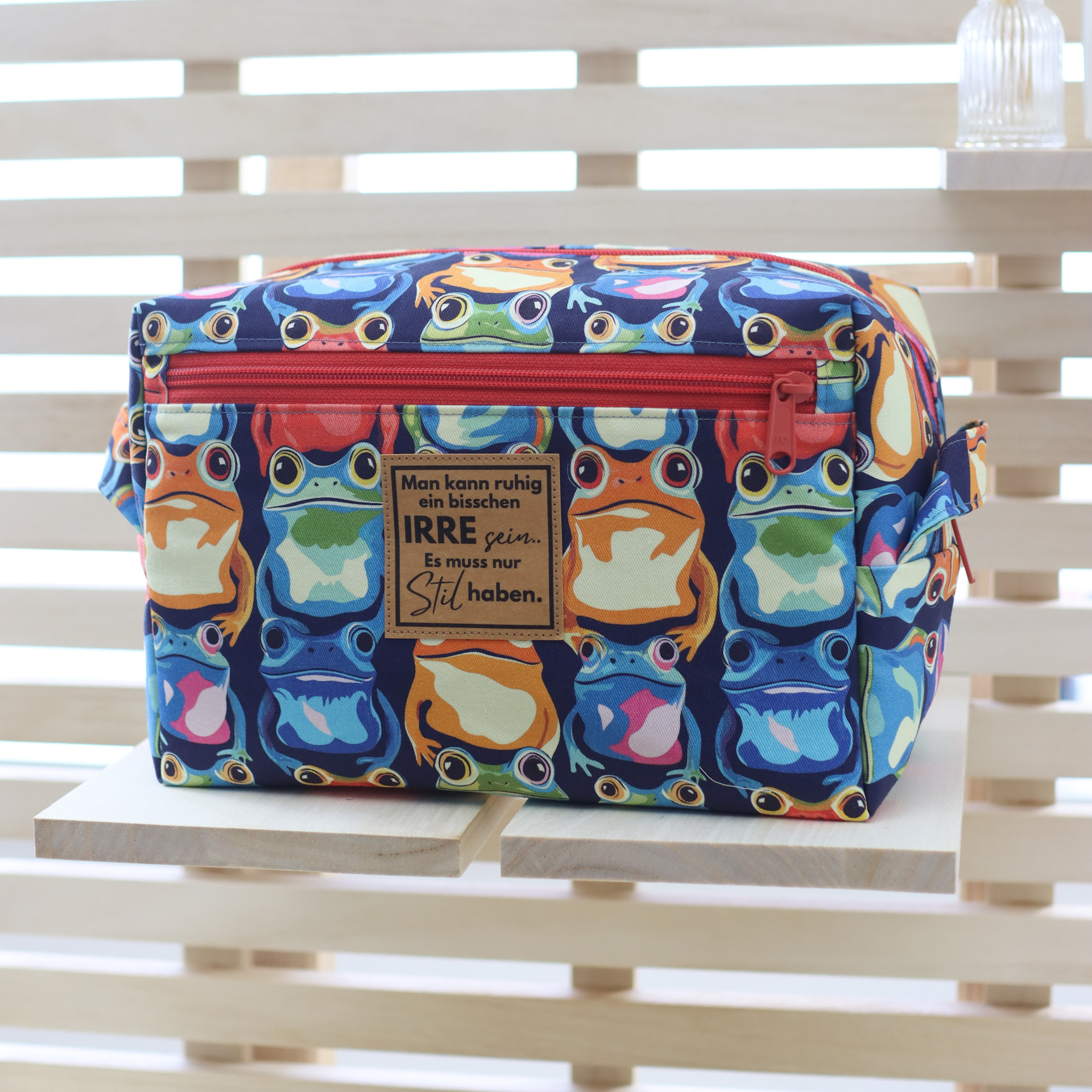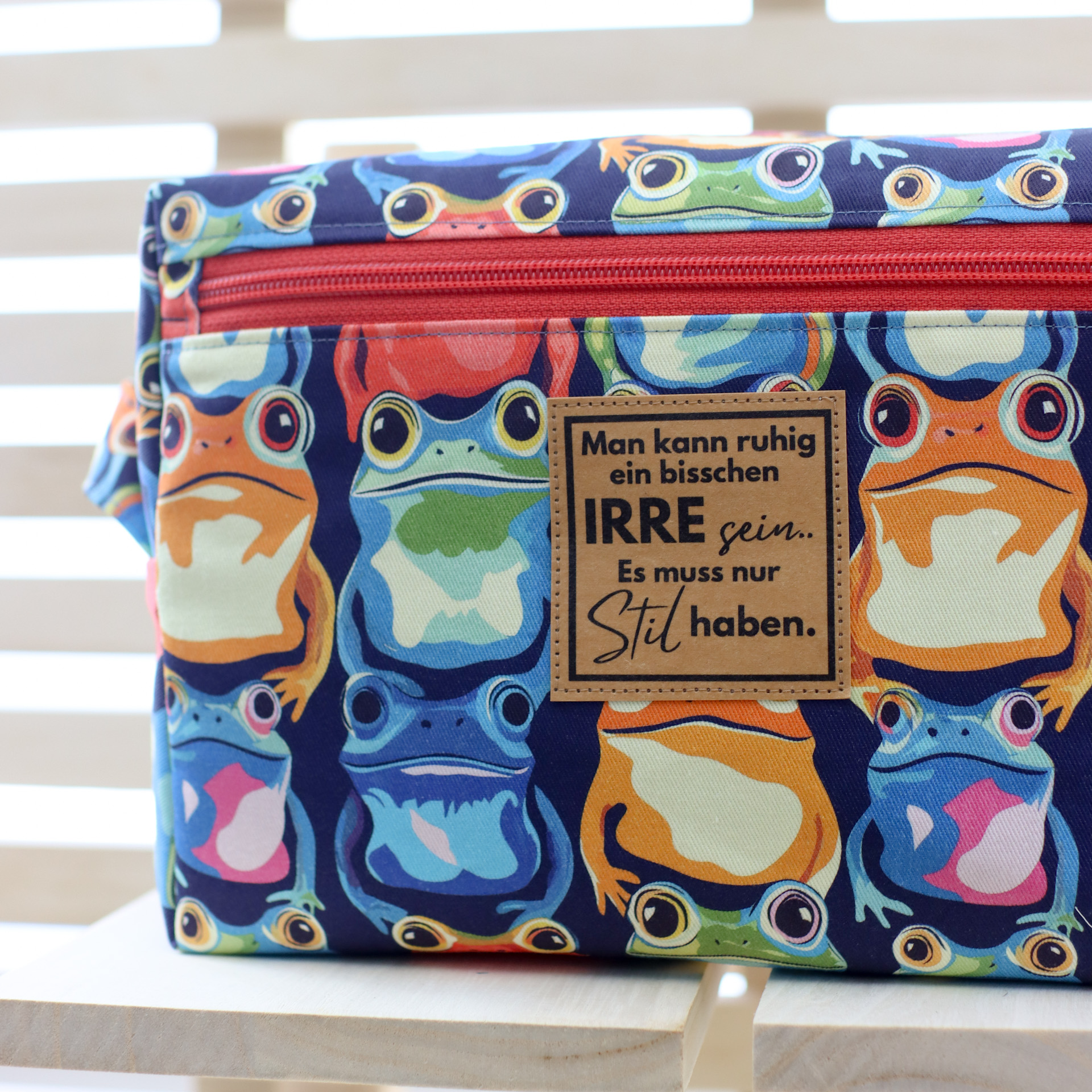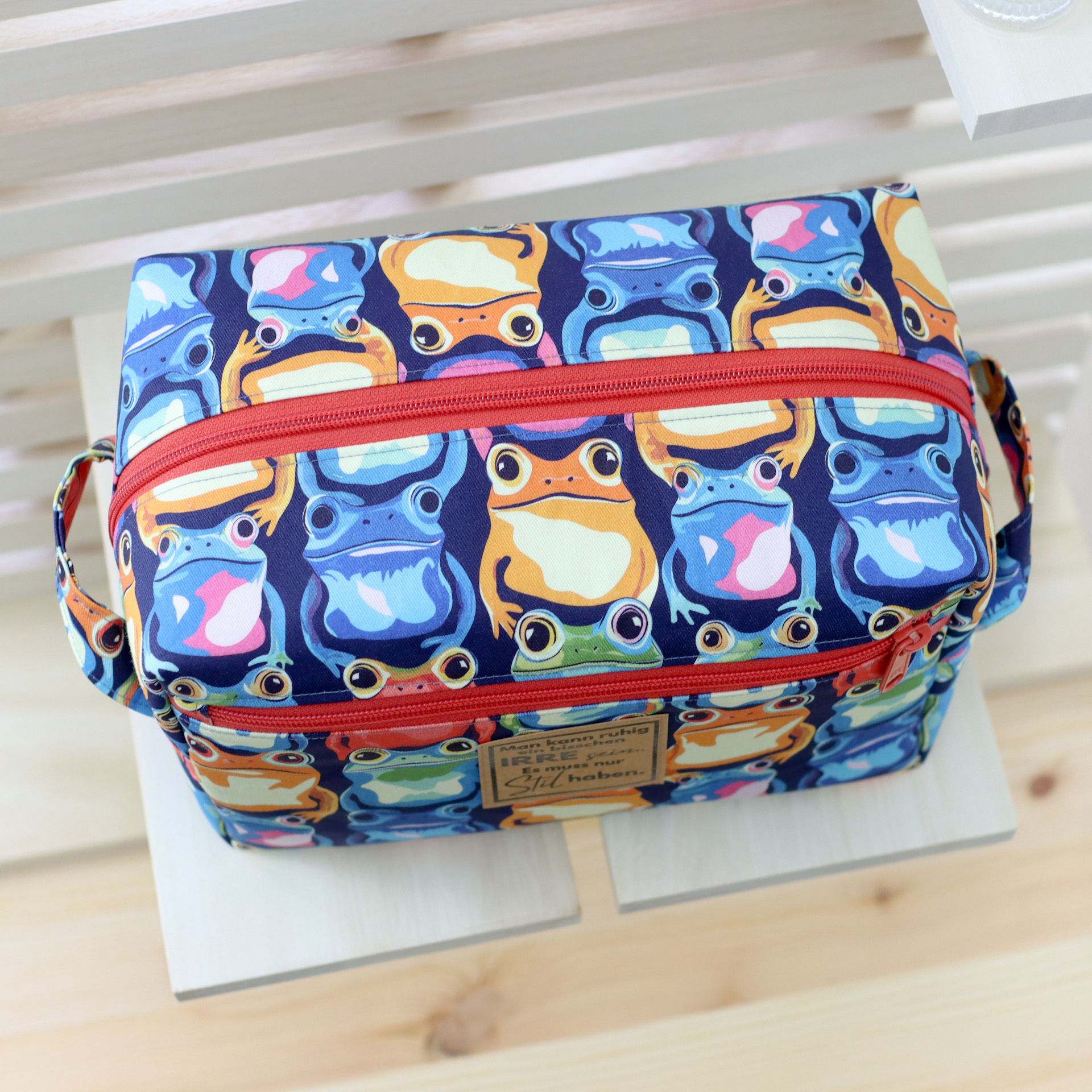 - Außen ein fester, farbenfroher Canvas mit Fröschen