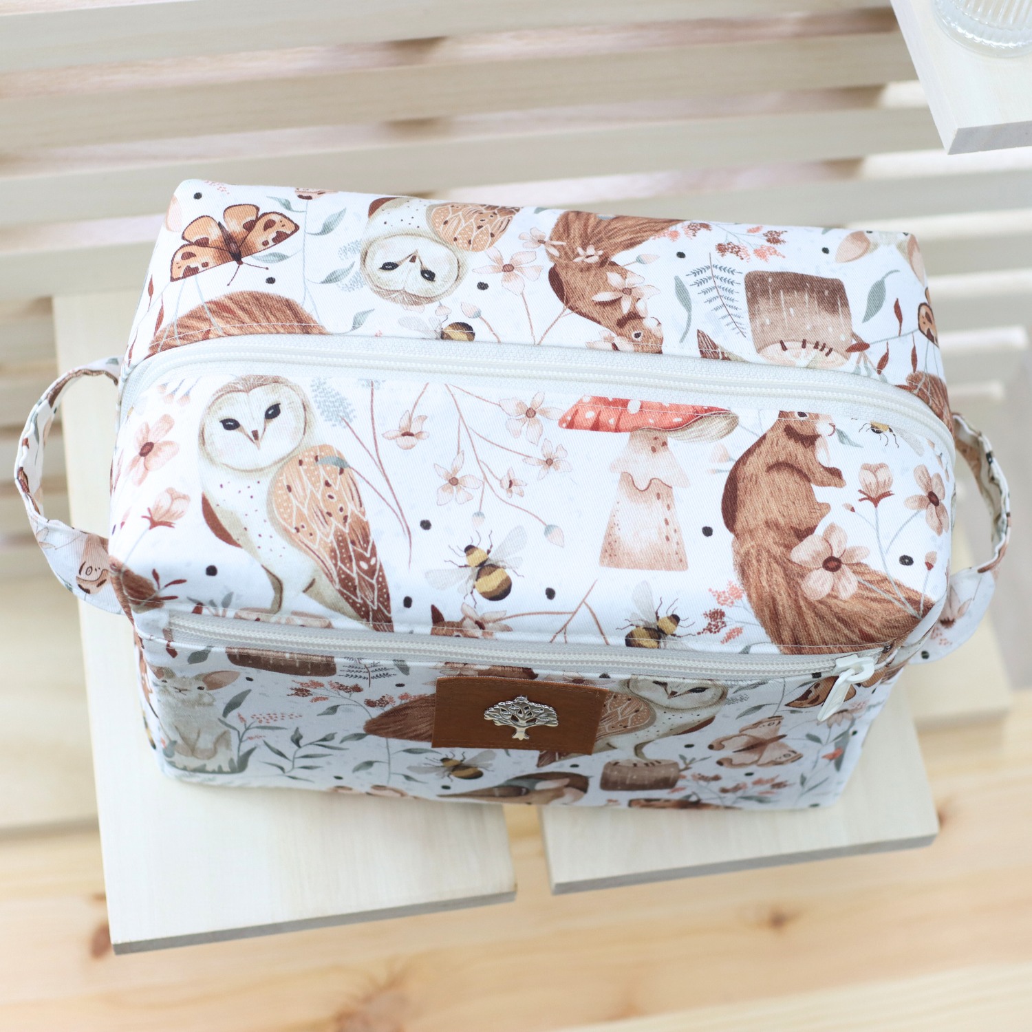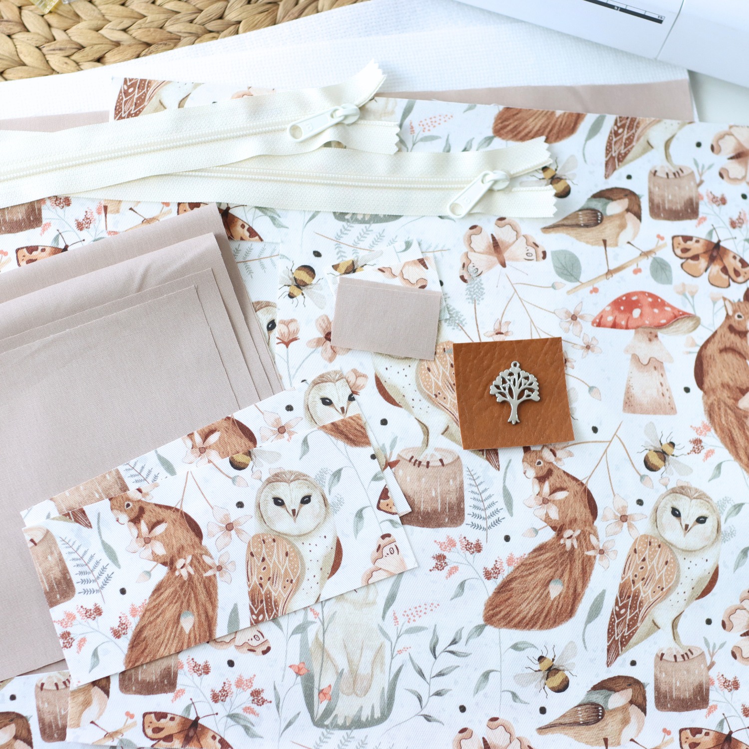 - Außen ein fester, heller Canvas mit süßen Waldtieren und floralen Motiven