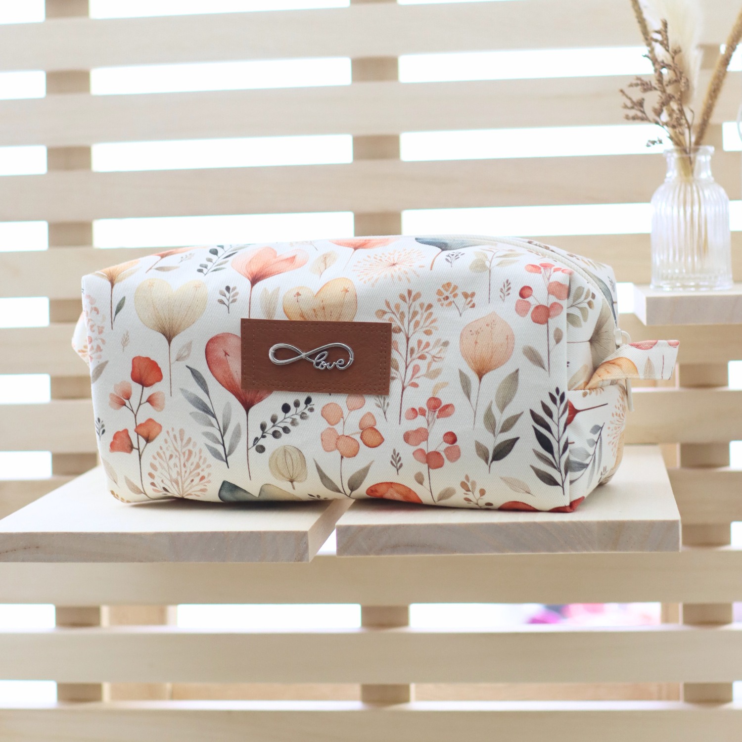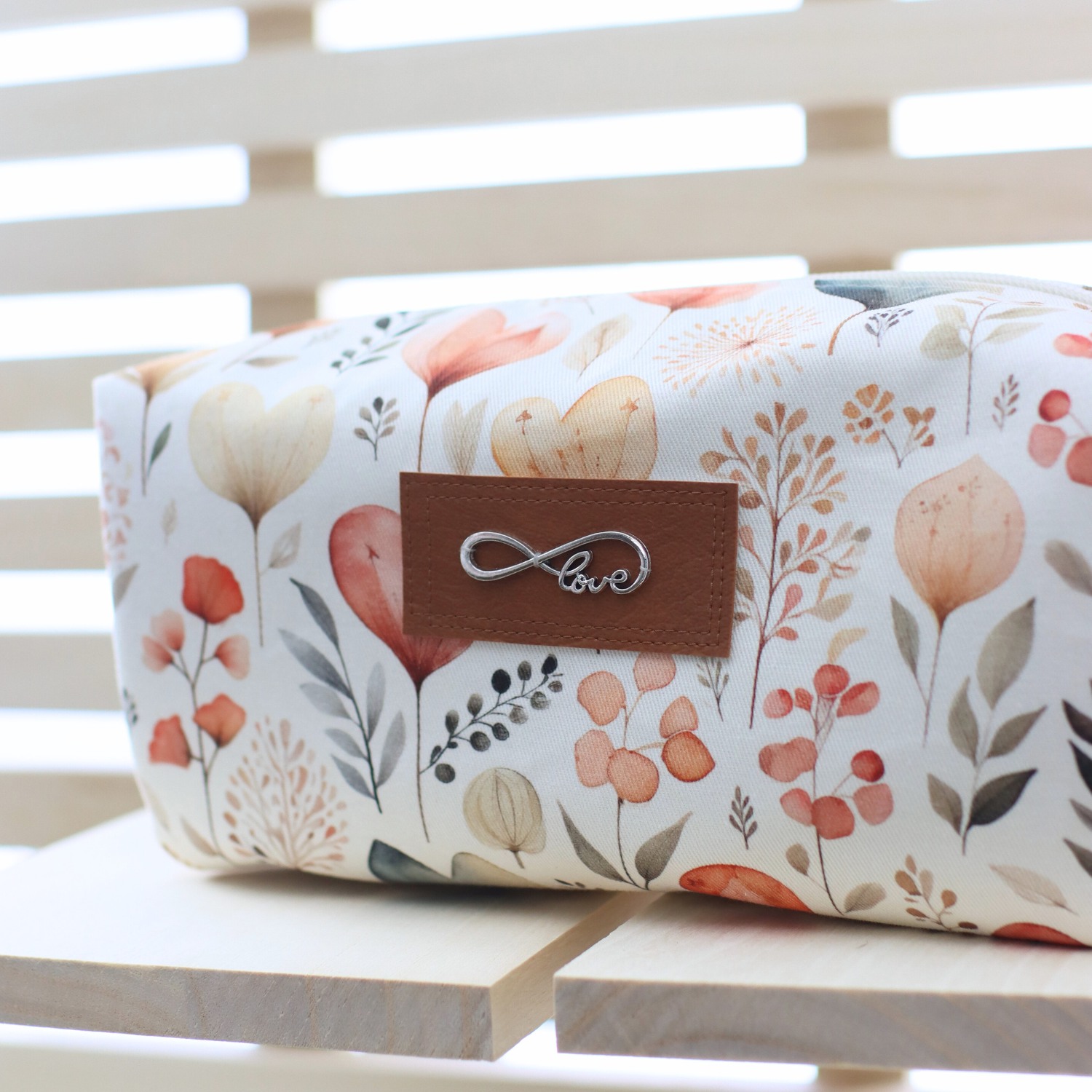 - Außen ein cremefarbener, fester Canvas mit floralen Motiven und Herzen