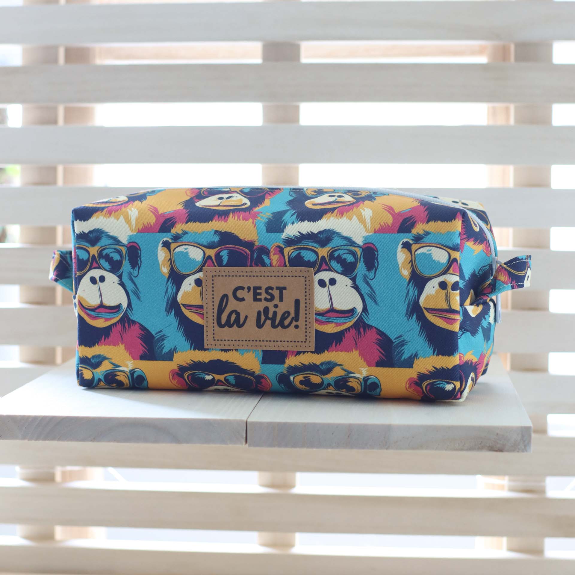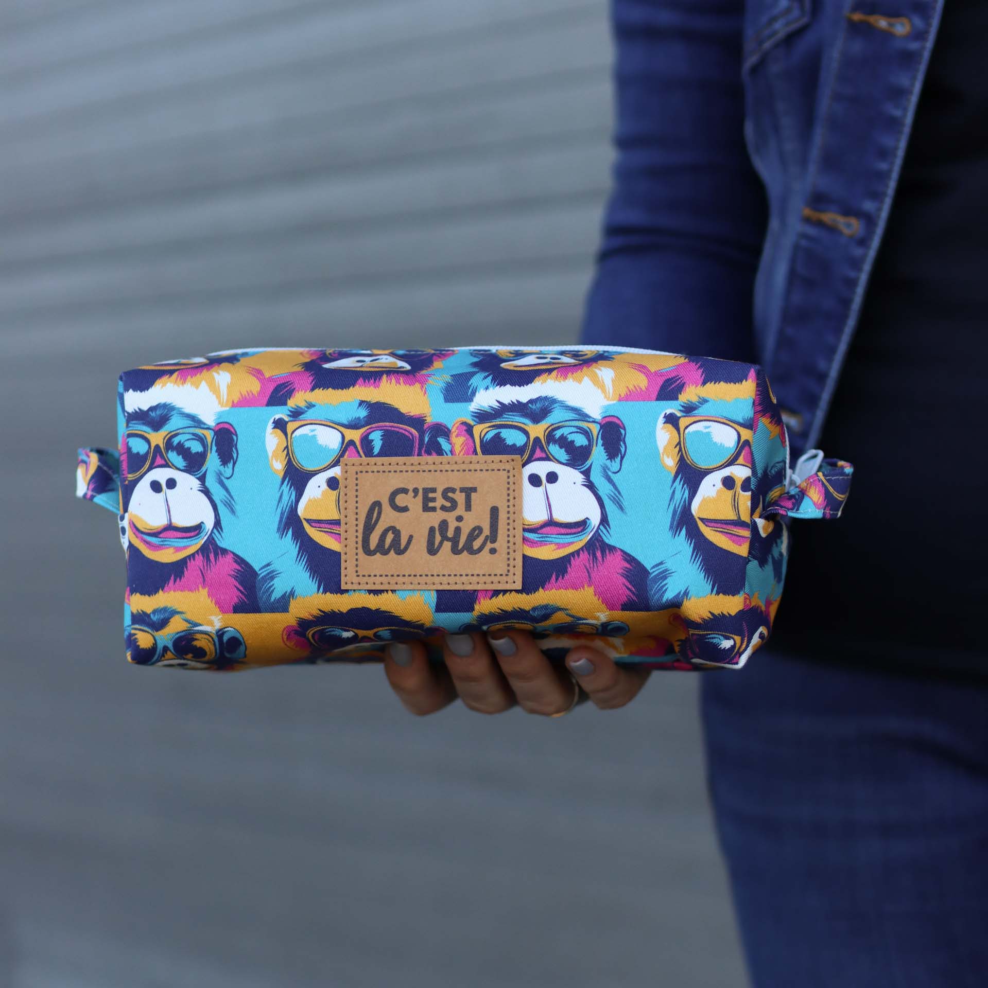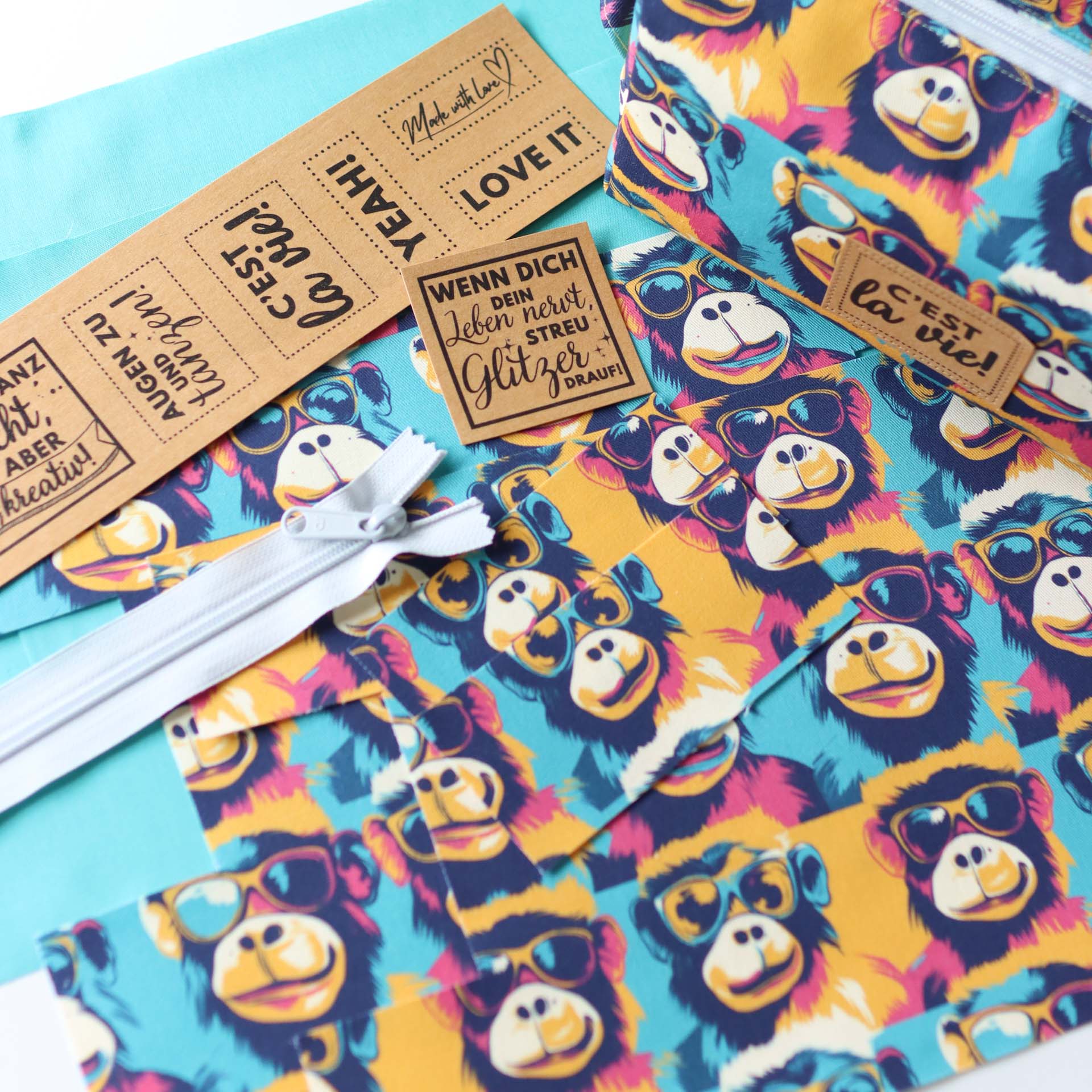 - Außen ein fester, farbenfroher Canvas mit coolen Affen