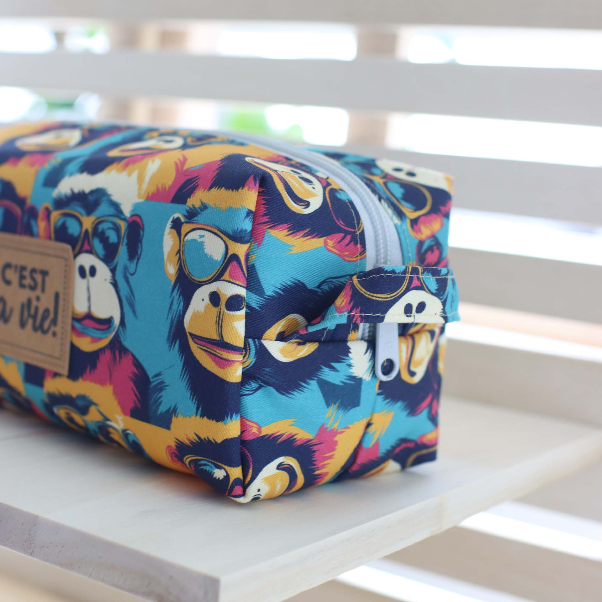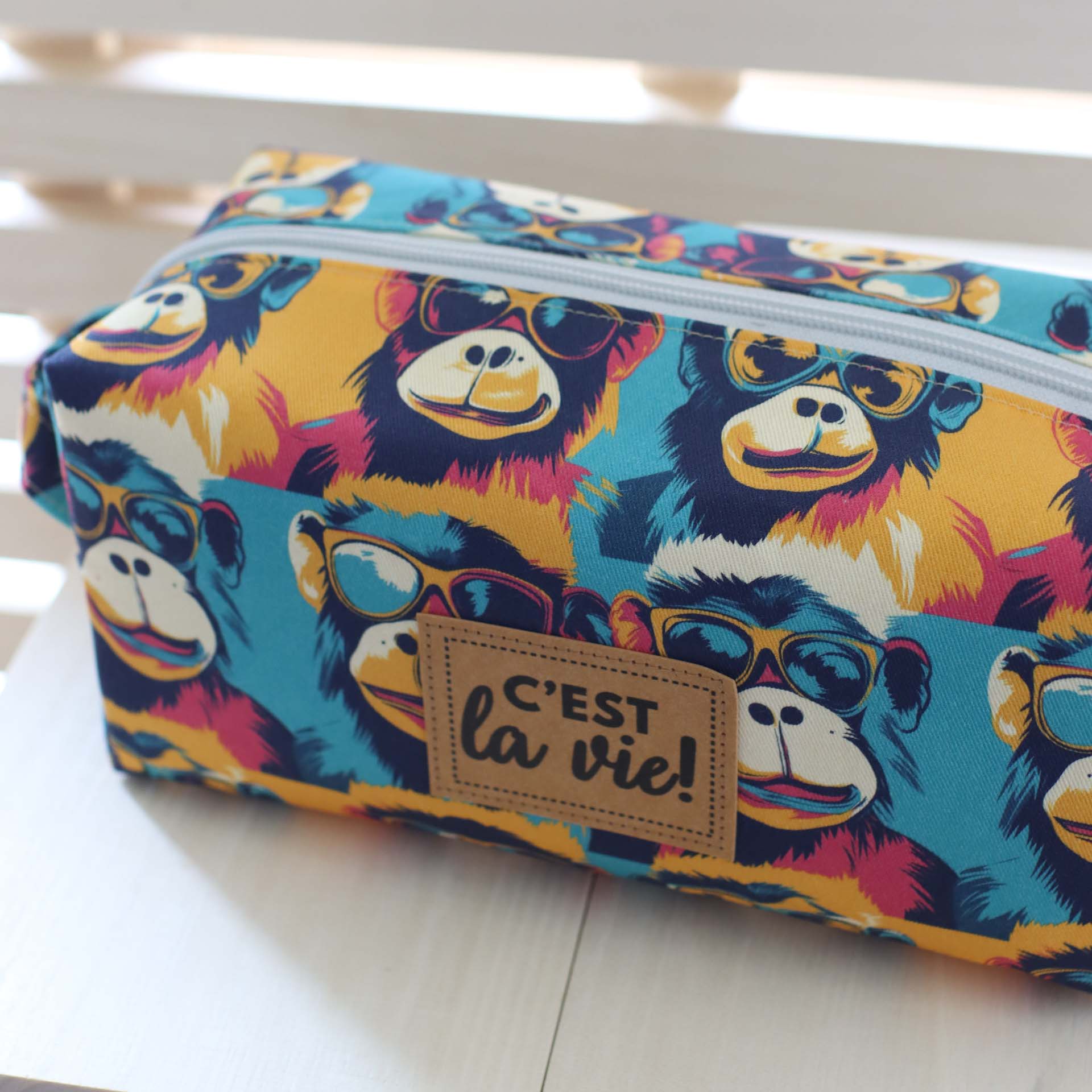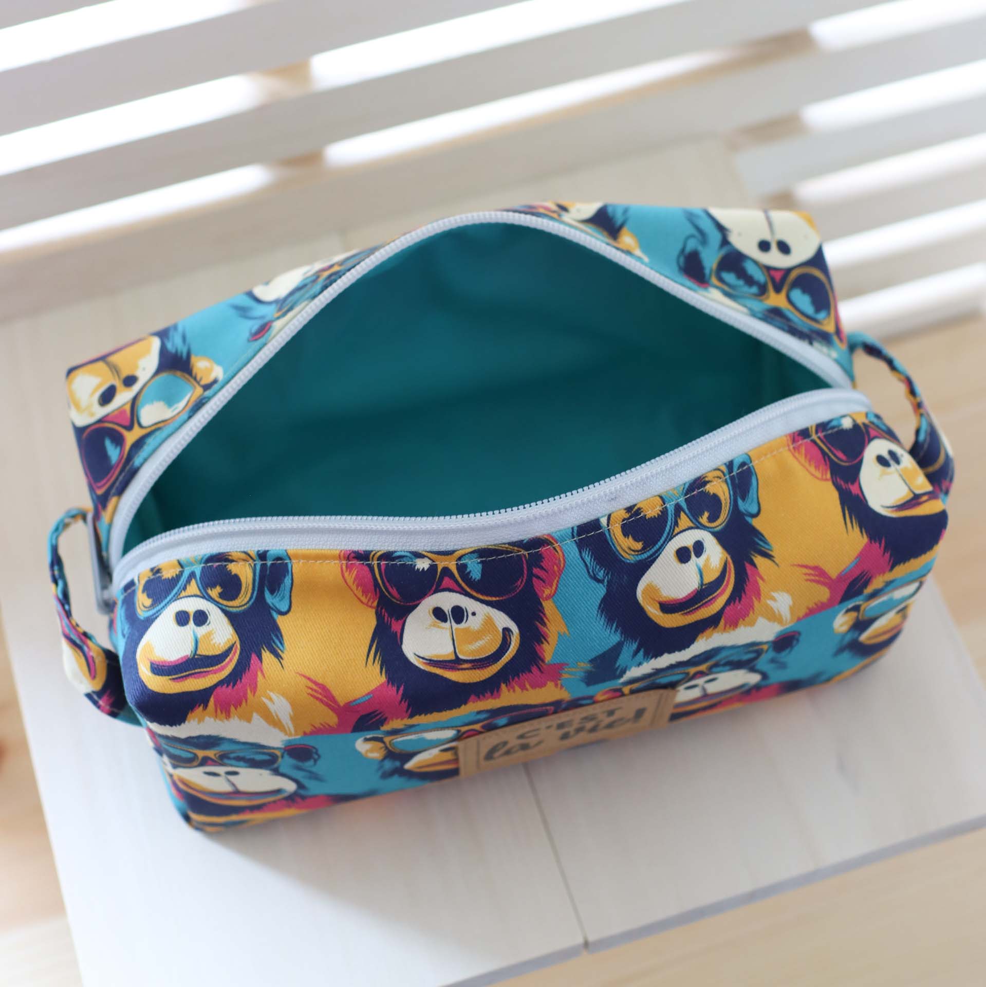 - Außen ein fester, farbenfroher Canvas mit coolen Affen