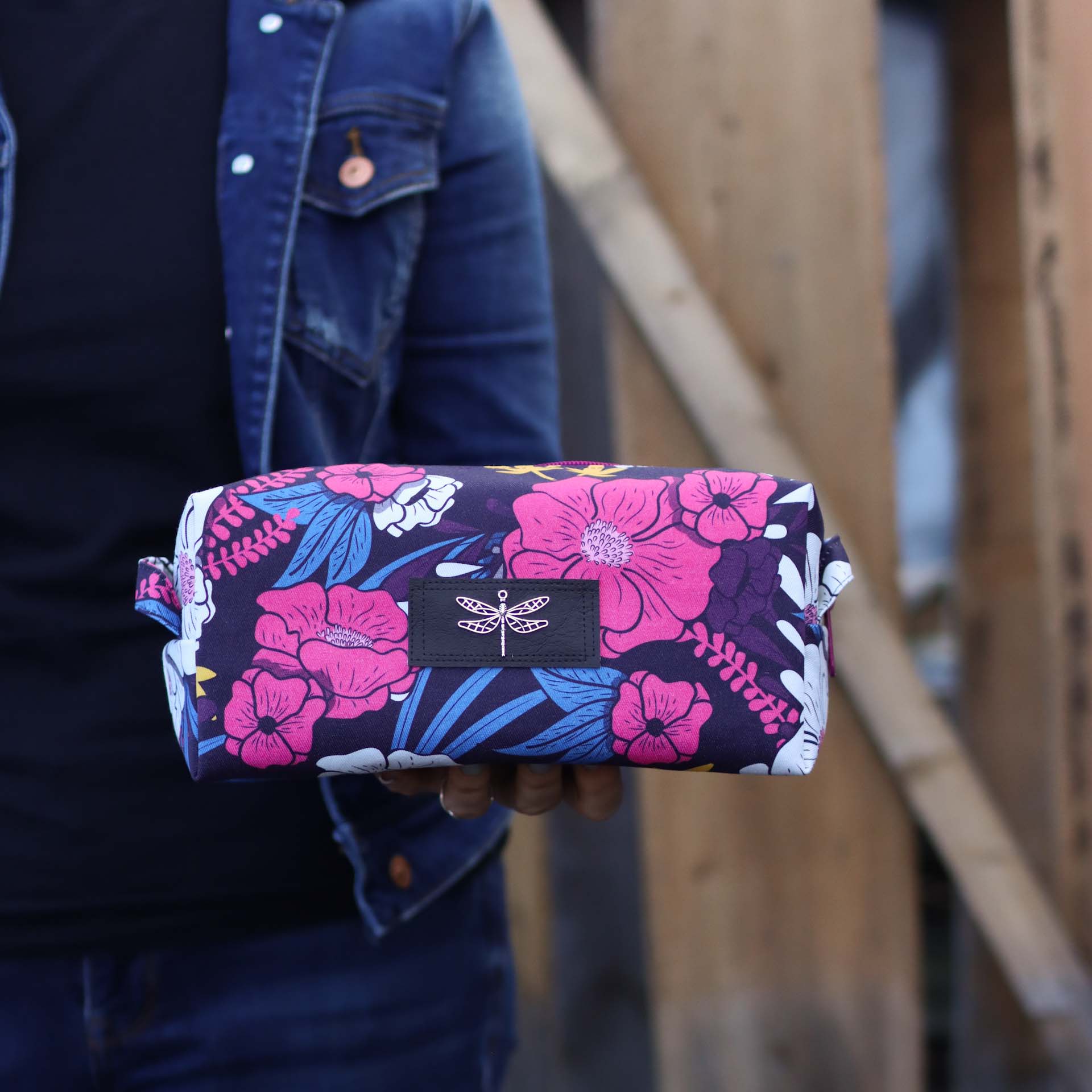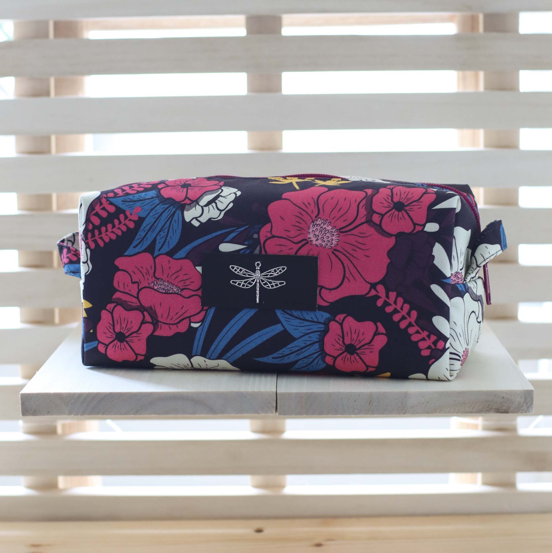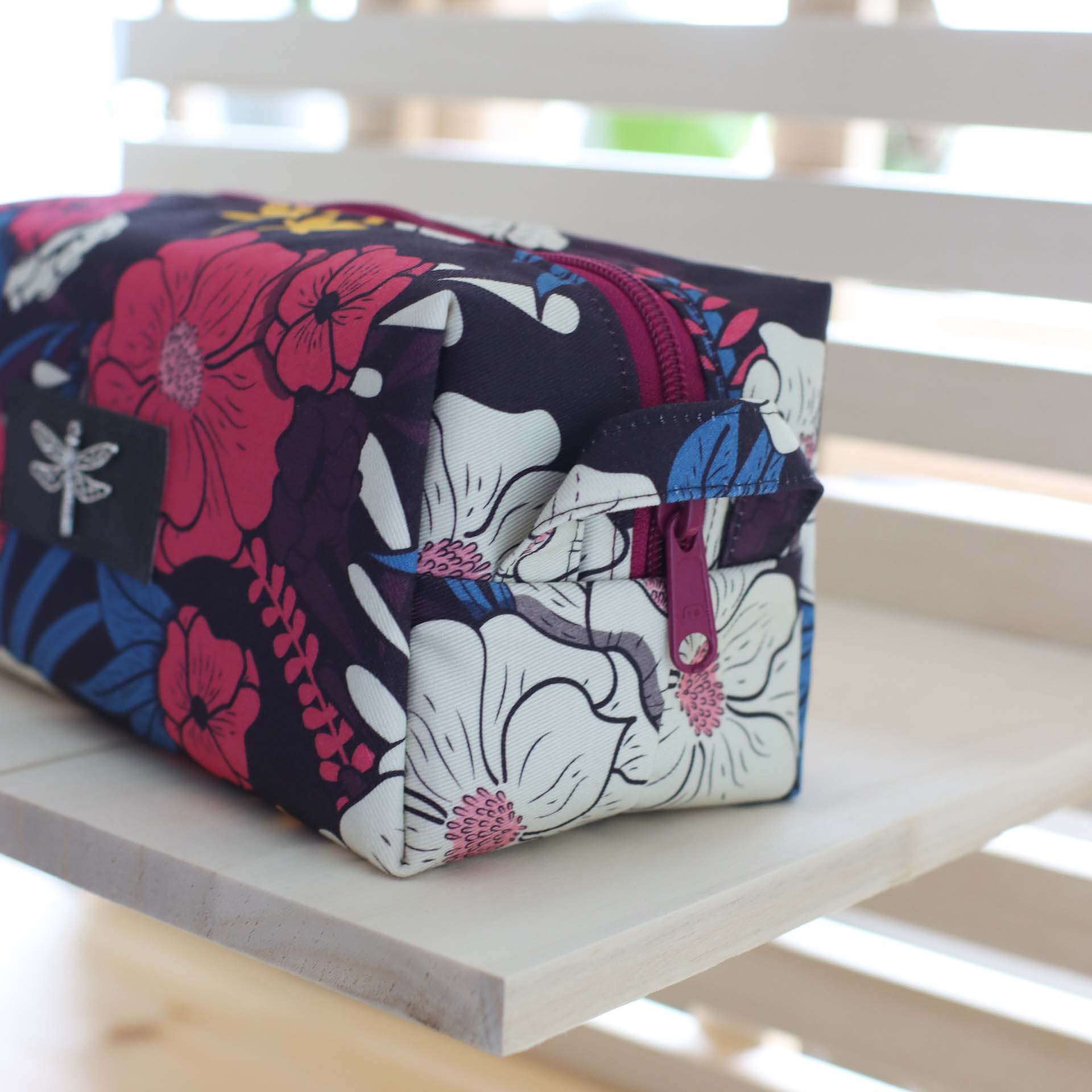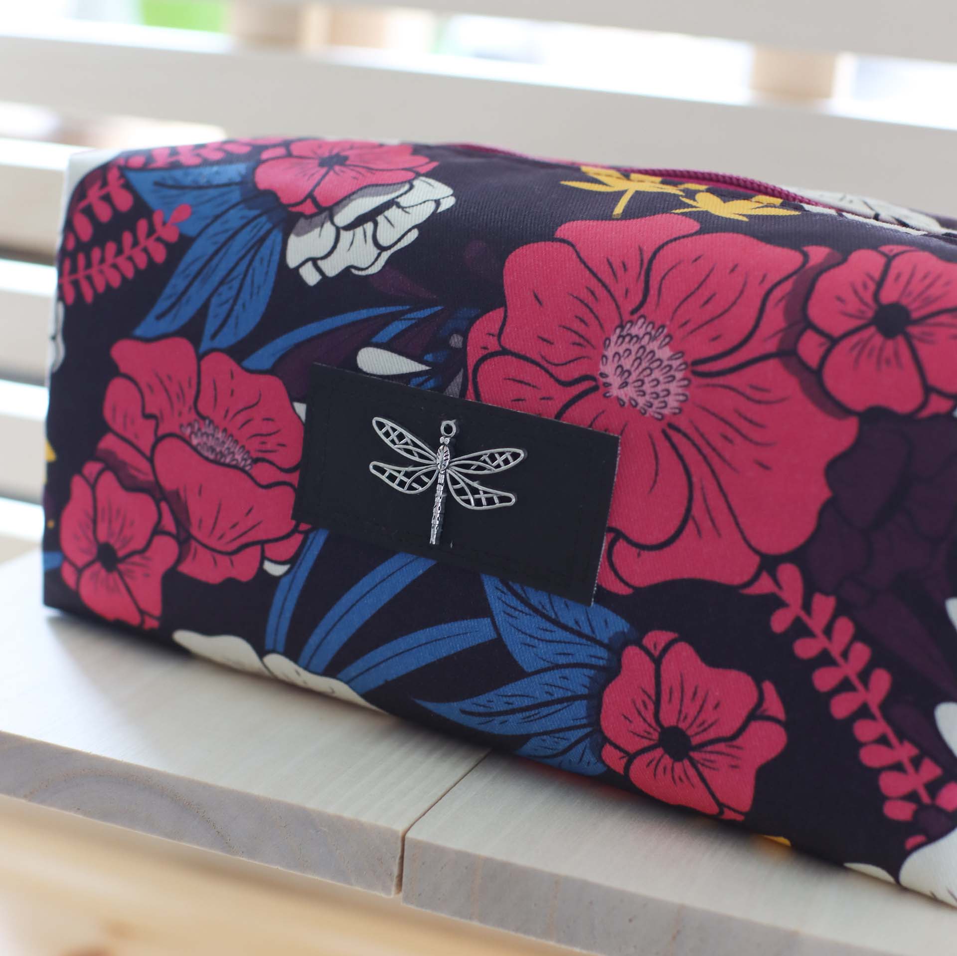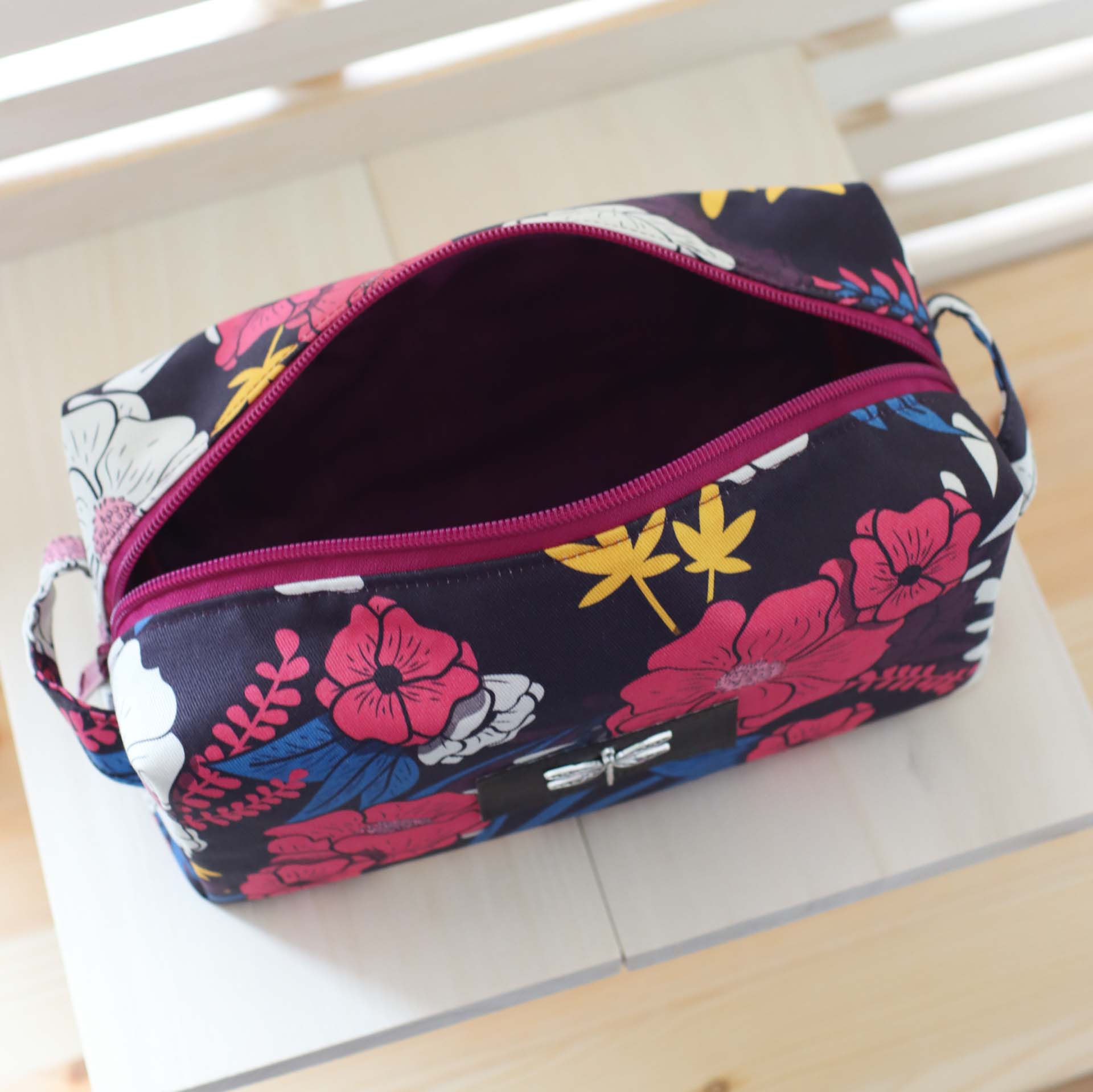 - Außen ein fester, dunkel-weinroter Canvas mit lebendigem Blütenprint