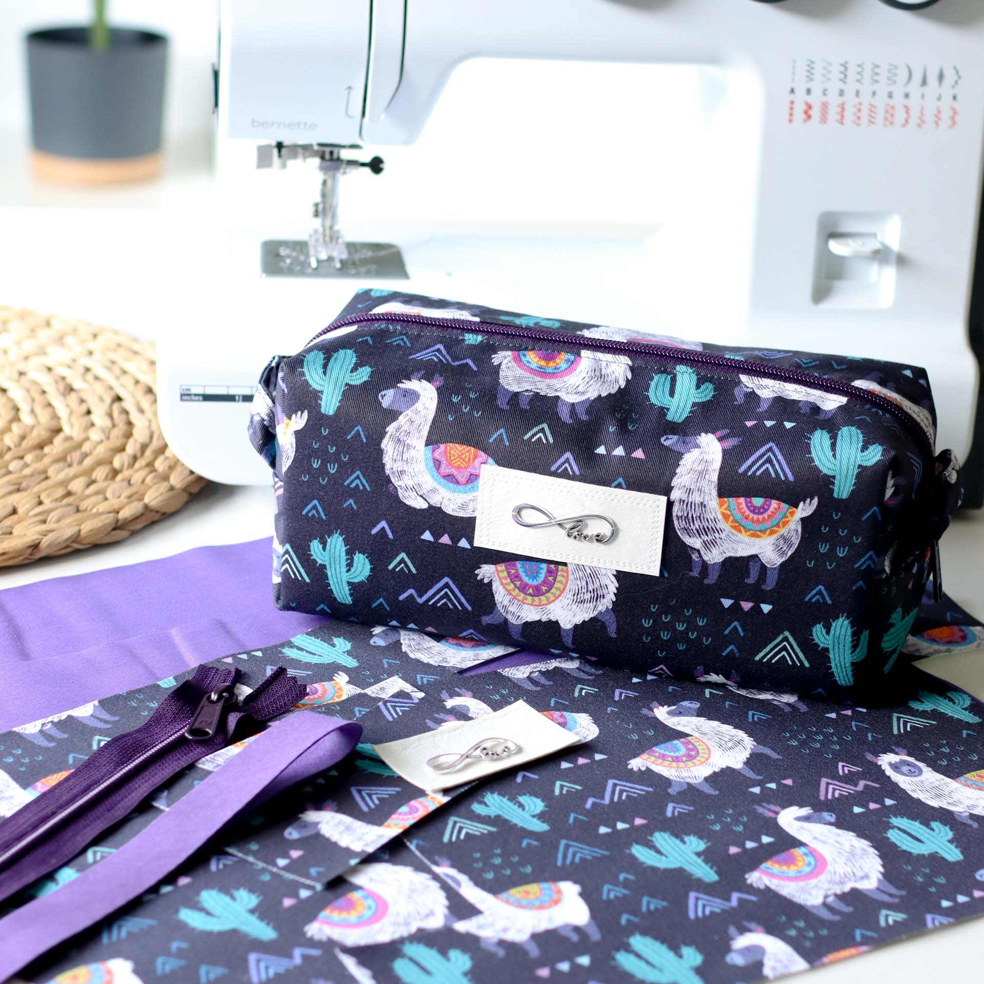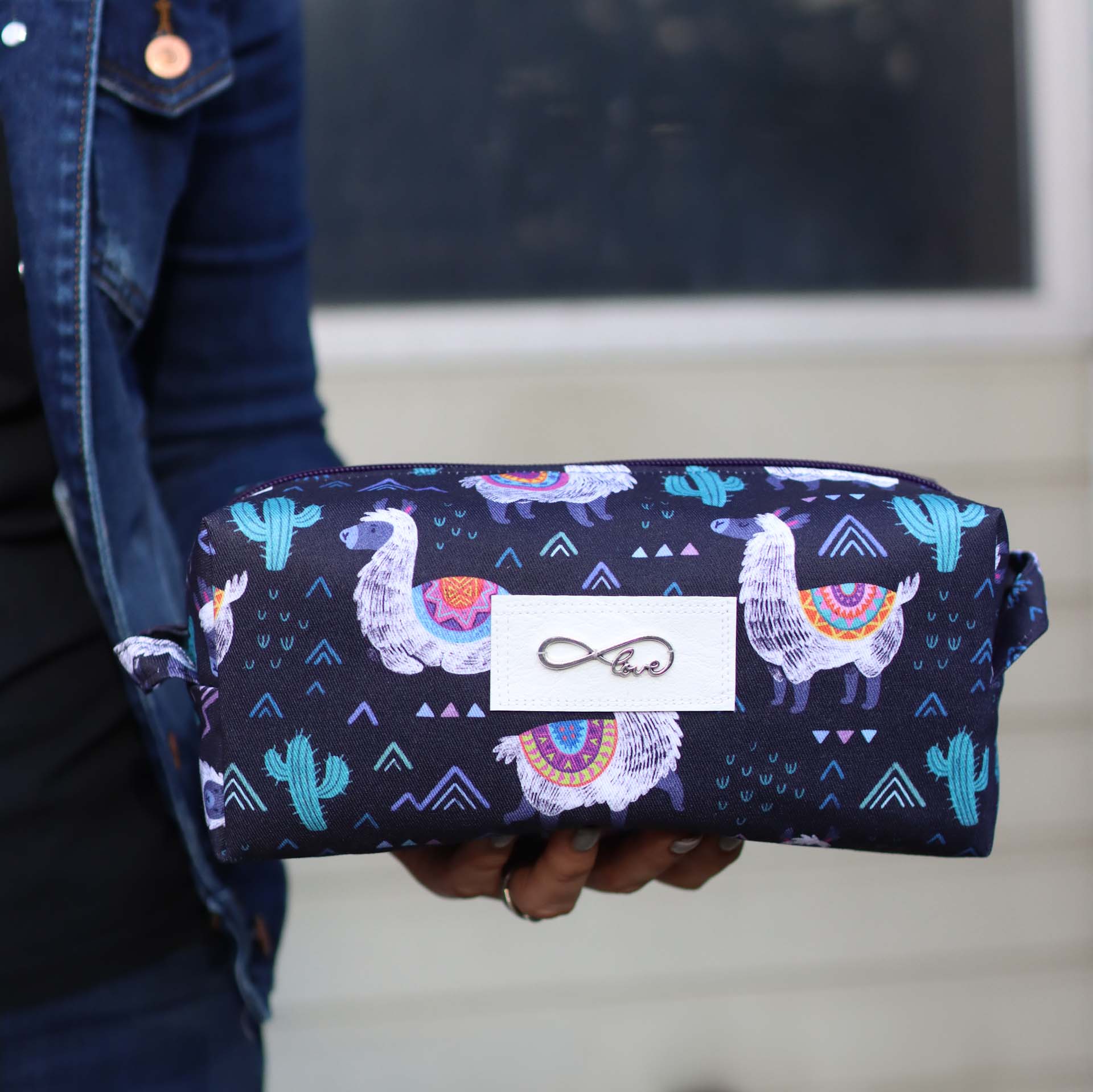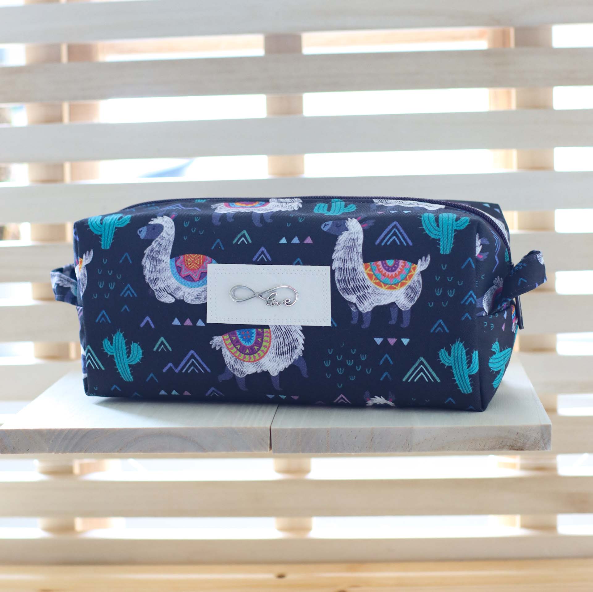 - Außen ein fester, schwarzblauer Canvas mit süßen Lamas, Kakteen und geometrischen Formen