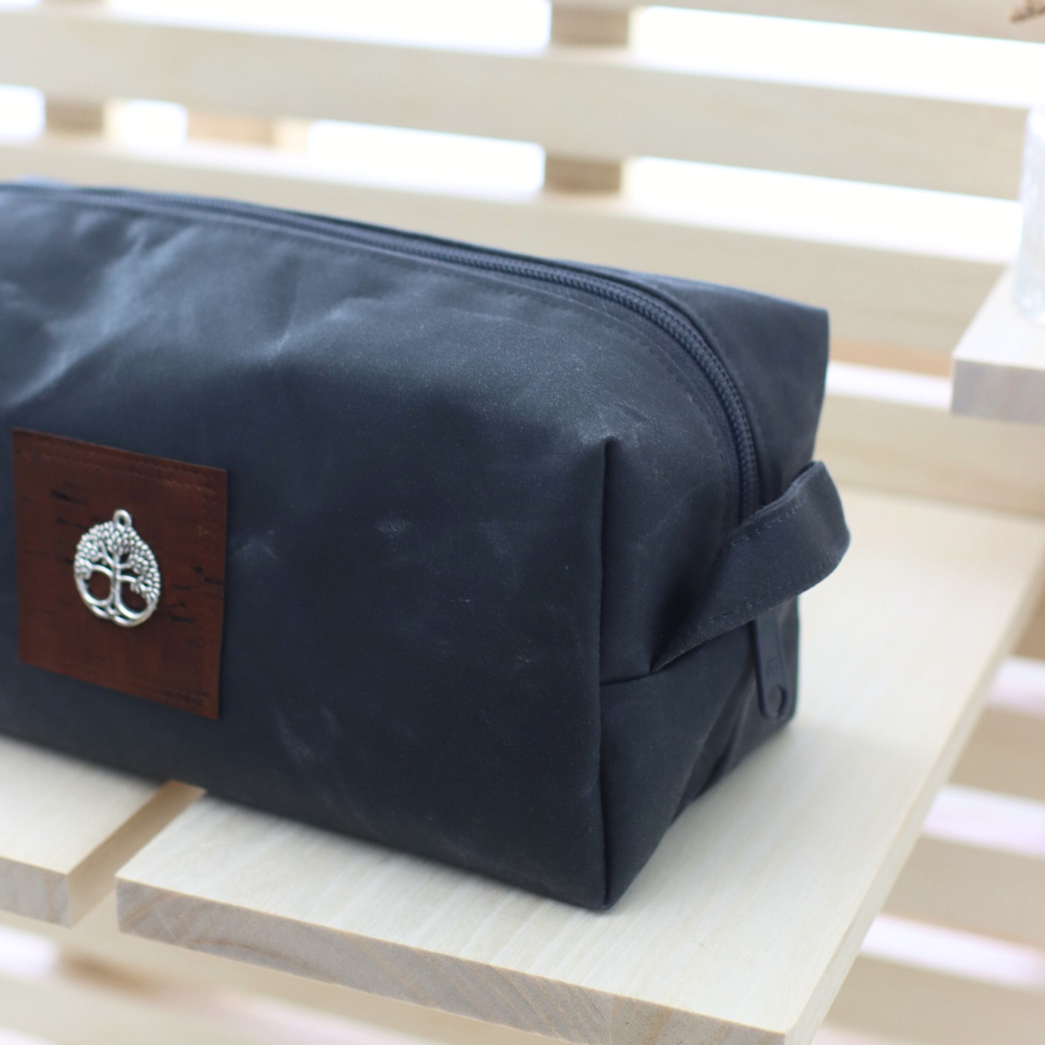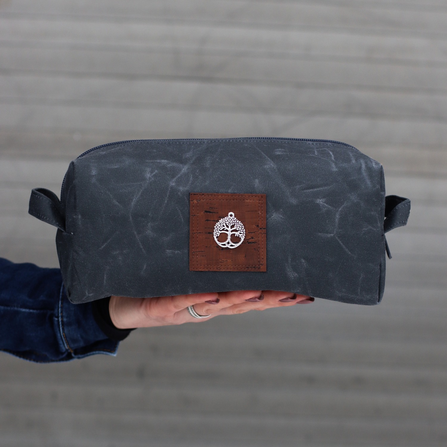 Außentasche aus Canvas, Oilskin oder Outdoorstoffen mit einem Patch aus Kunstleder oder Kork und einem Metall-Anhänger