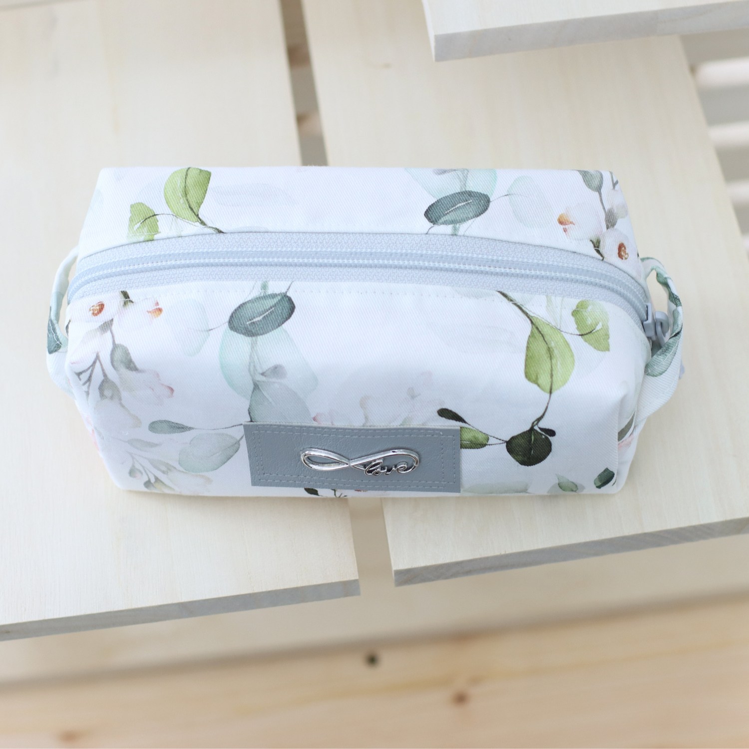 - Außen ein heller Canvas mit Eukalyptusblättern und Blüten