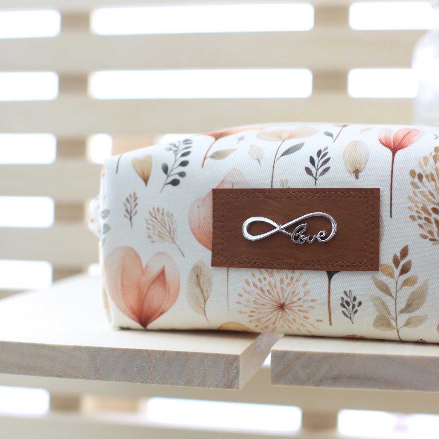 - Außen ein cremefarbener, fester Canvas mit floralen Motiven und Herzen