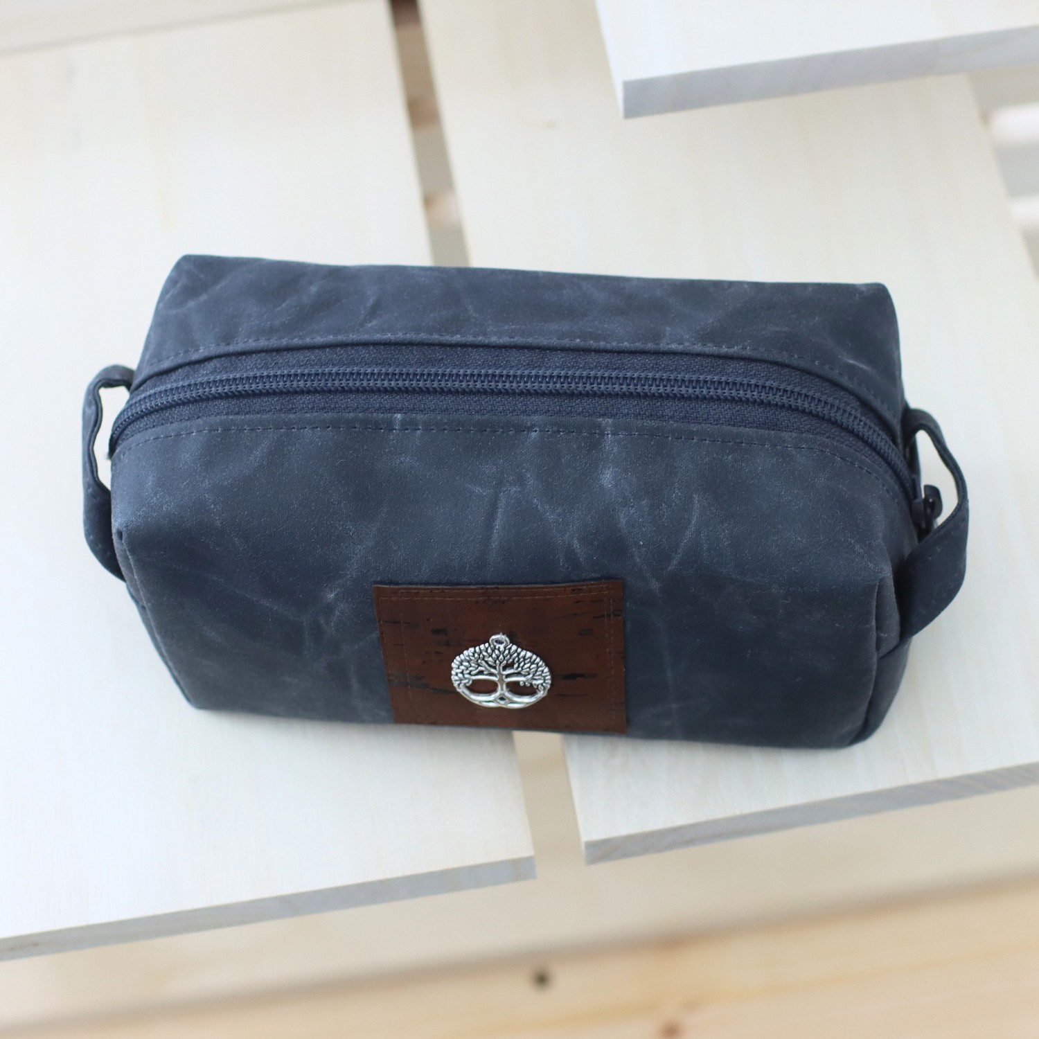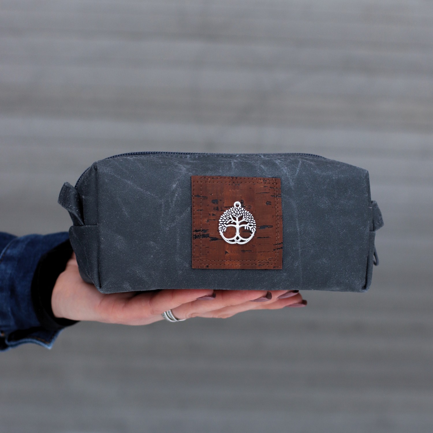 - Außentasche aus Oilskin, Canvas oder Outdoorstoffen mit einem Patch aus Kunstleder oder Kork und einem Metall-Anhänger