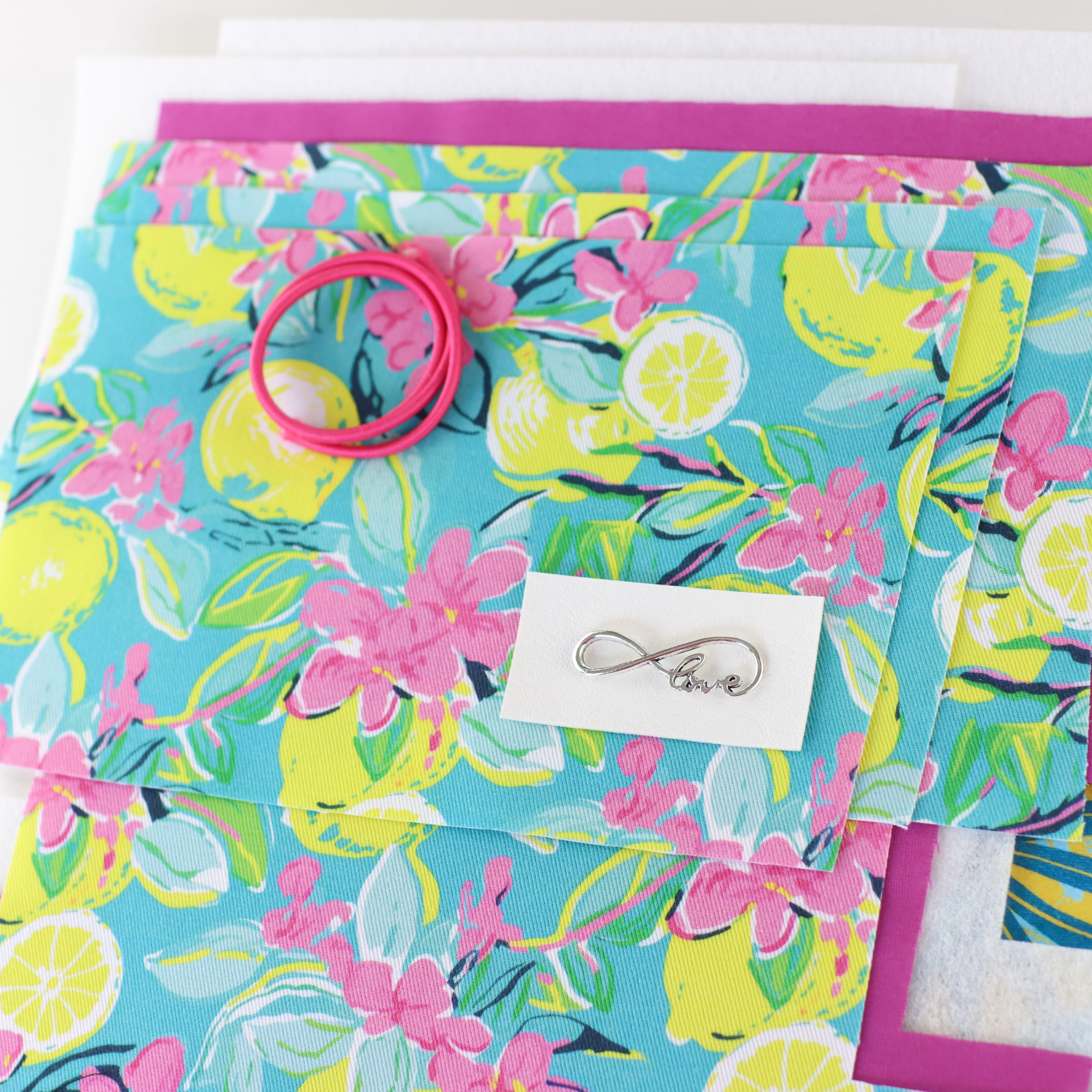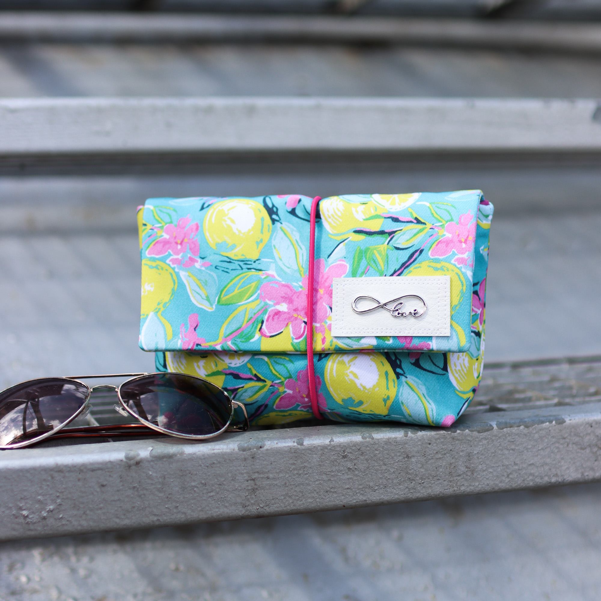 - Außen ein türkiser, farbenfroher Canvas mit Zitronen und Blüten