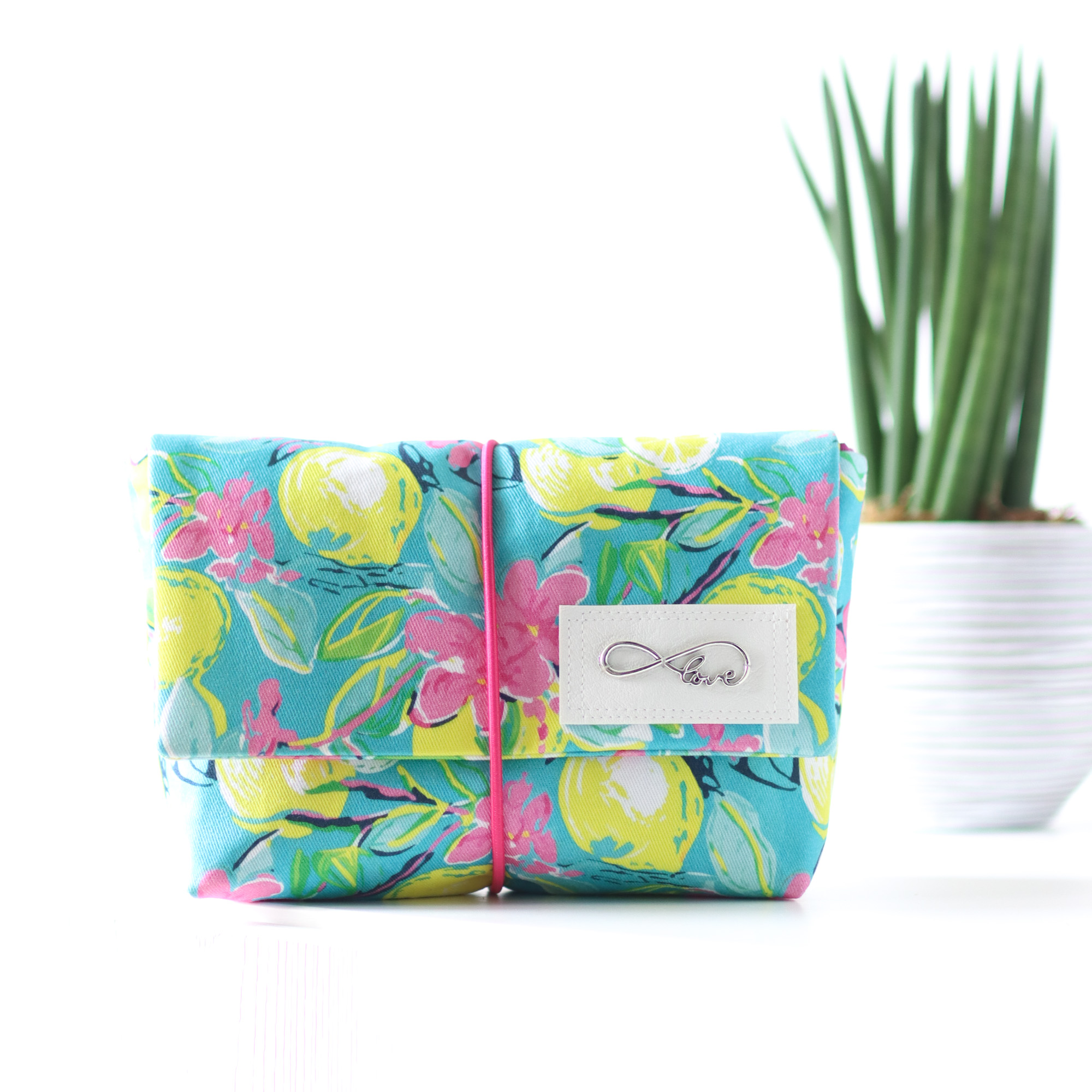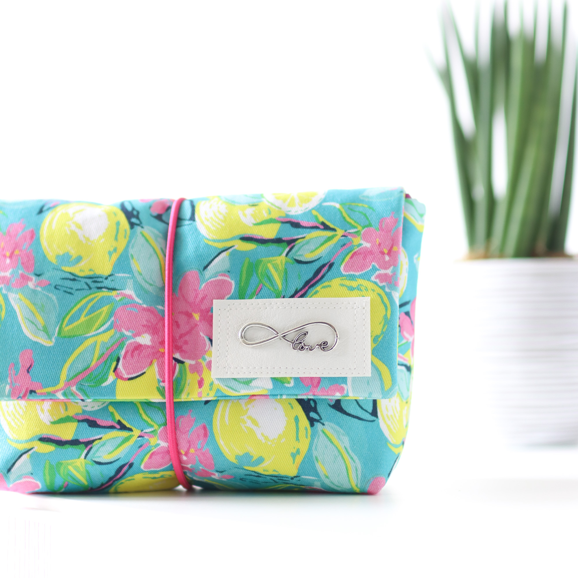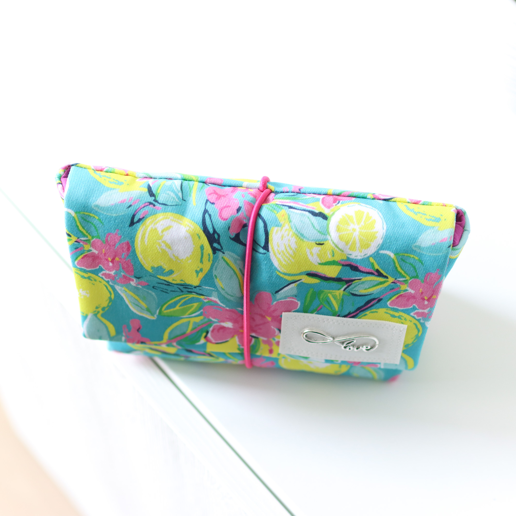 Mit ihrer praktischen Größe von 16cm Breite, 7cm Tiefe und 12cm Höhe passt sie in jede Handtasche. Die Klappe sorgt dafür, dass an seinem Platz bleibt und wird mit dem eingenähten Gummiband fixiert.