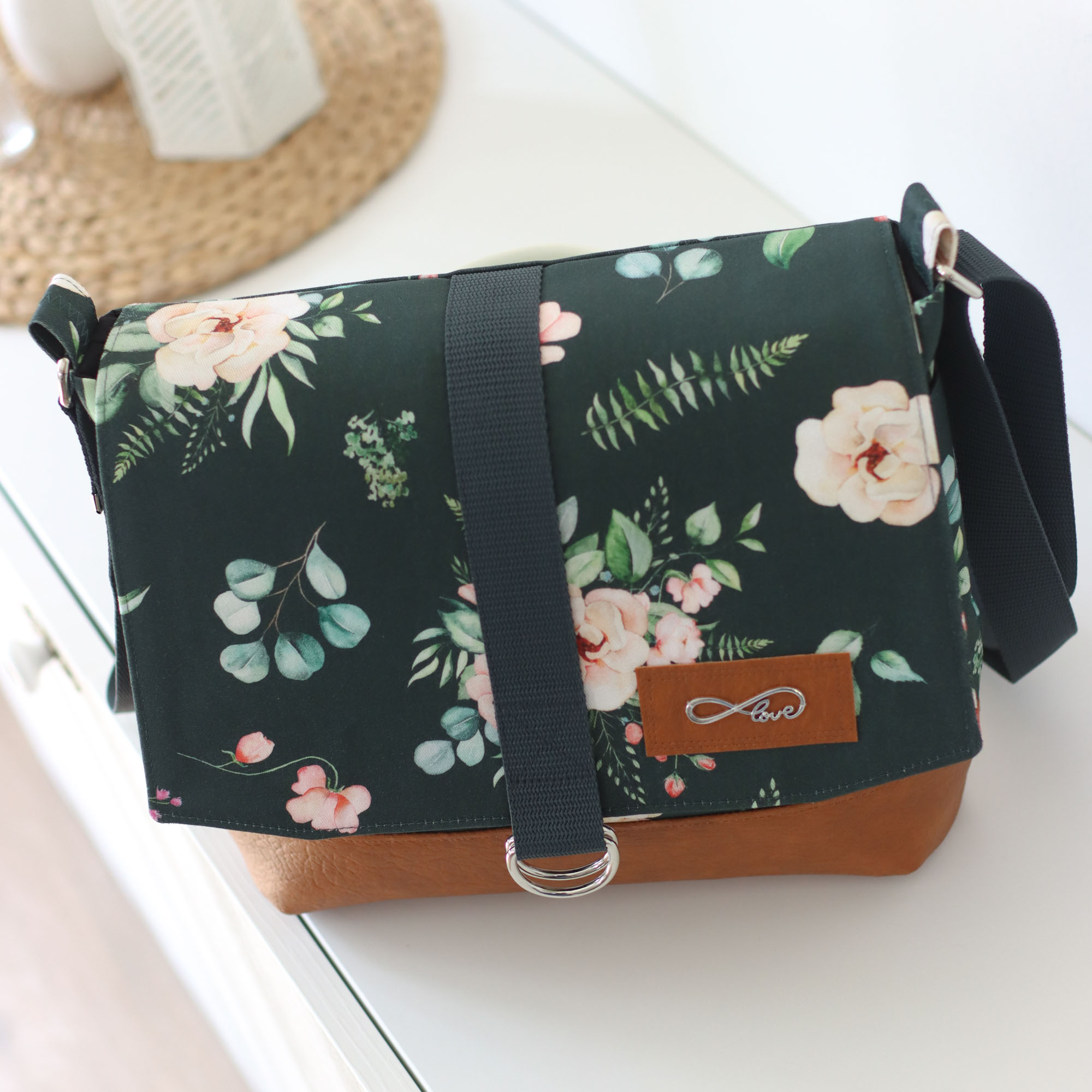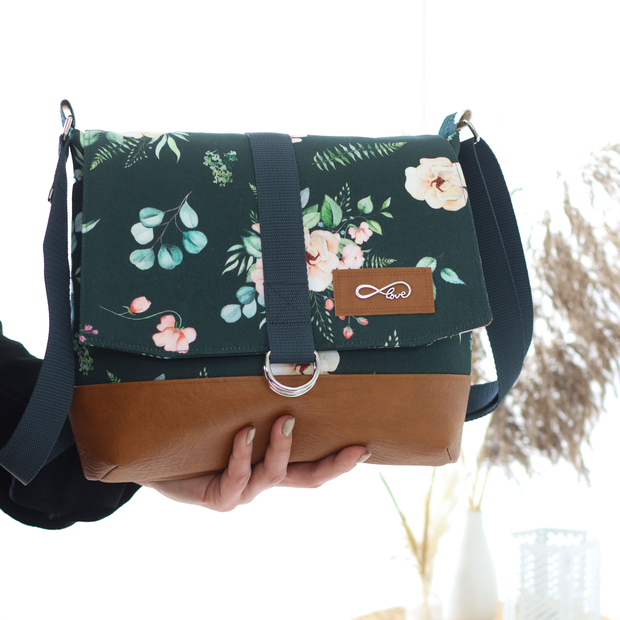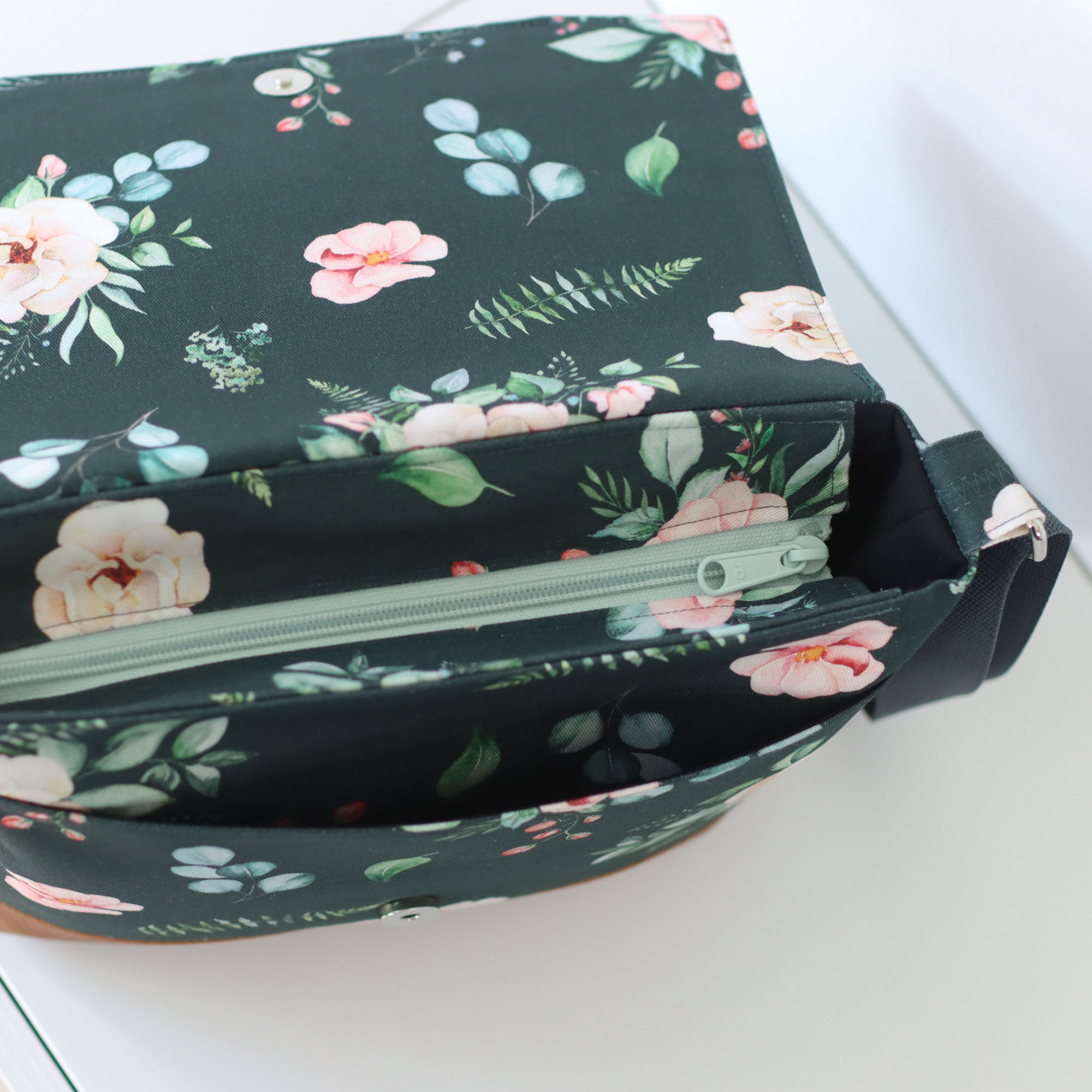 - Außen ein dunkelgrüner, fester Canvas mit Aquarell-Blüten
