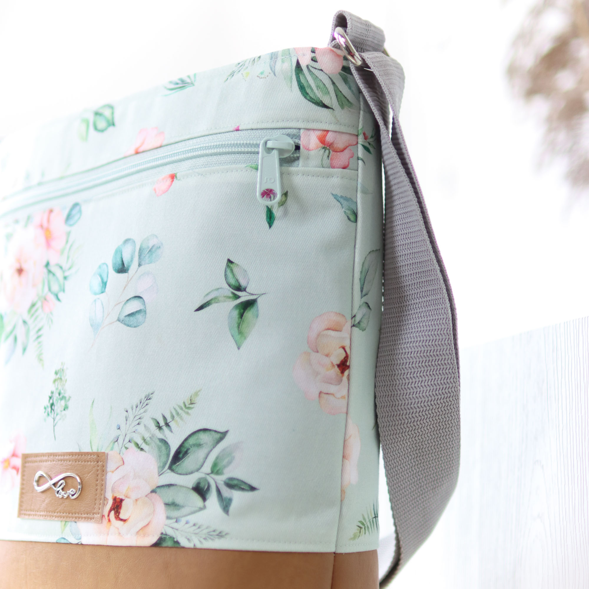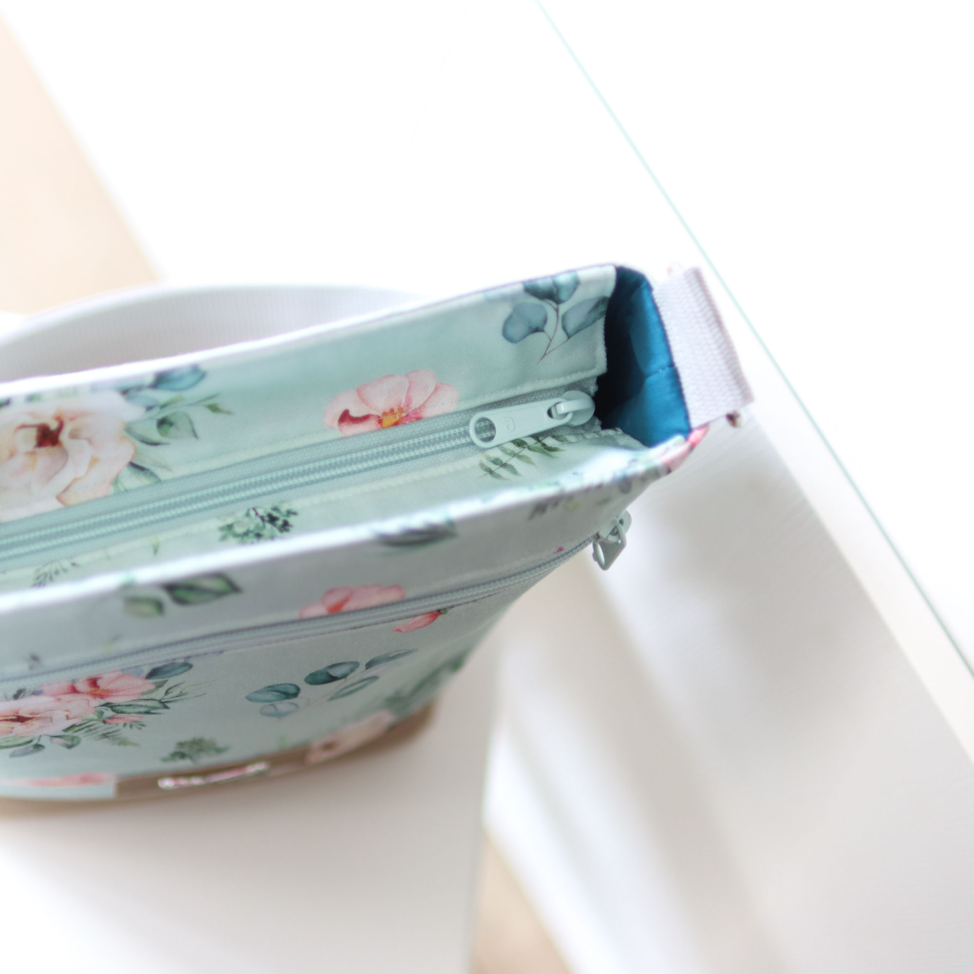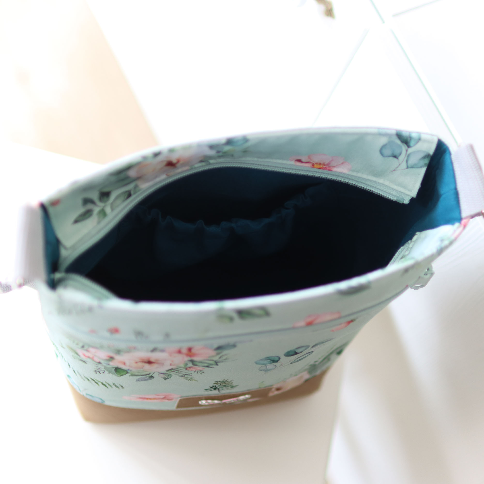 - Außen ein mintfarbener, fester Canvas mit Aquarell-Blüten