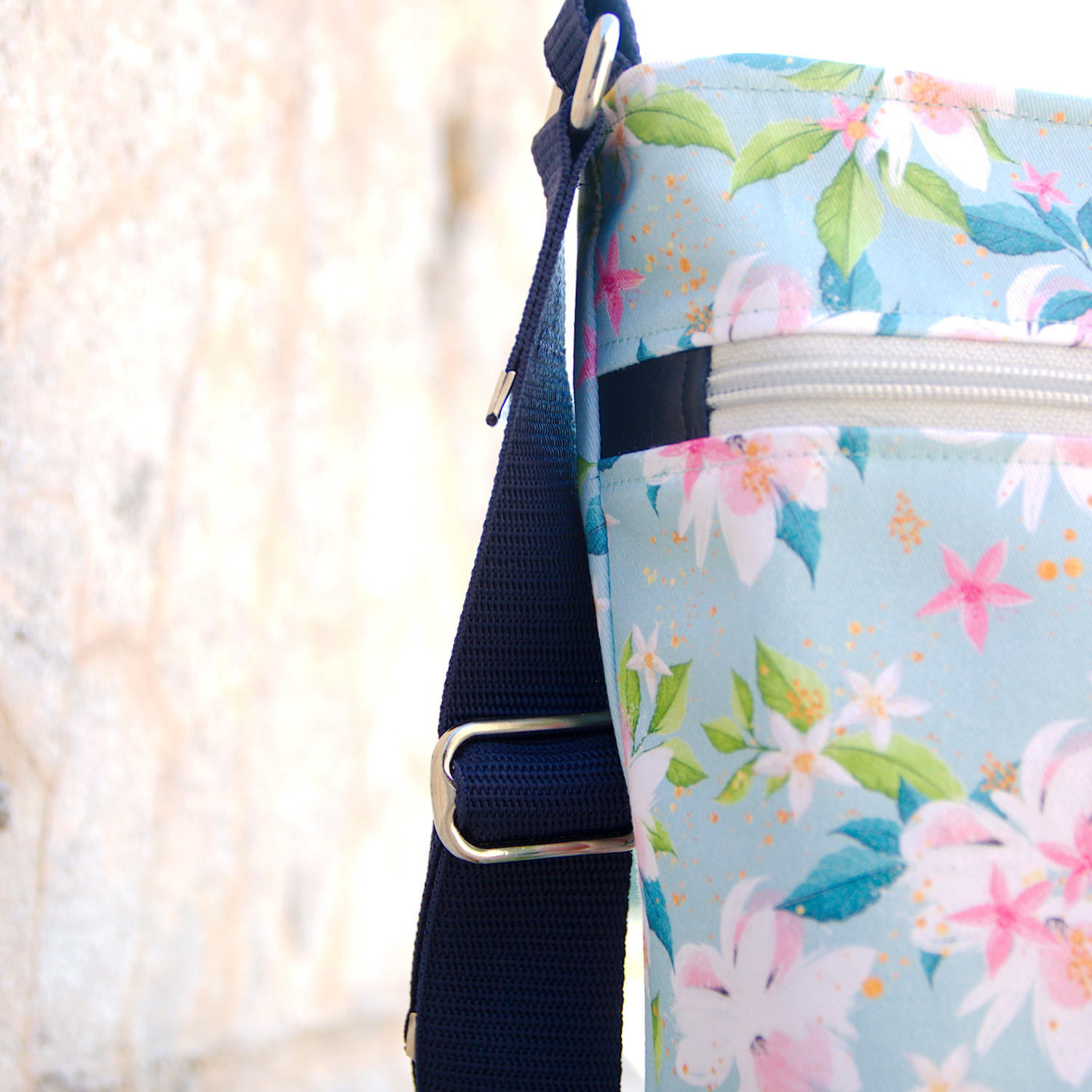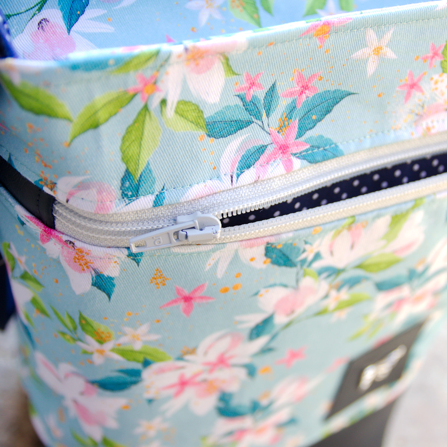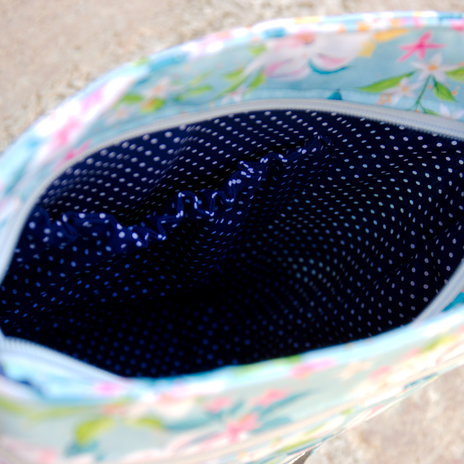 - Außen ein fester, hellblauer Canvas mit sommerlichem Blumen-Print