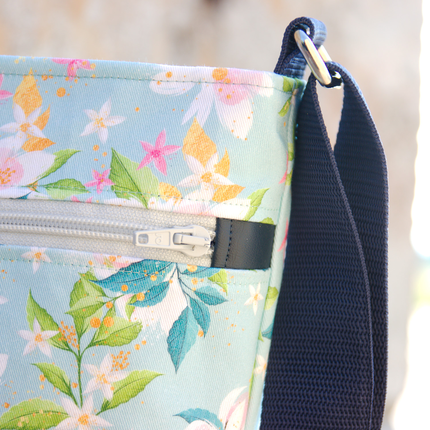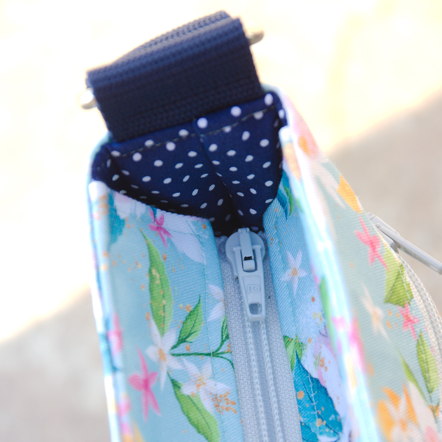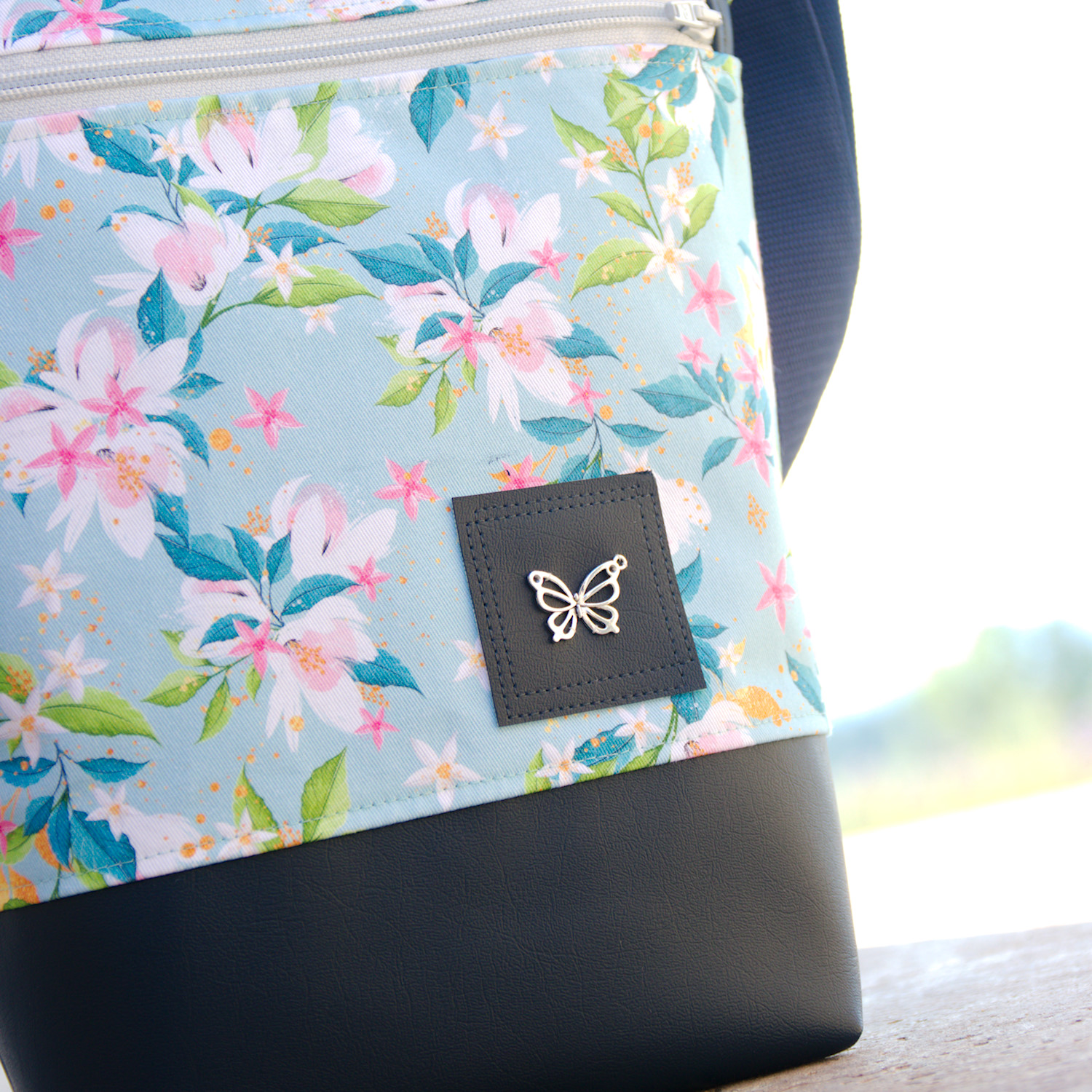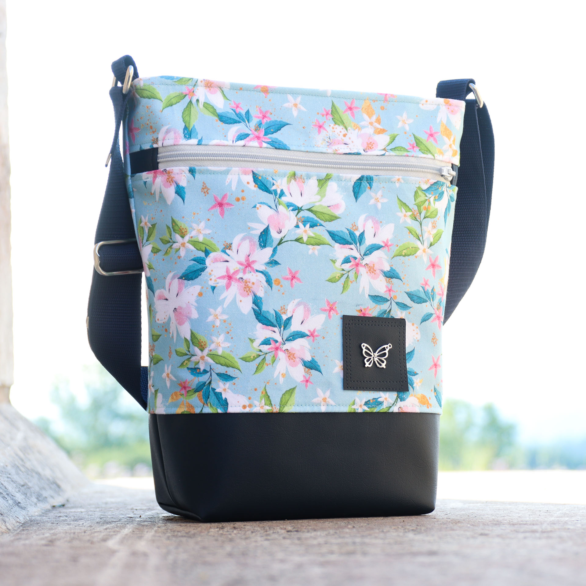 - Außen ein fester, hellblauer Canvas mit sommerlichem Blumen-Print