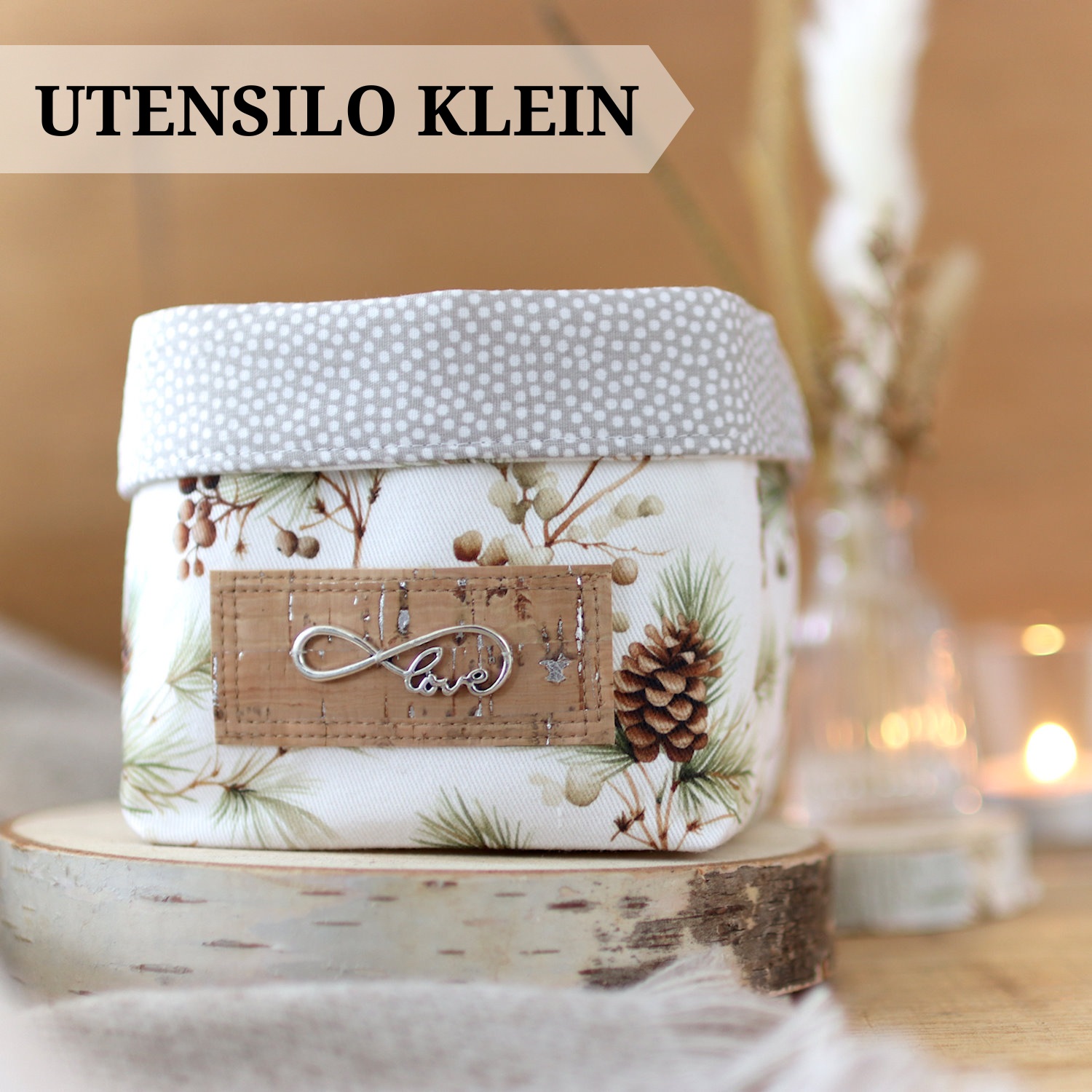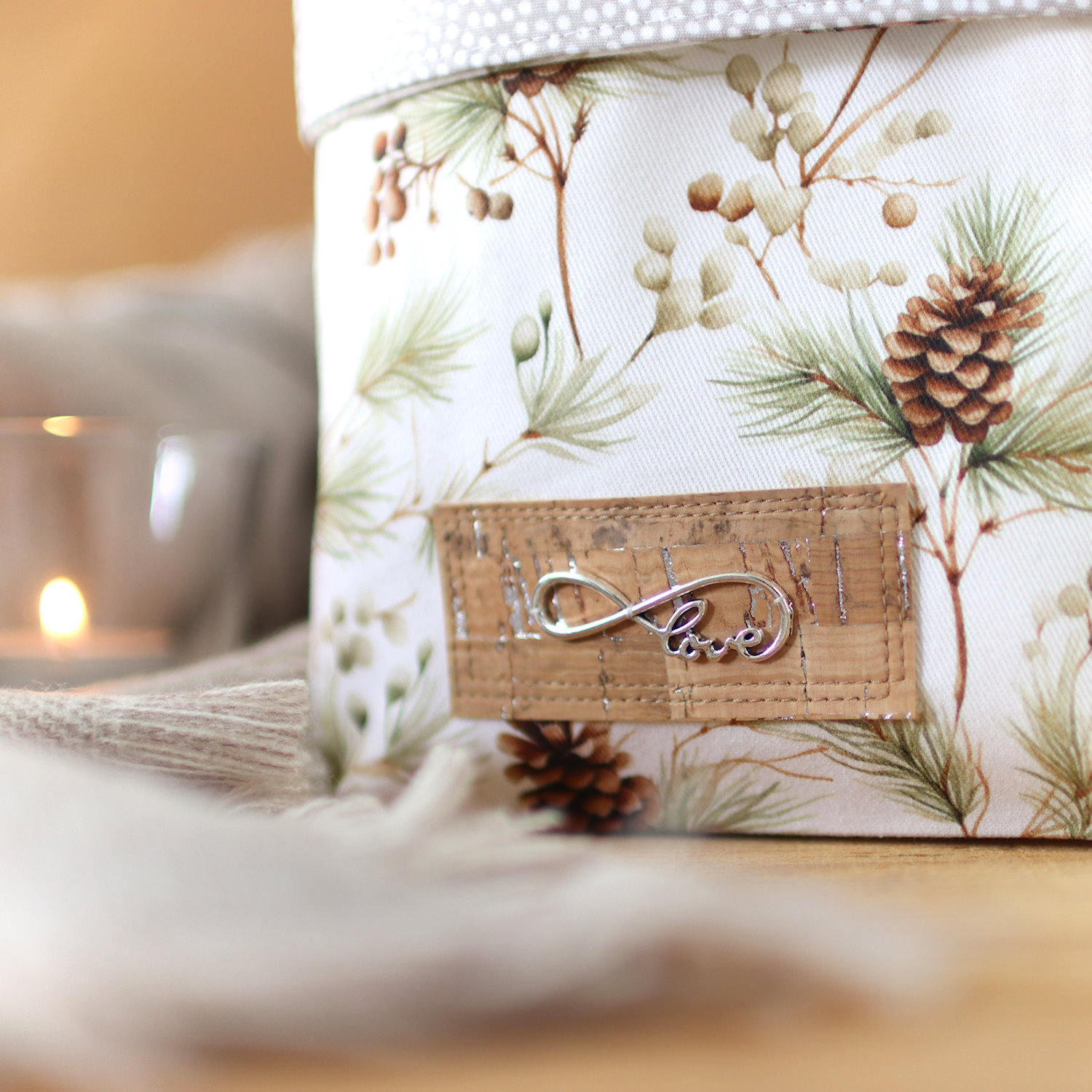 - Außen ein heller, fester Canvas mit Zweigen und Tannenzapfen in natürlichen Farben