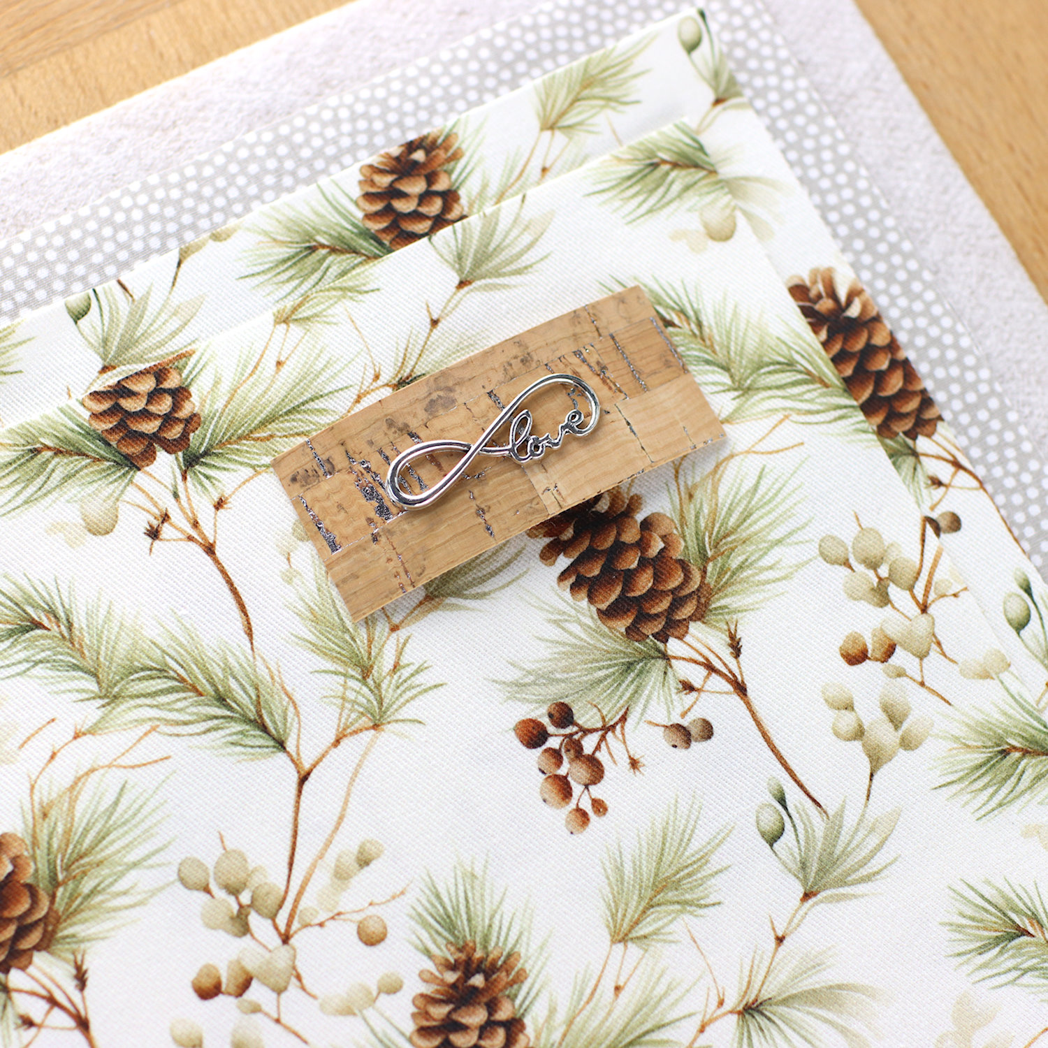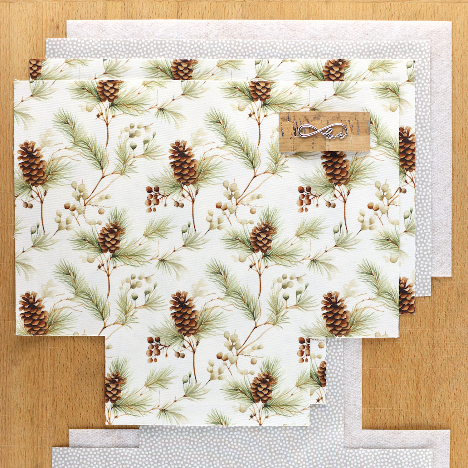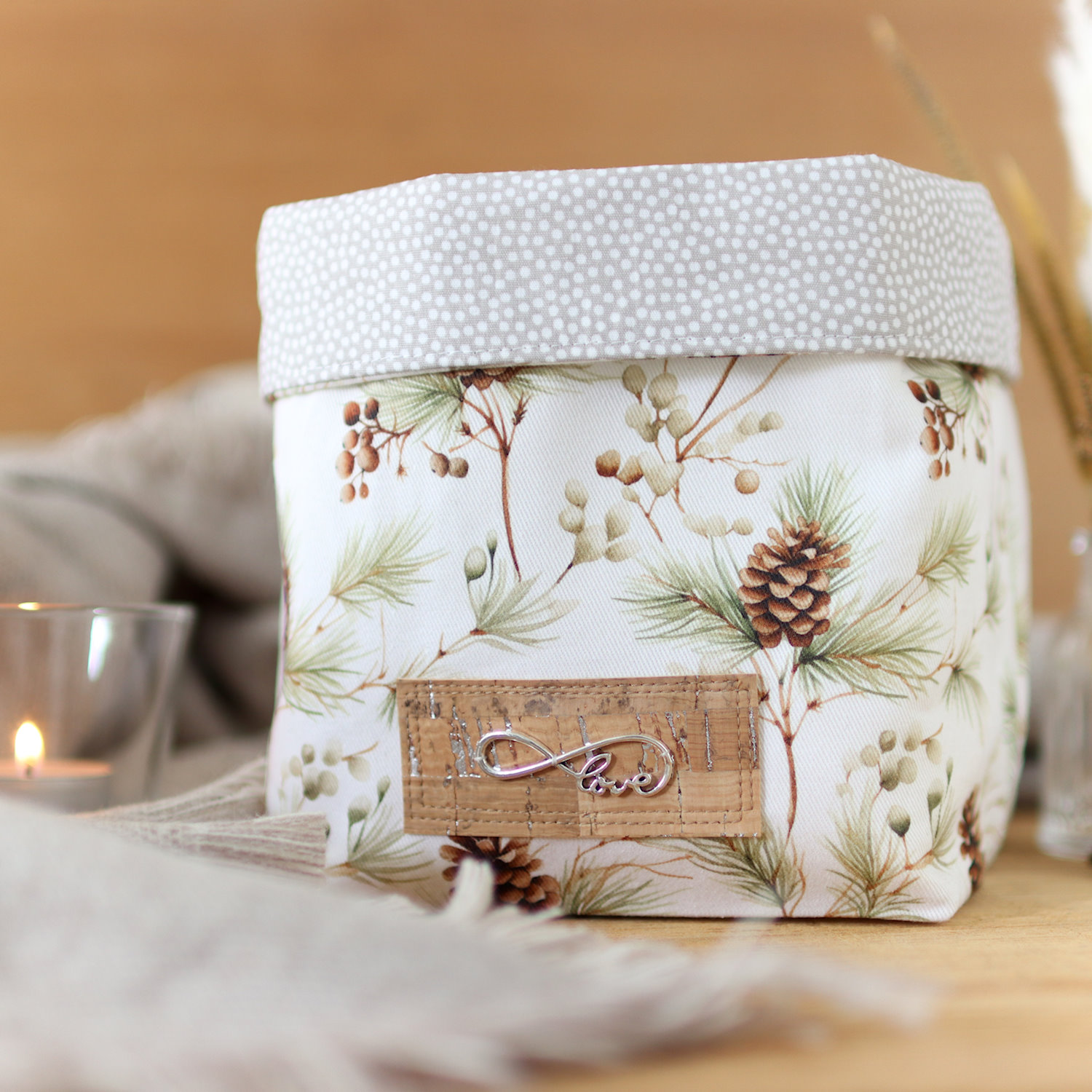 - Außen ein heller, fester Canvas mit Zweigen und Tannenzapfen in natürlichen Farben