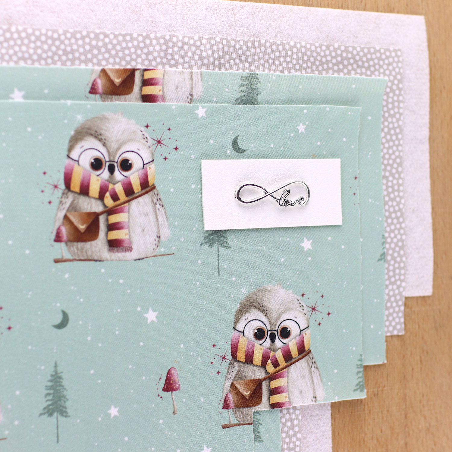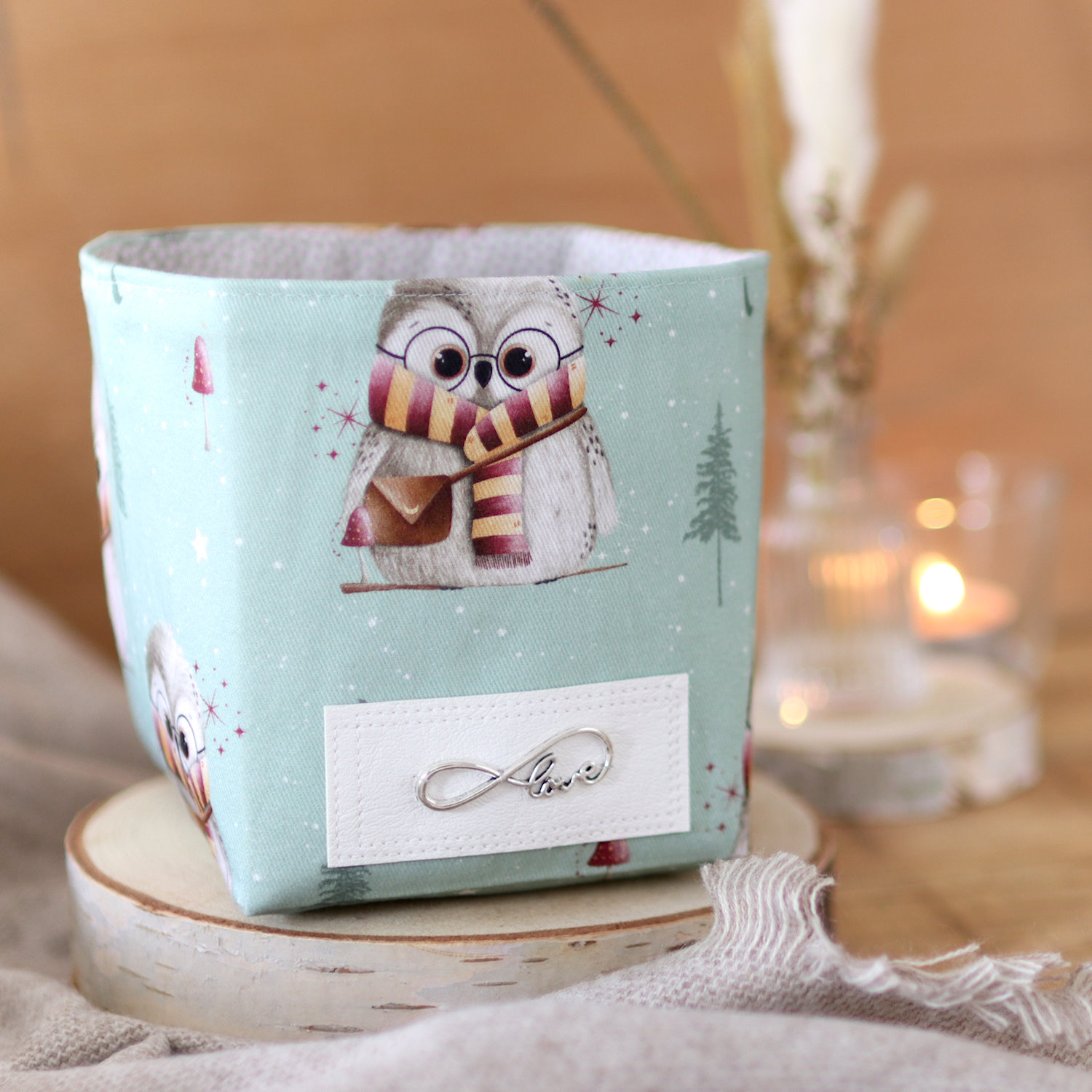 - Außen ein mintfarbener, fester Canvas mit süßen Eulen