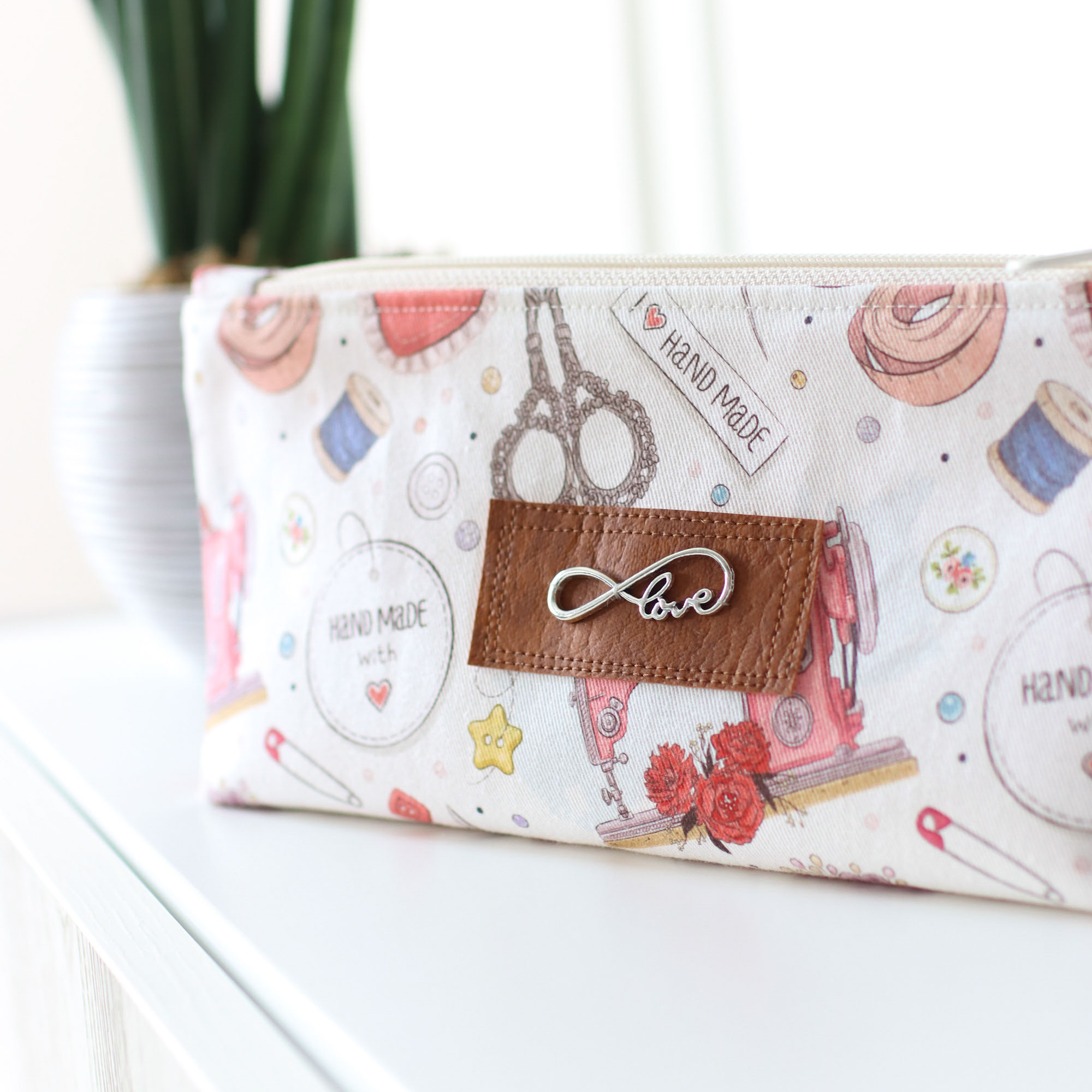 - Außen ein entzückender Canvas mit Handmade-Motiven und Nähzubehör