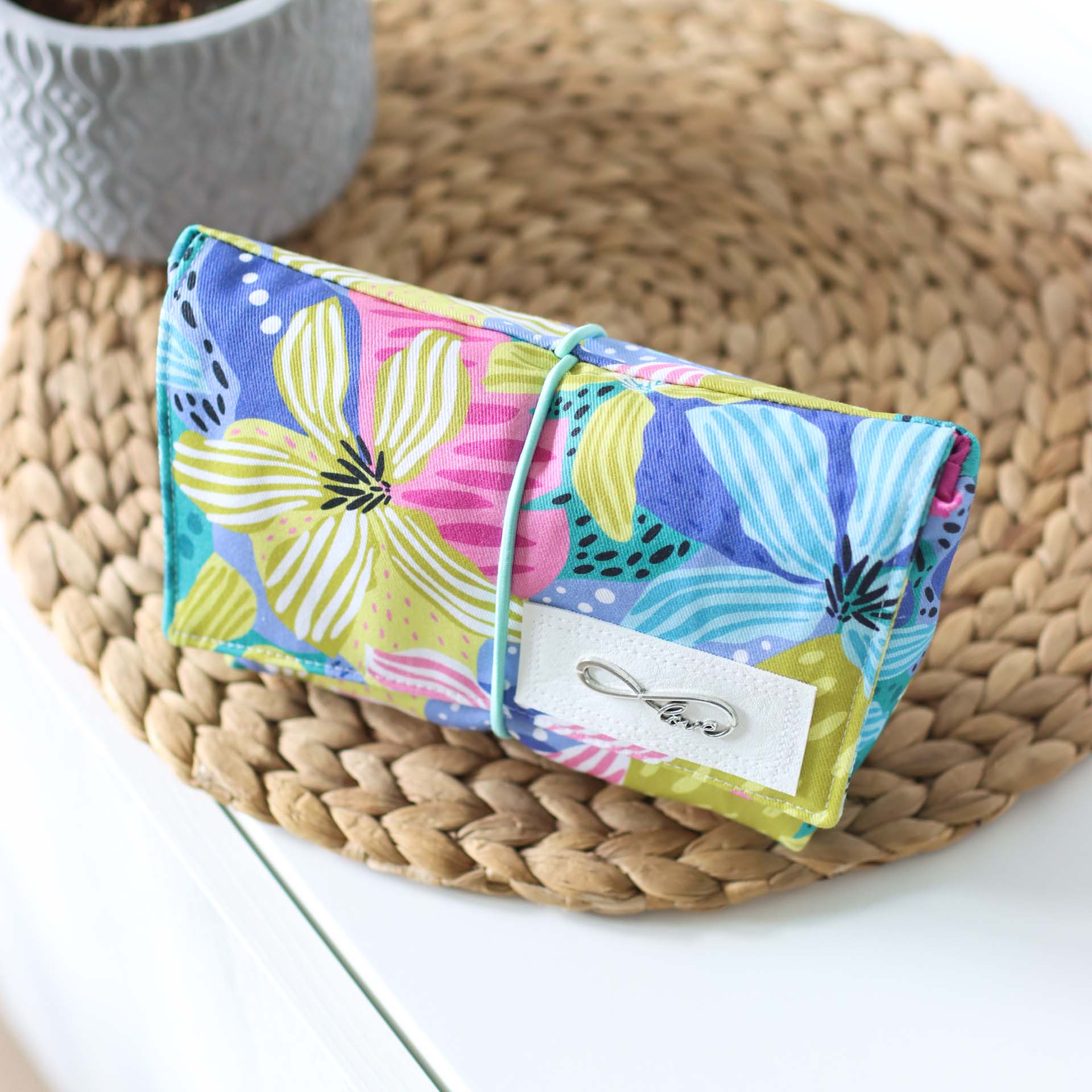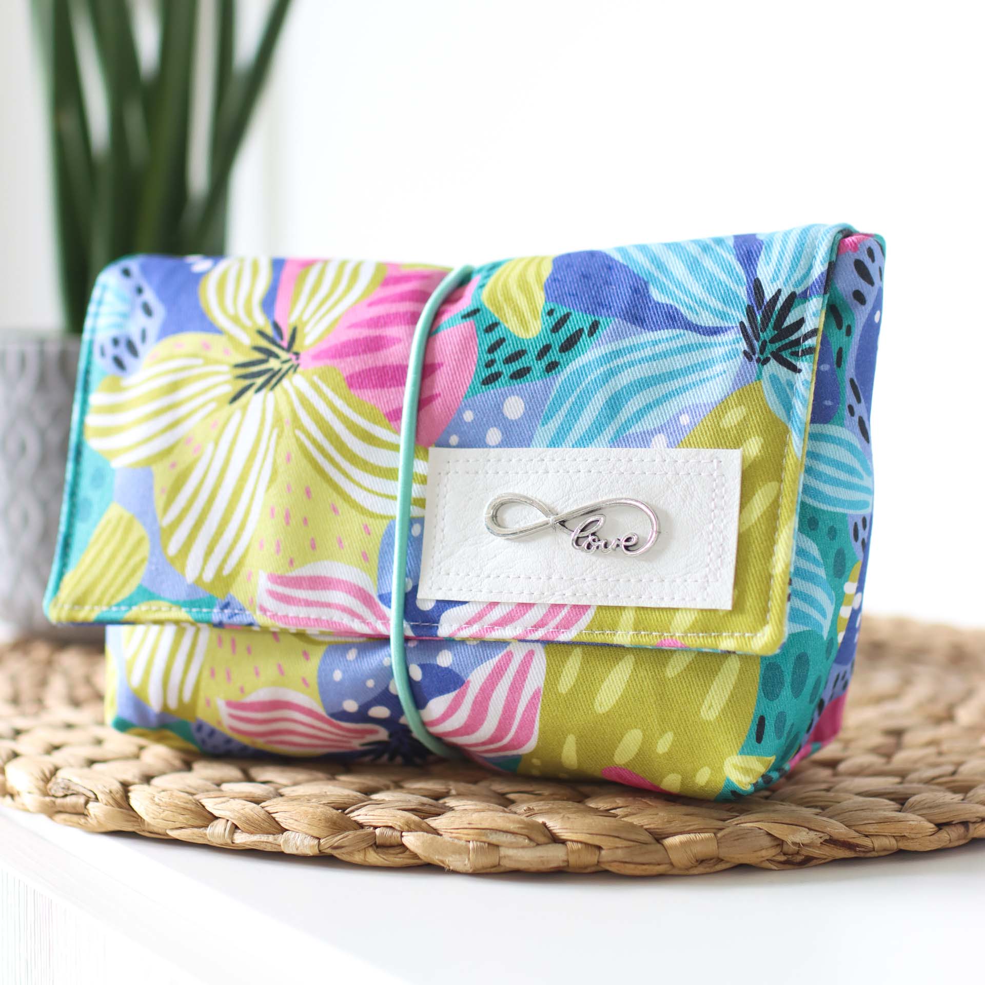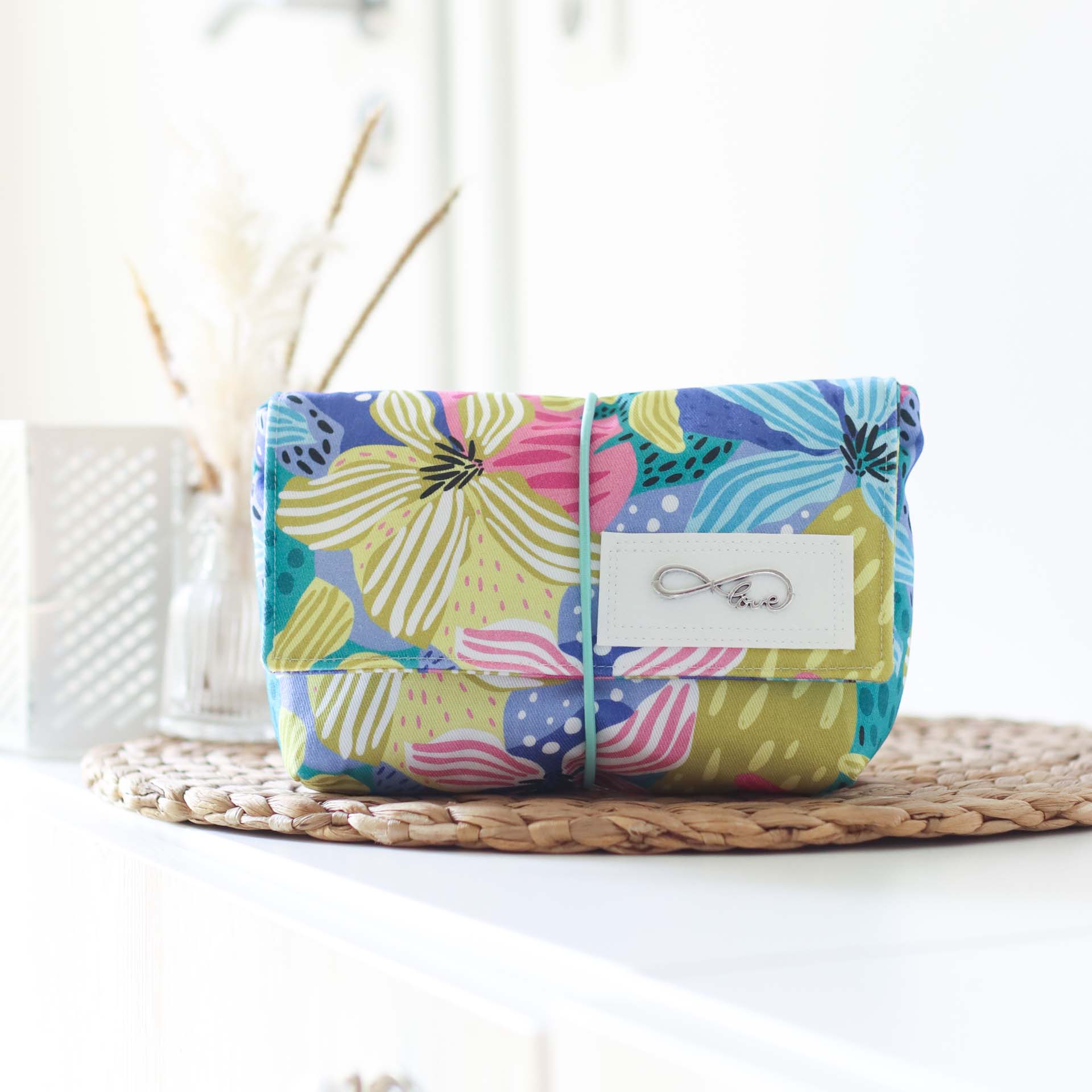 Mit ihrer praktischen Größe von 16cm Breite, 7cm Tiefe und 12cm Höhe passt sie in jede Handtasche. Die Klappe sorgt dafür, dass an seinem Platz bleibt und wird mit dem eingenähten Gummiband fixiert.