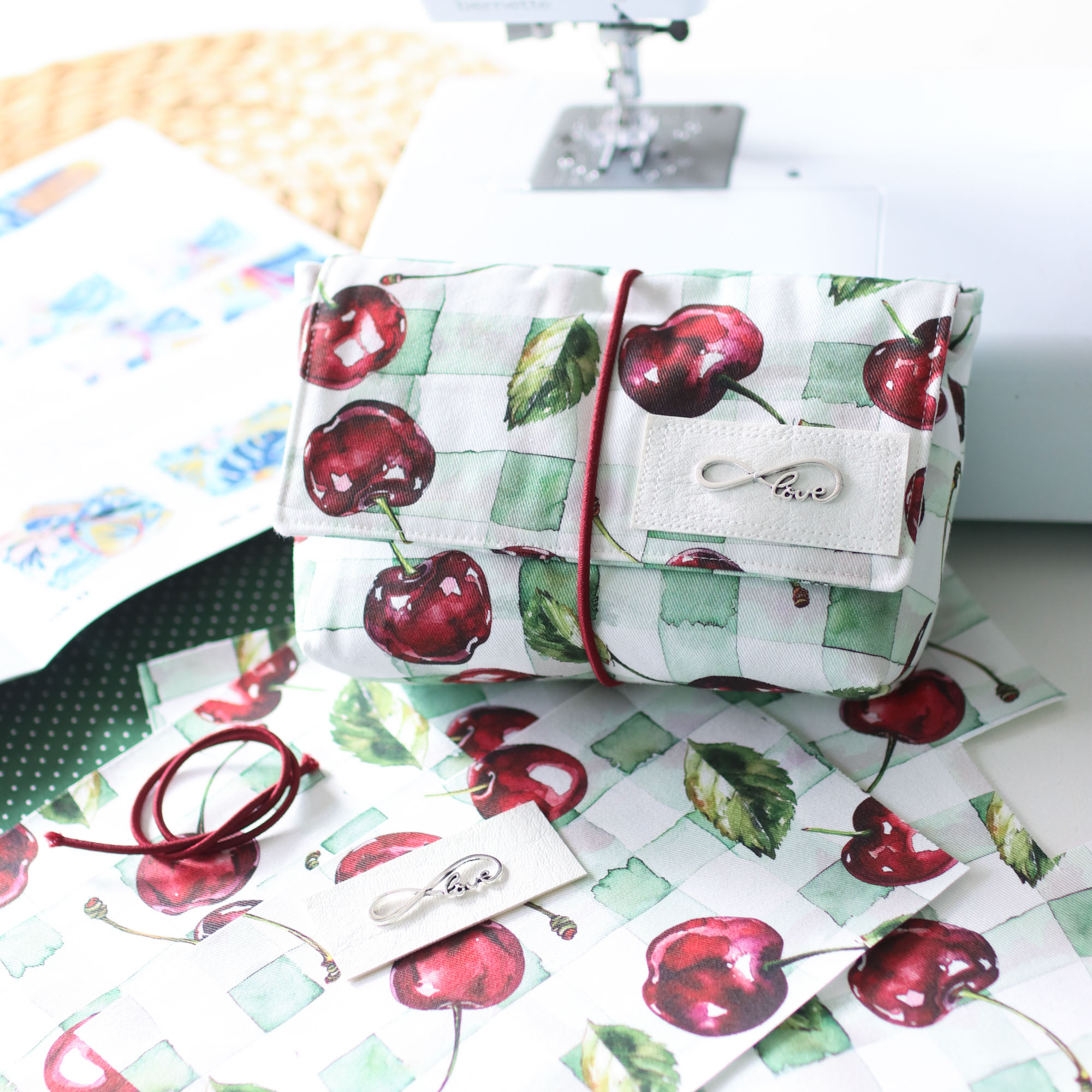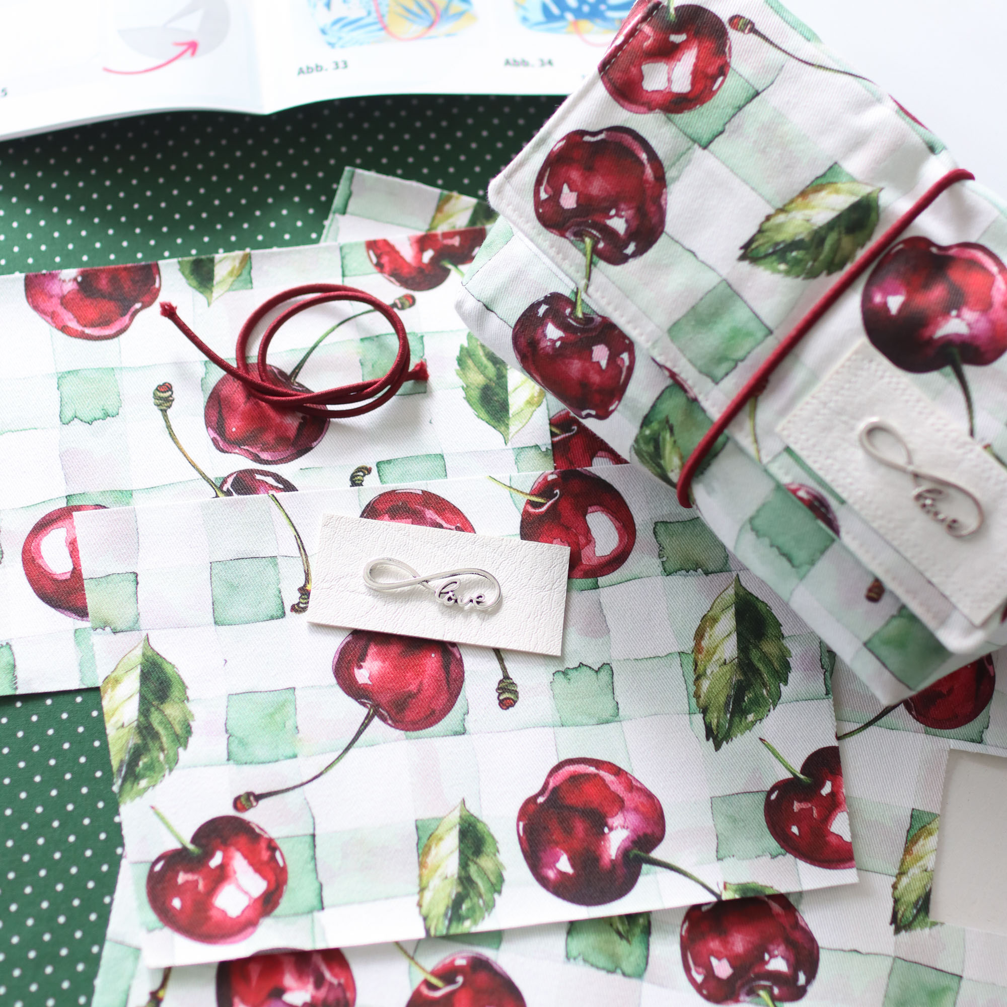 - Außen ein heller Canvas mit Kirschen und Vichy-Karo in zartem Grün