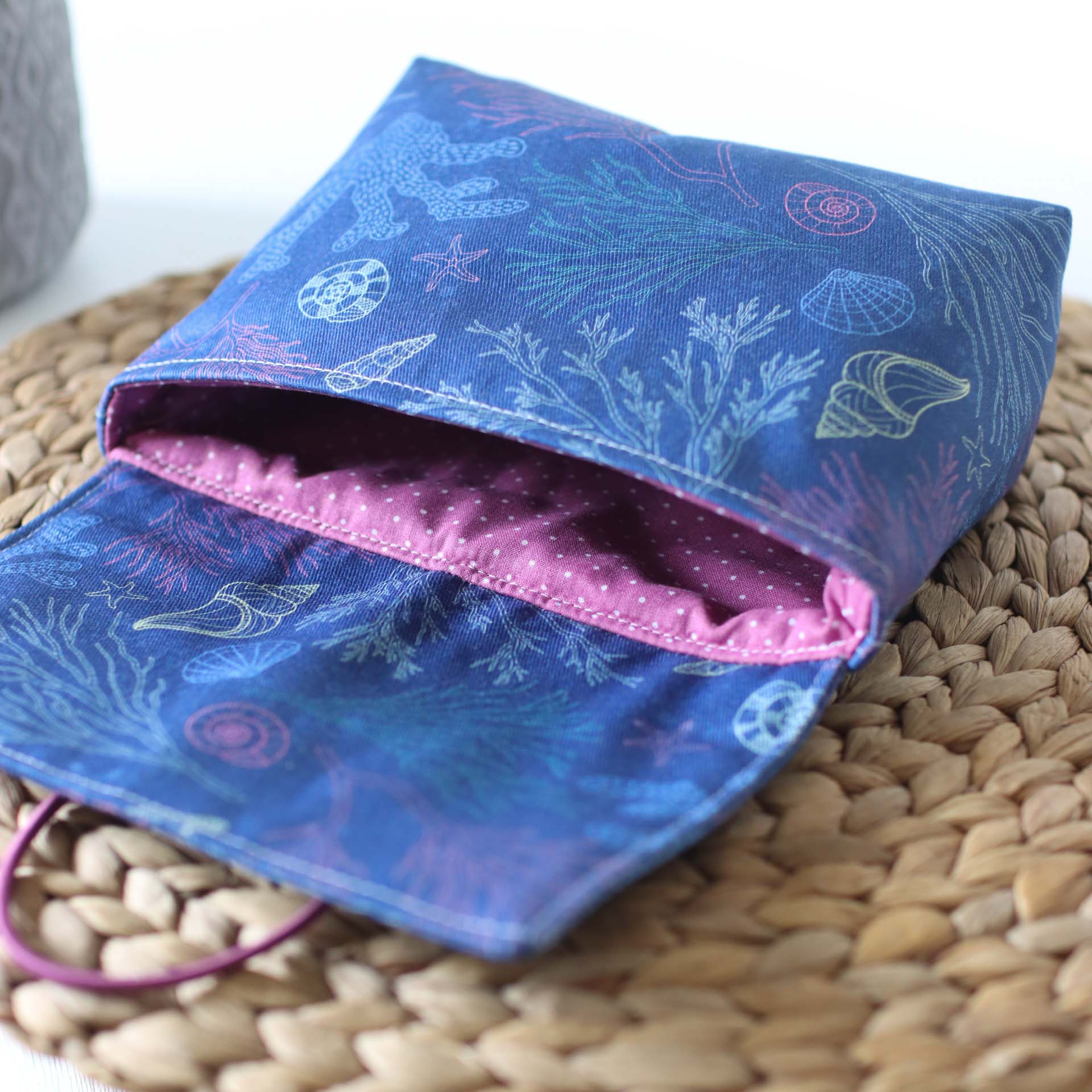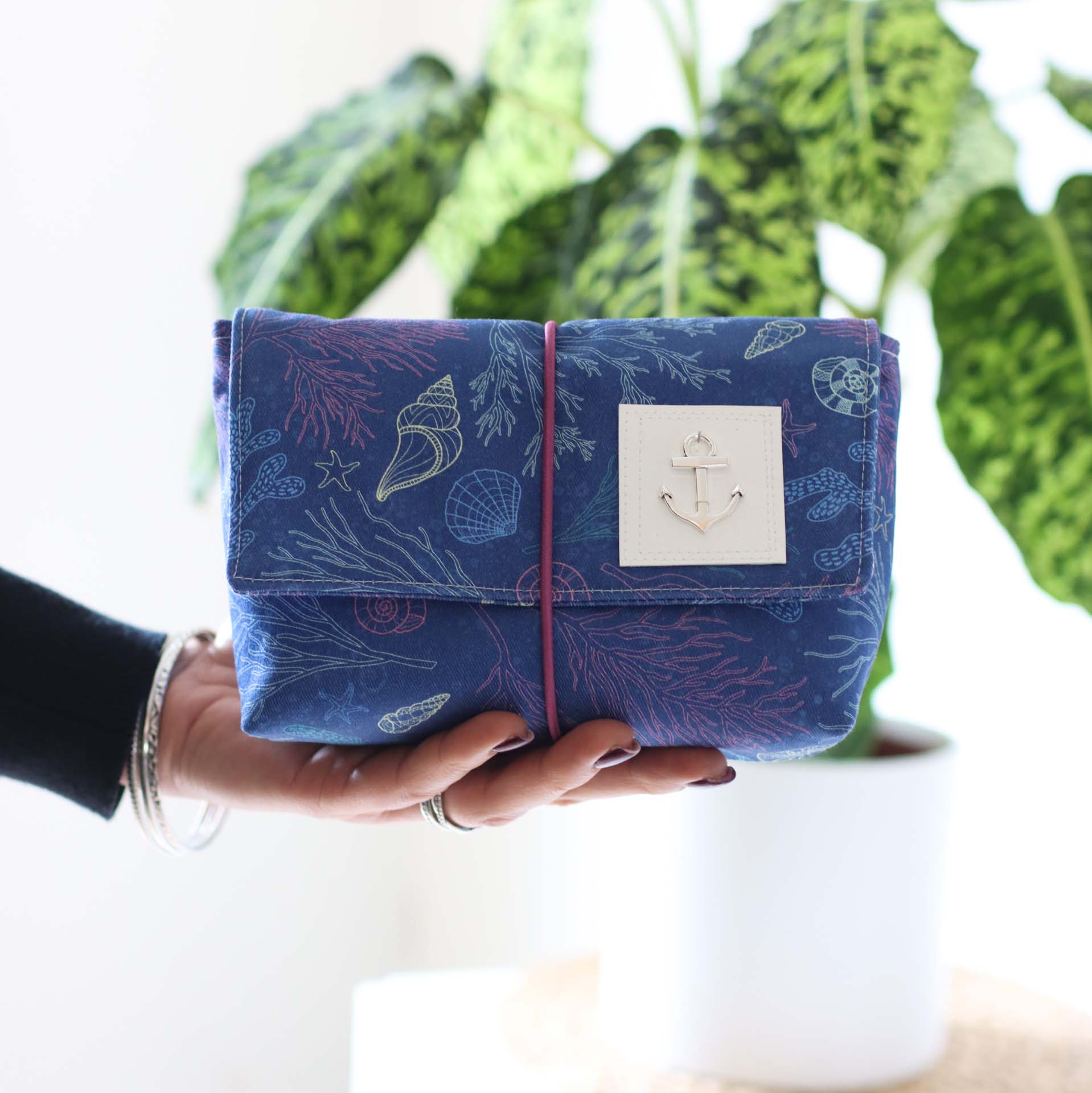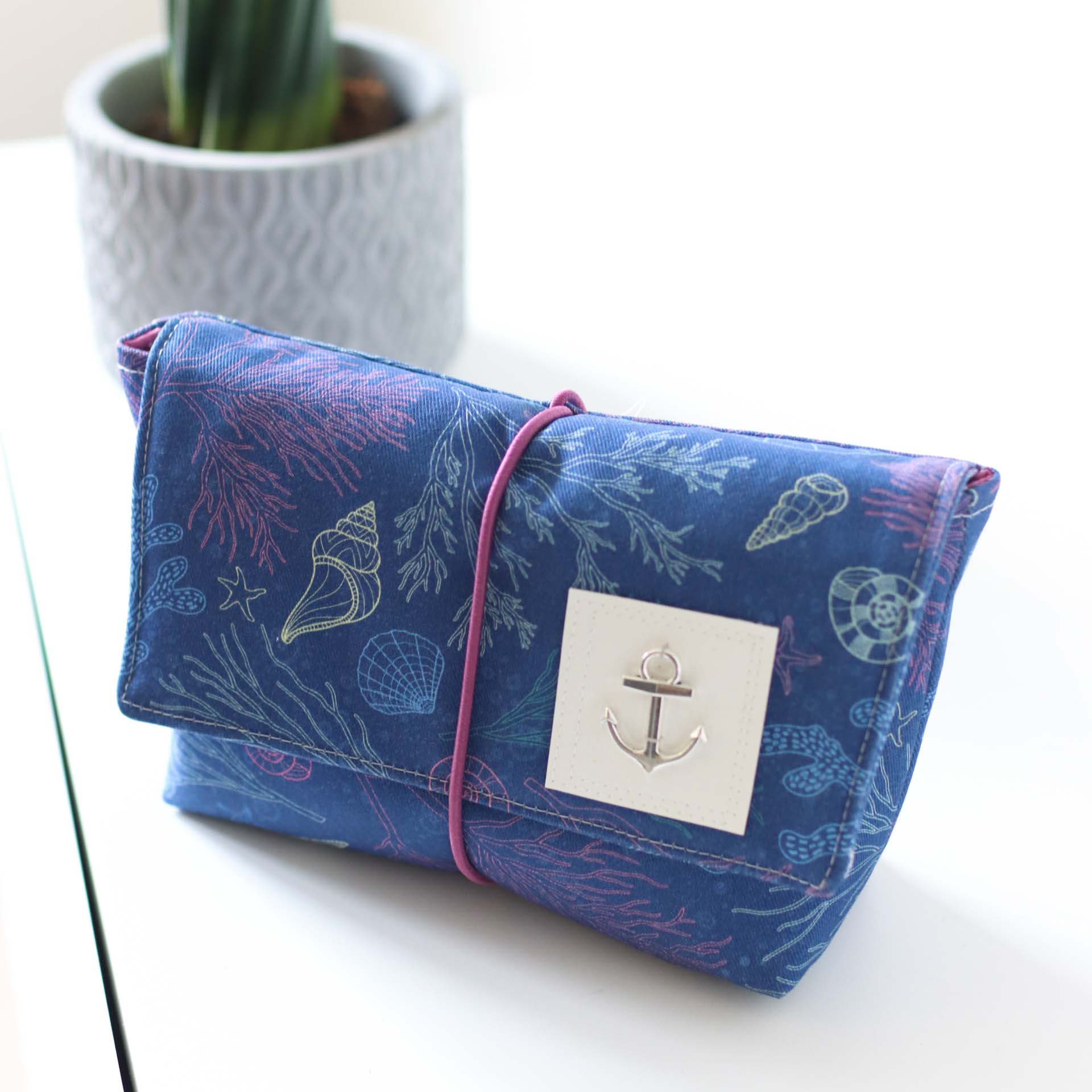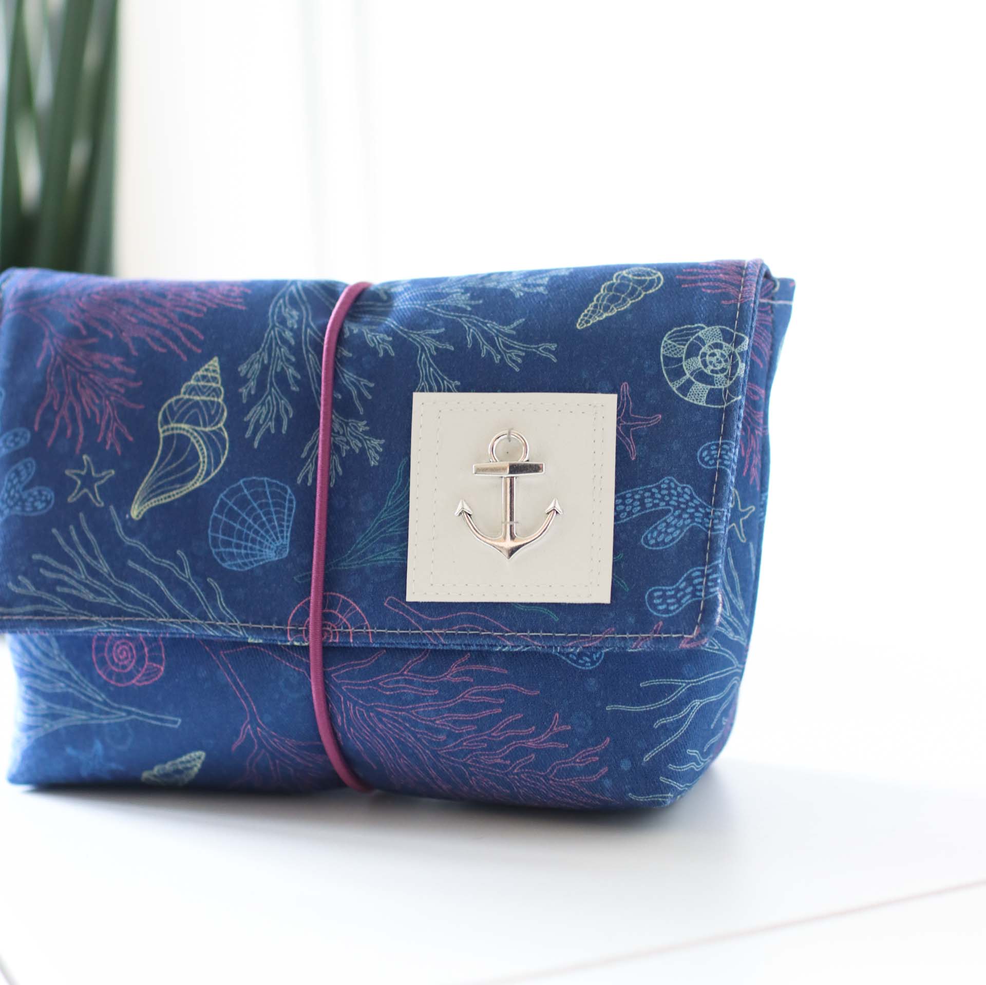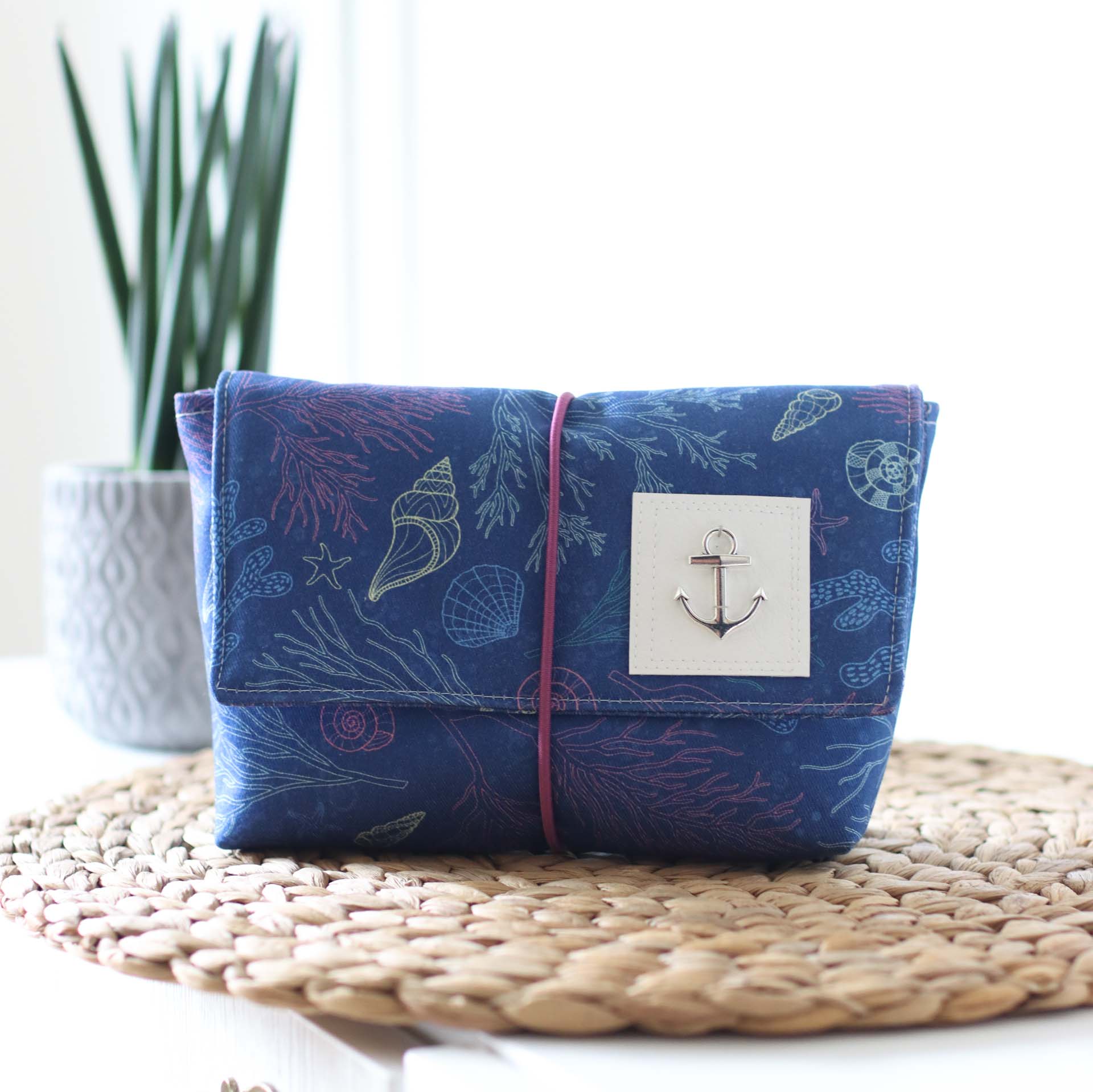 Mit ihrer praktischen Größe von 16cm Breite, 7cm Tiefe und 12cm Höhe passt sie in jede Handtasche. Die Klappe sorgt dafür, dass an seinem Platz bleibt und wird mit dem eingenähten Gummiband fixiert.