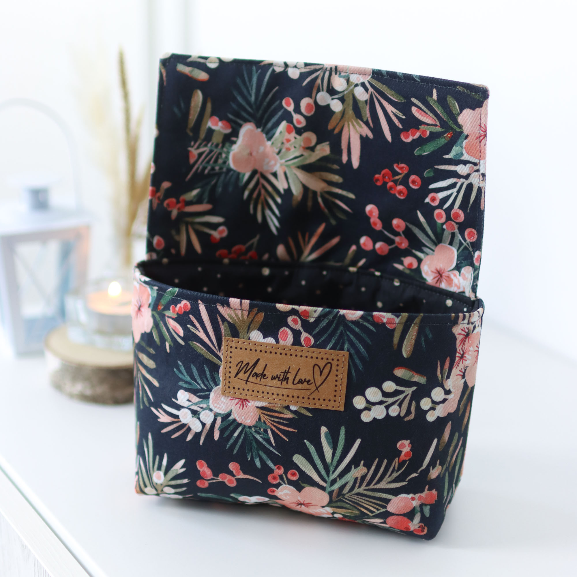 - Außen ein dunkelblauer, fester Canvas mit Winterblumen
