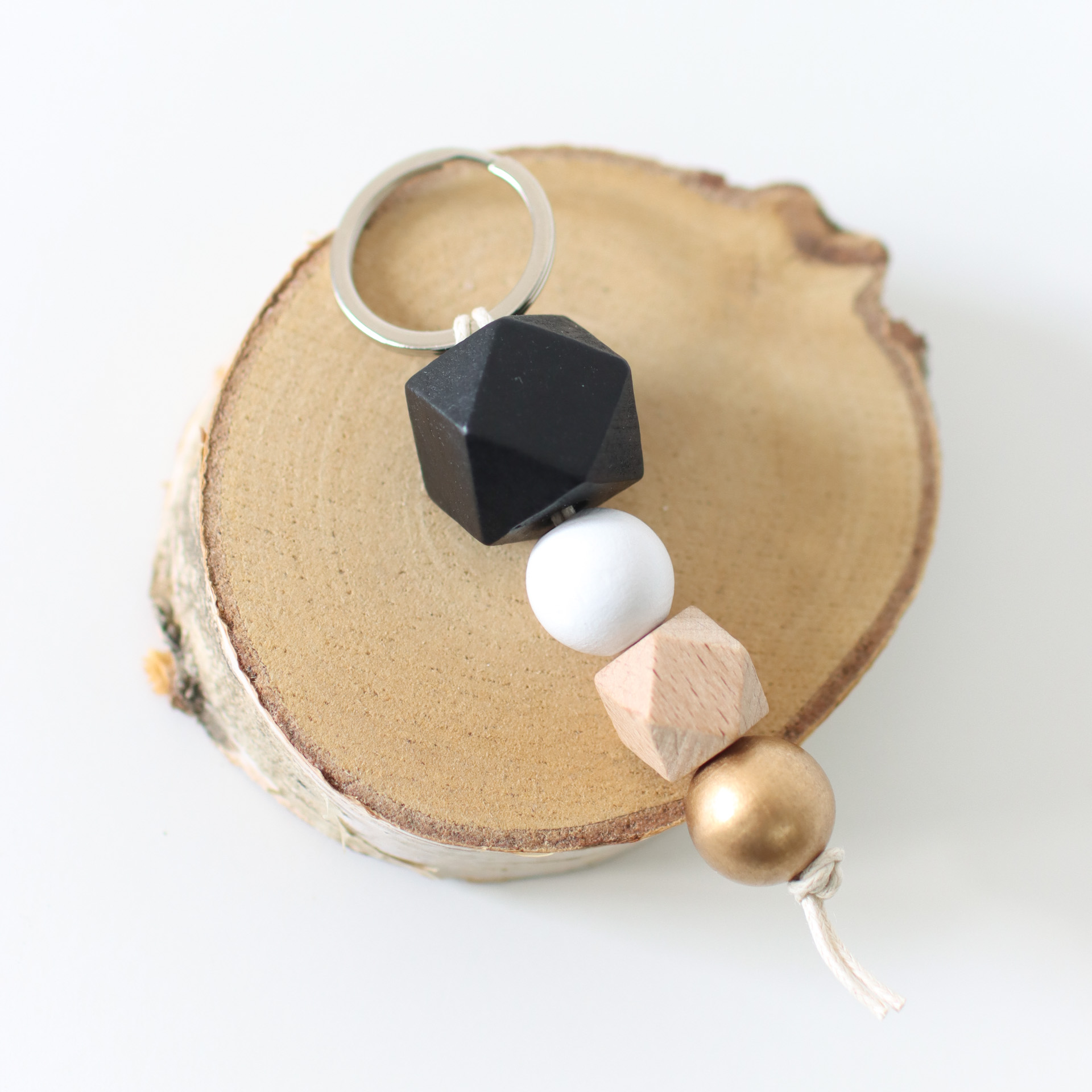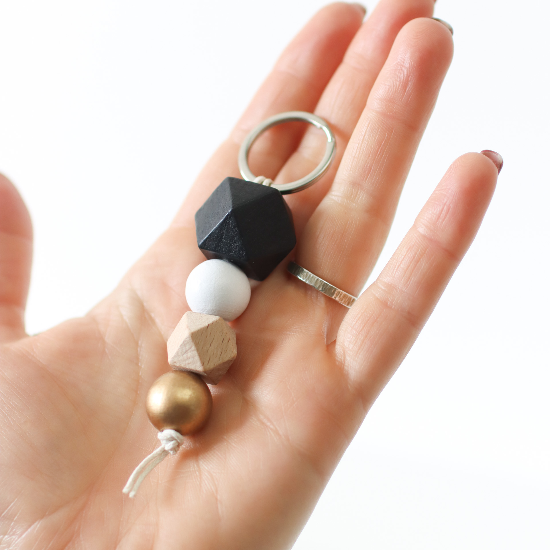 Schicker Schlüsselanhänger aus verschiedenen Holzperlen, den du beispielsweise an Reißverschlüssen befestigen, um deine Taschen und Accessoires aufzupeppen.